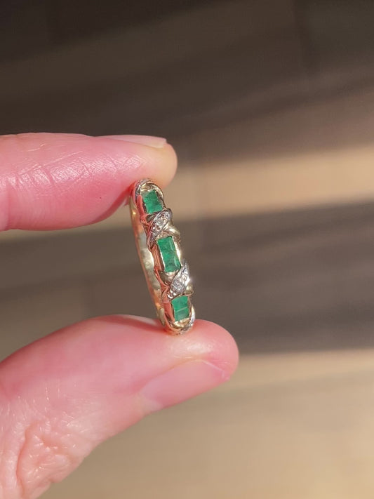 Vintage 9ct Gold Emerald + Diamond Ring
