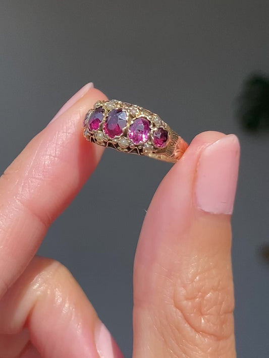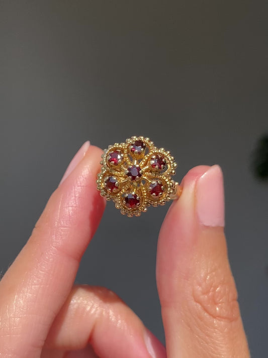 Vintage 9ct Gold Ornate Garnet Flower Ring
