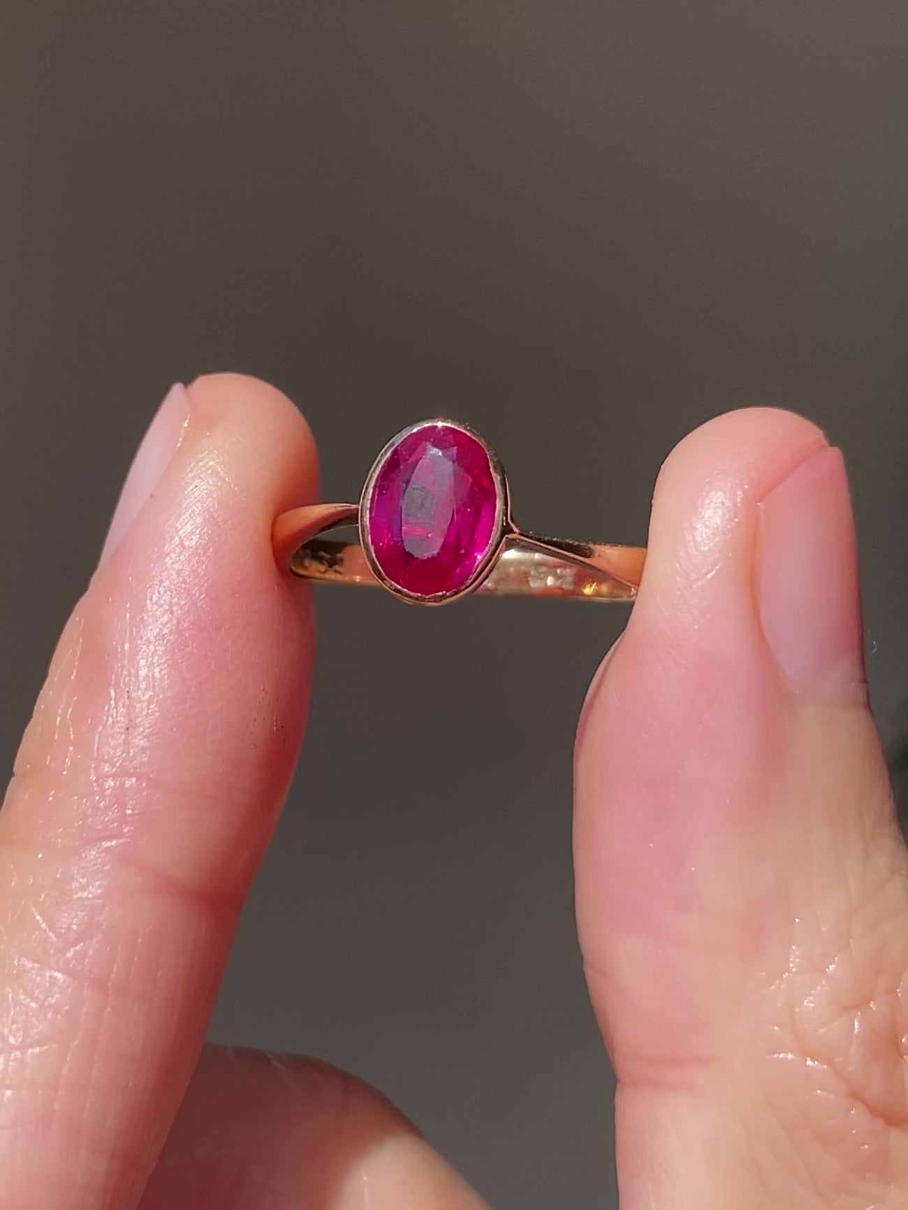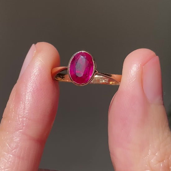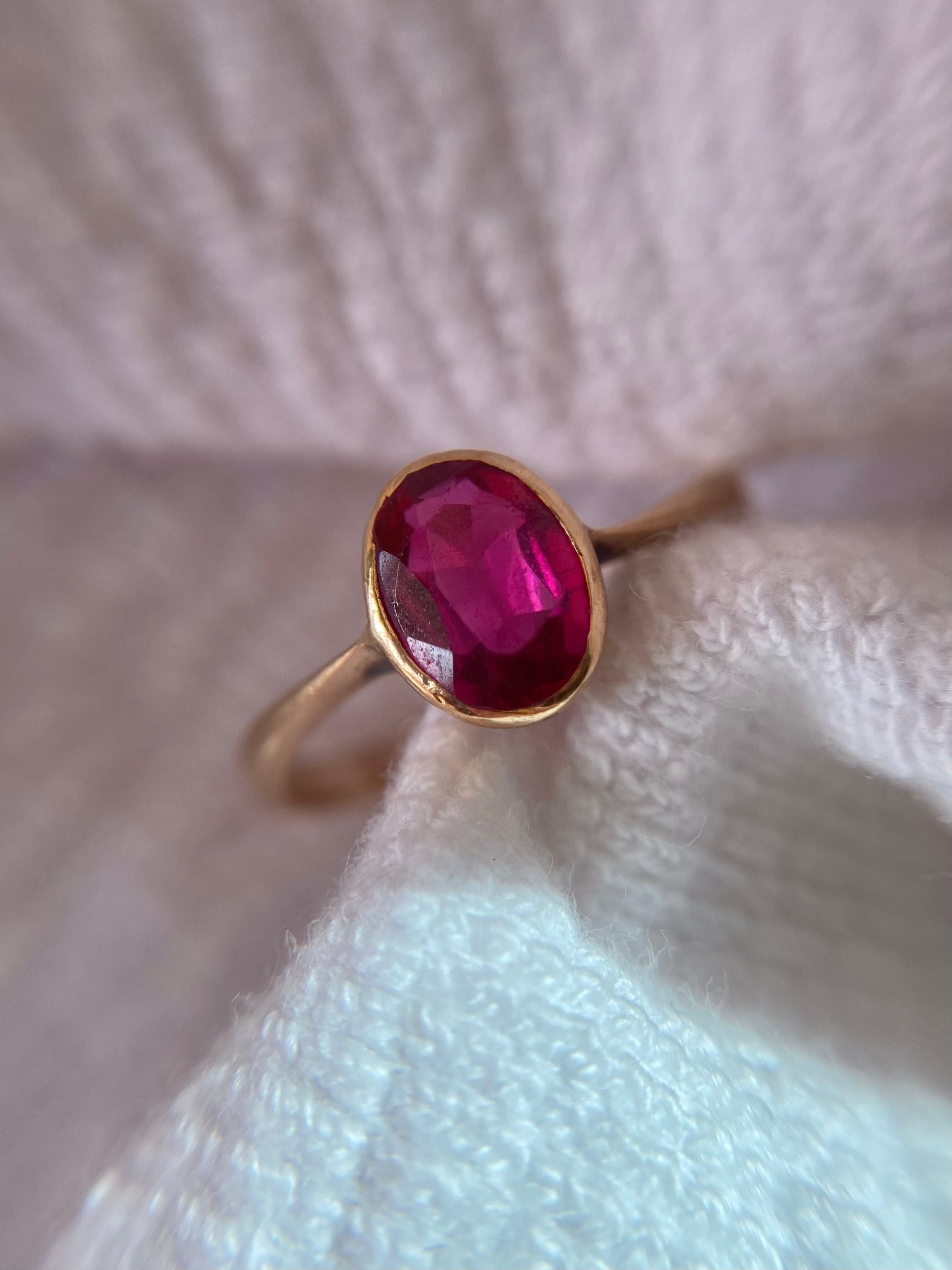 A pretty vintage solid 9ct gold ruby ring. The ruby is set in a slightly rosey gold setting.