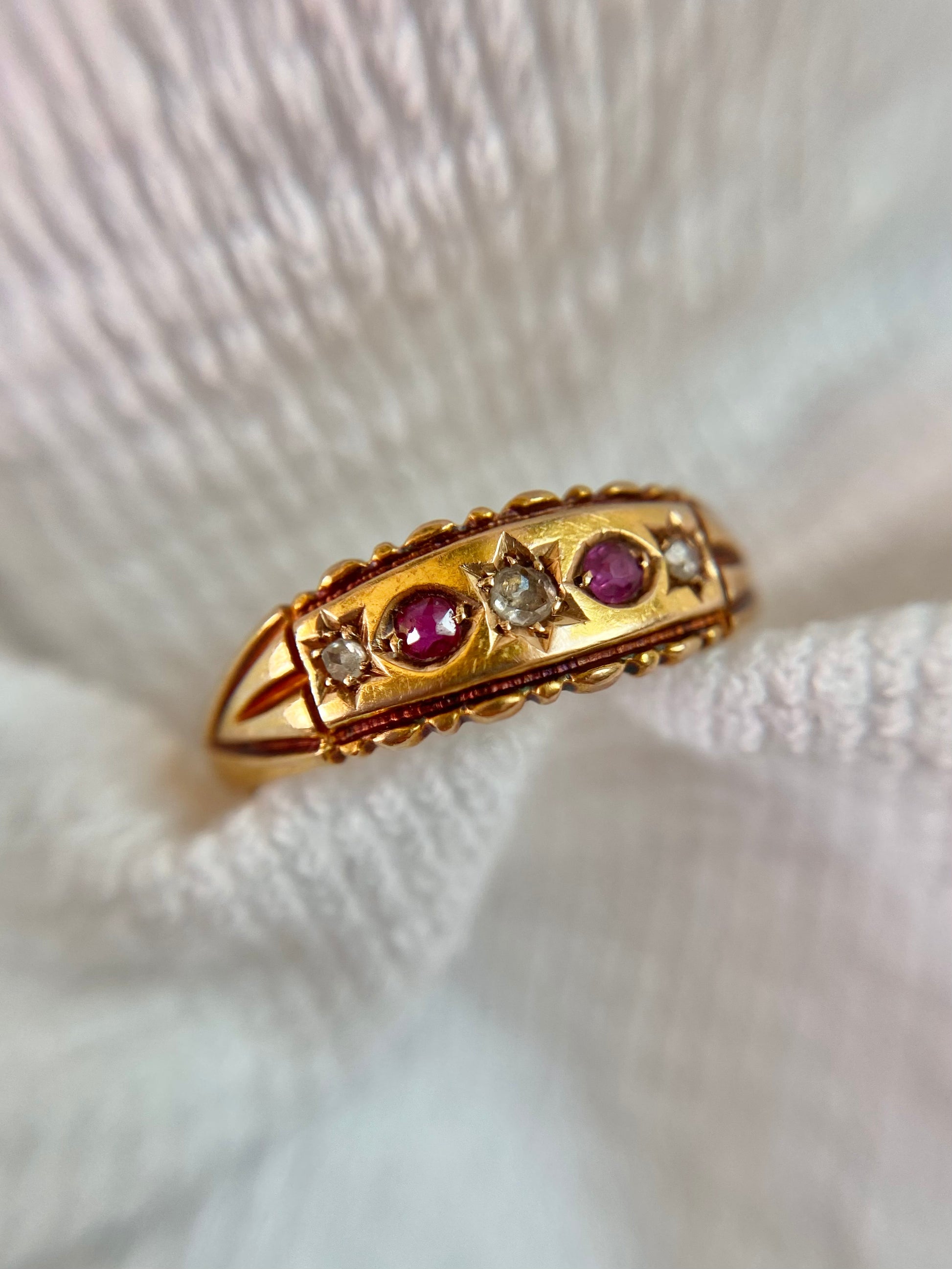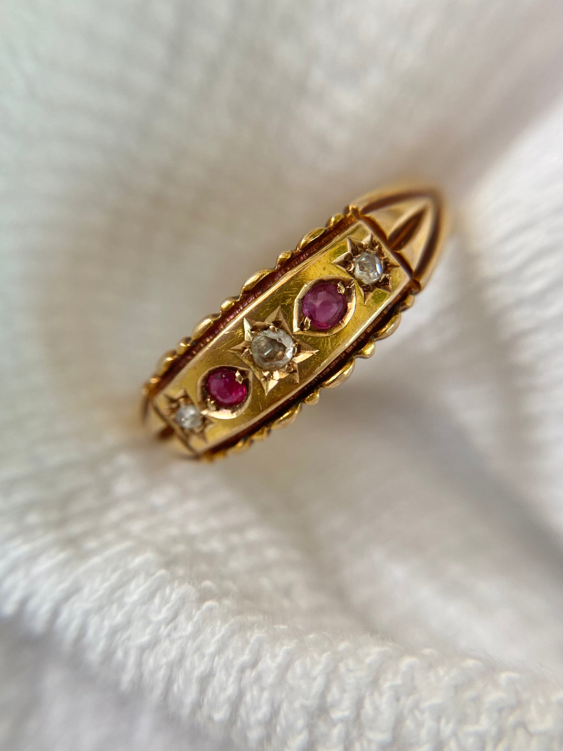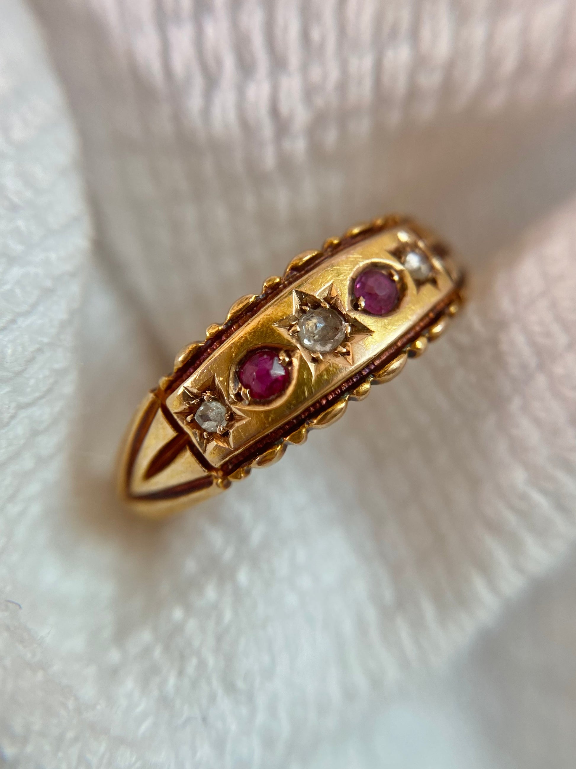 A gorgeous antique 15ct gold ring with diamonds and rubies. This antique ring is 128 years old. A beautiful piece of history to wear.