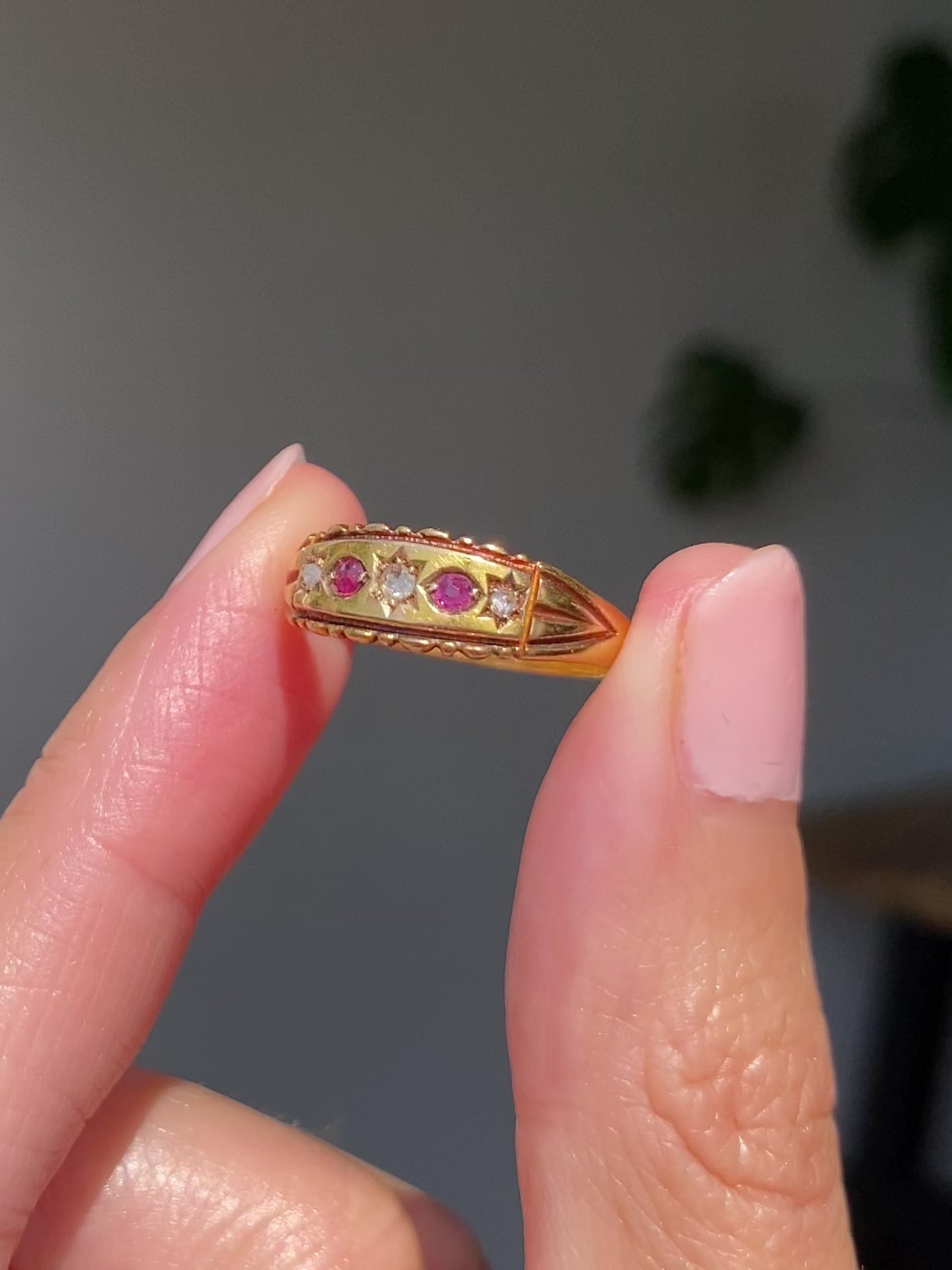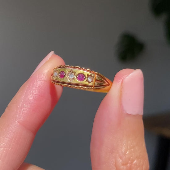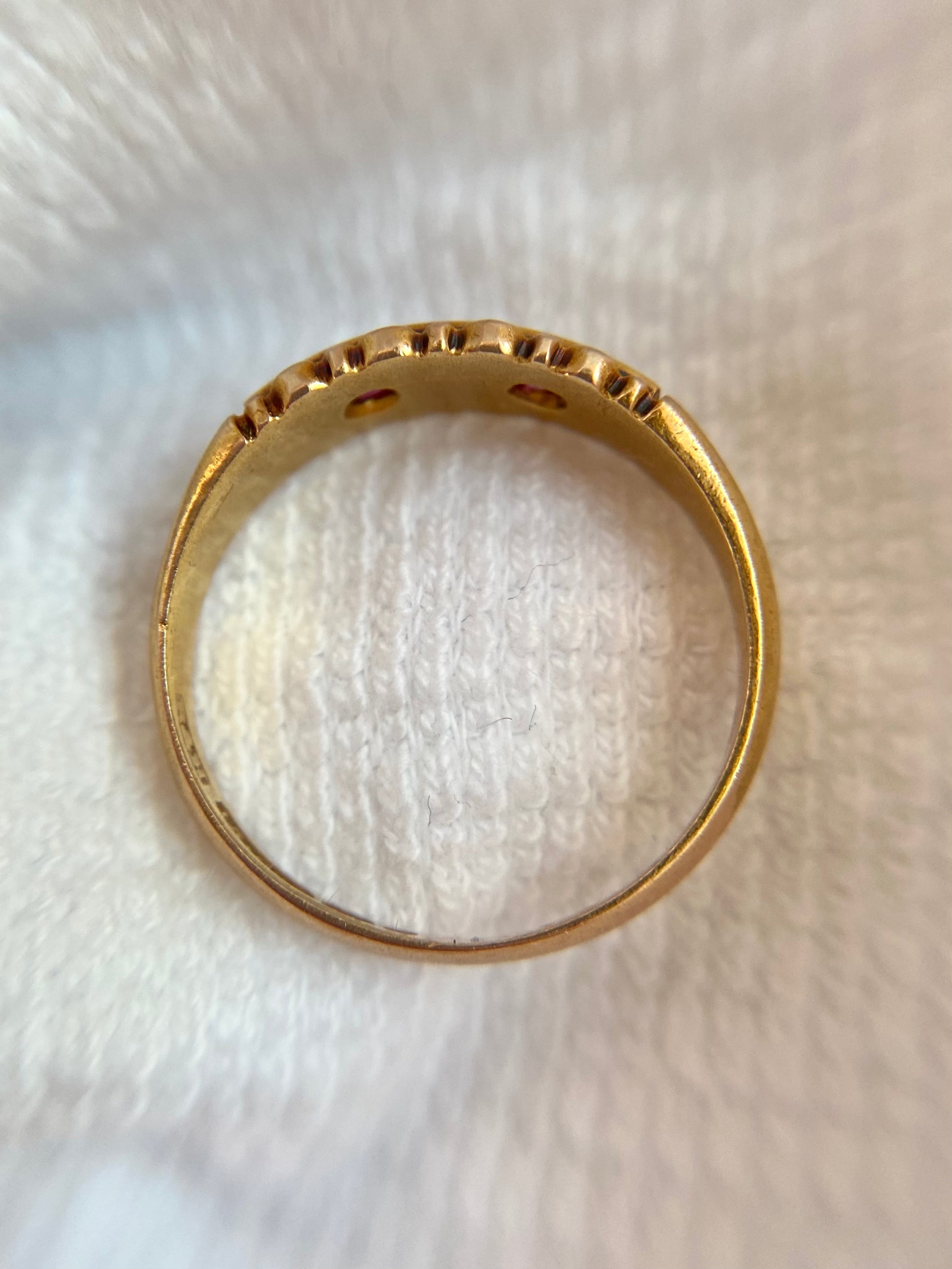 A gorgeous antique 15ct gold ring with diamonds and rubies. This antique ring is 128 years old. A beautiful piece of history to wear.