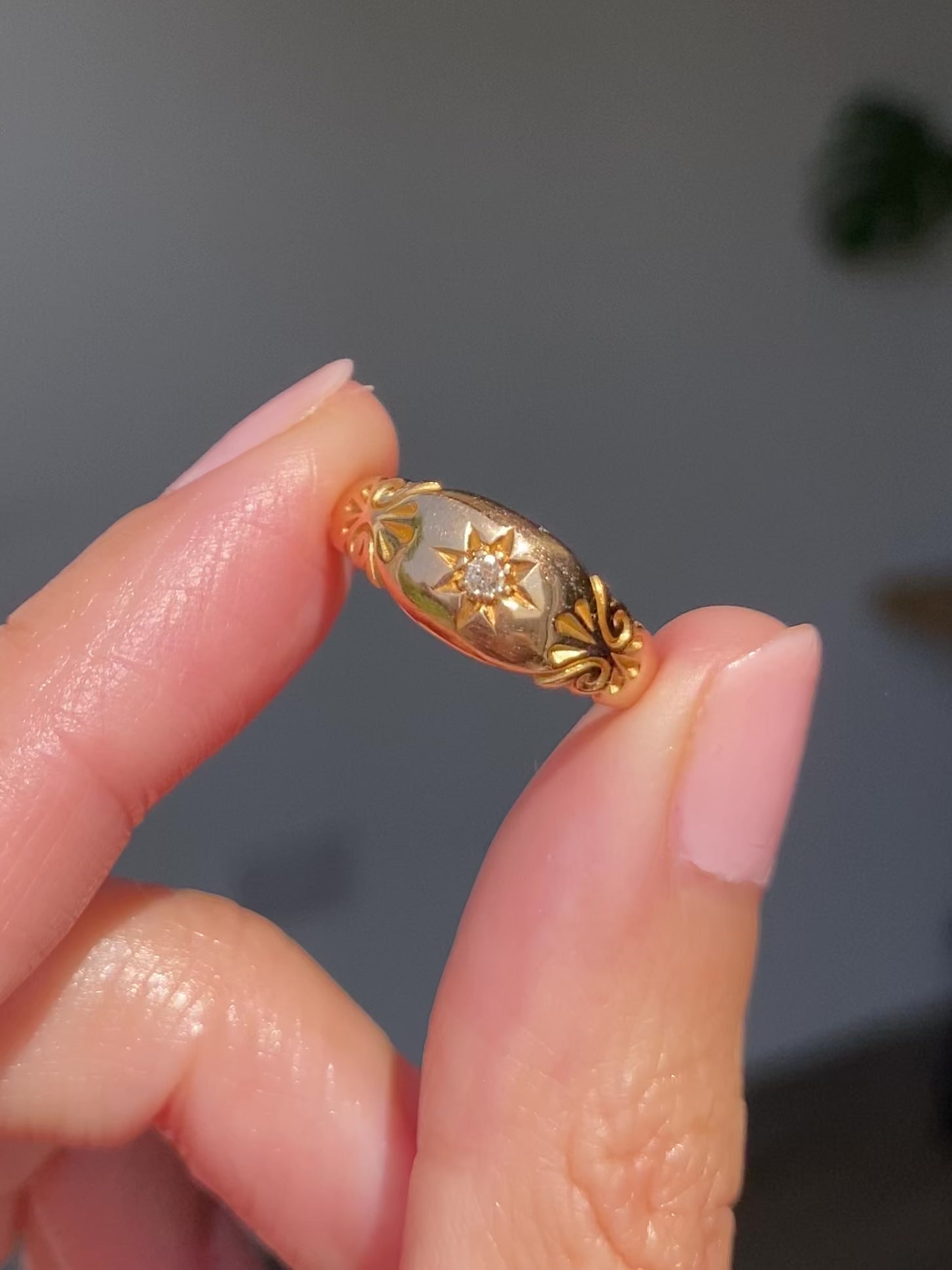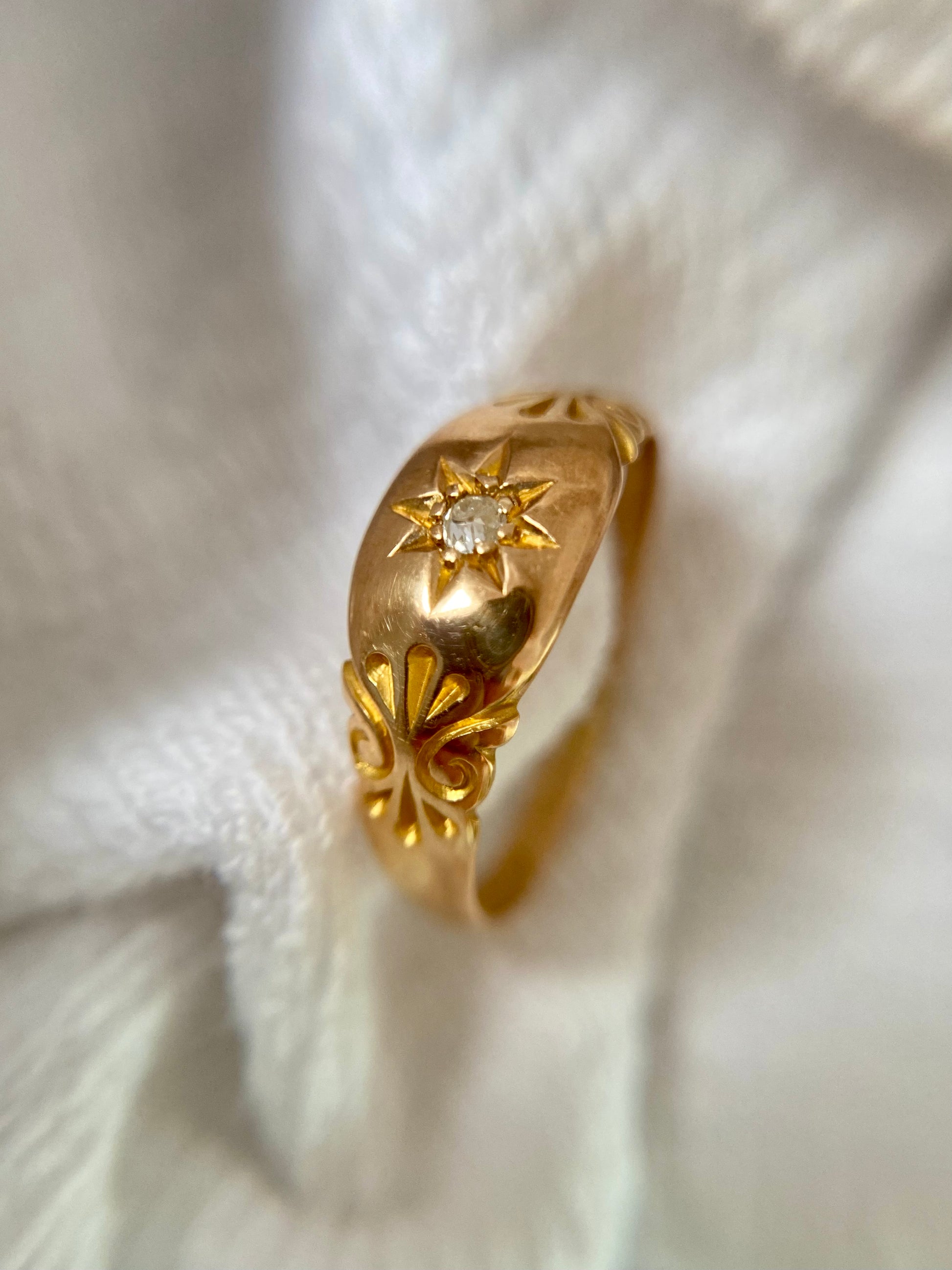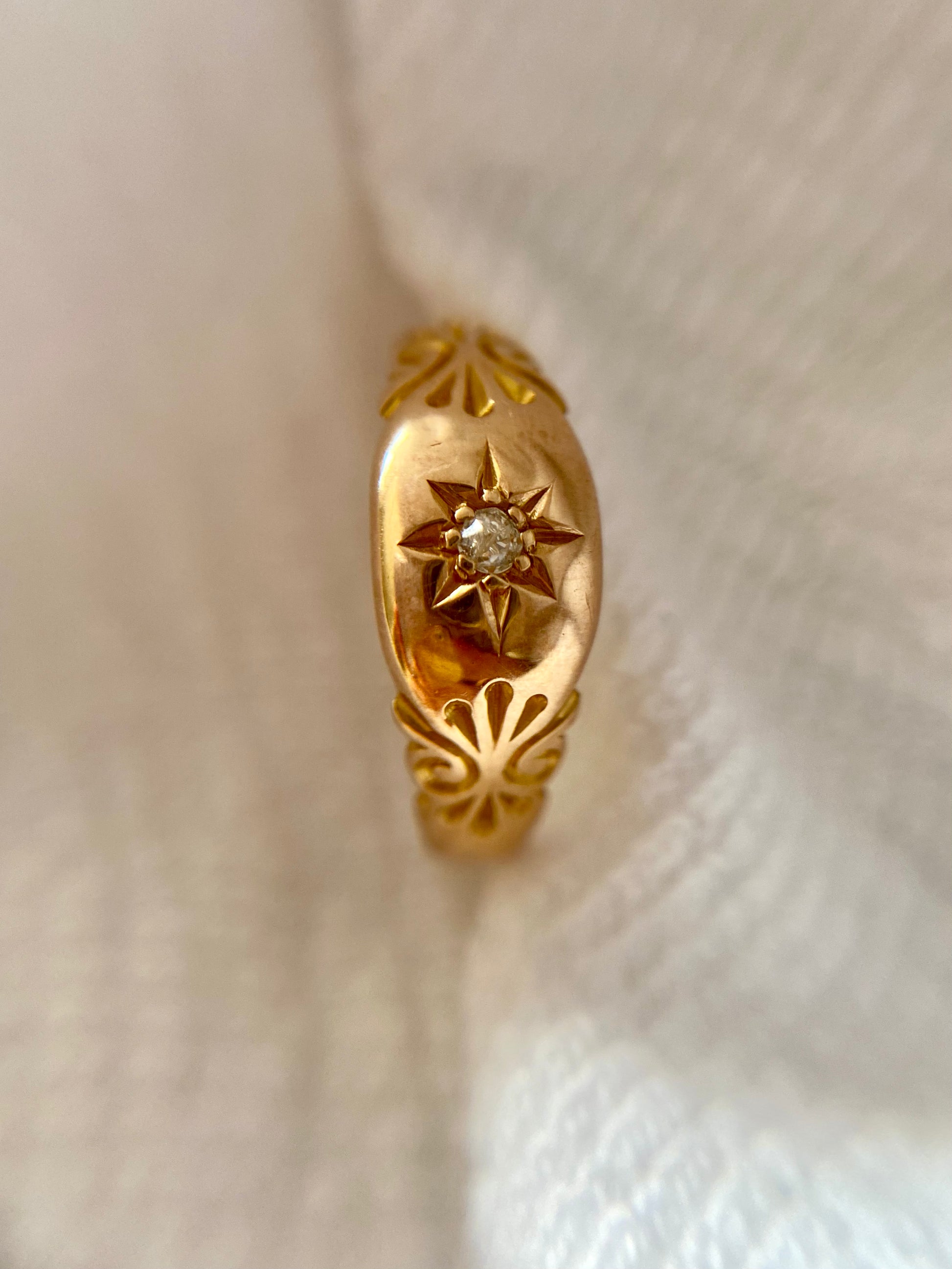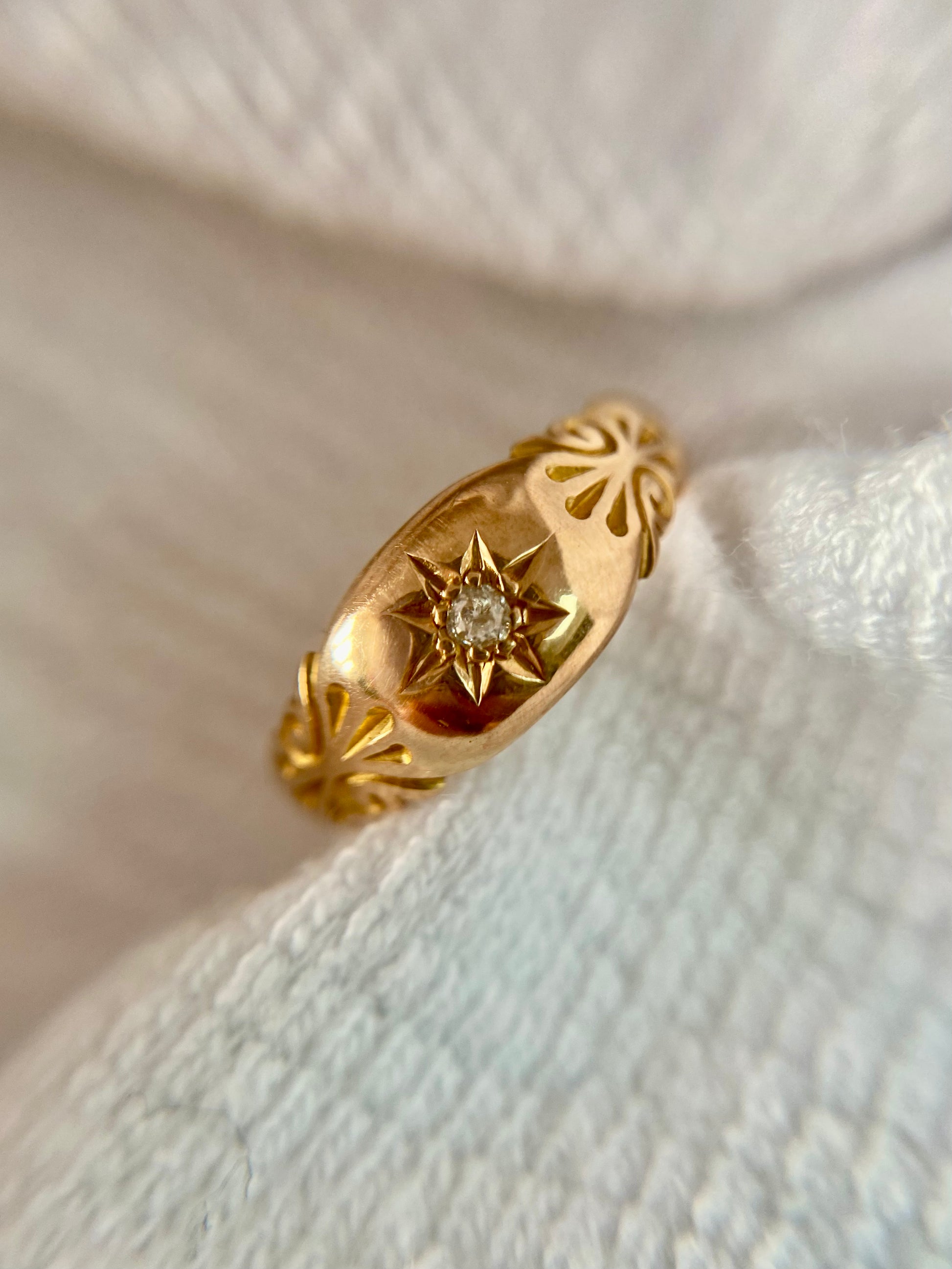 A gorgeous antique 18ct gold diamond ring in a starburst setting. This lovely antique ring is 122 years old. The diamond is an old cut diamond. This ring has beautiful carved shoulders.