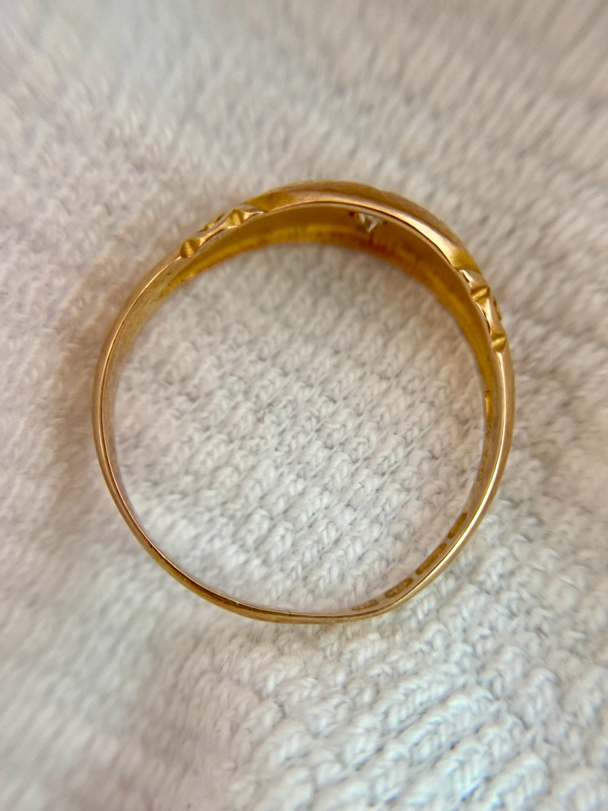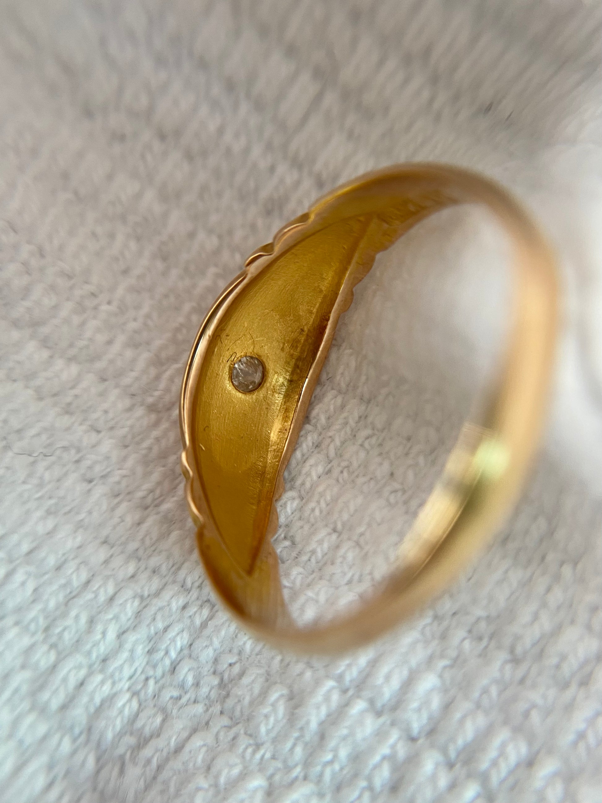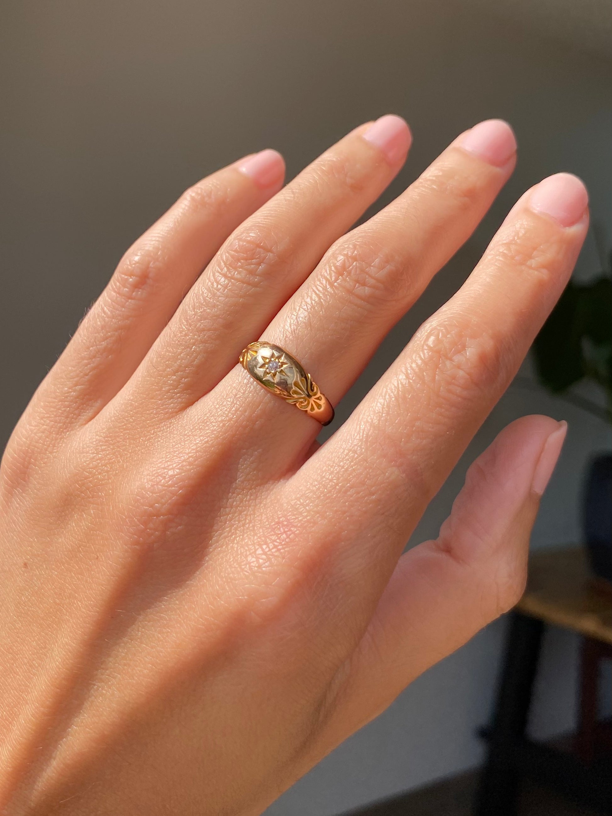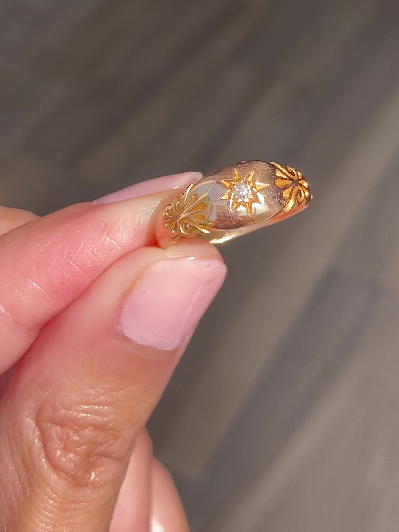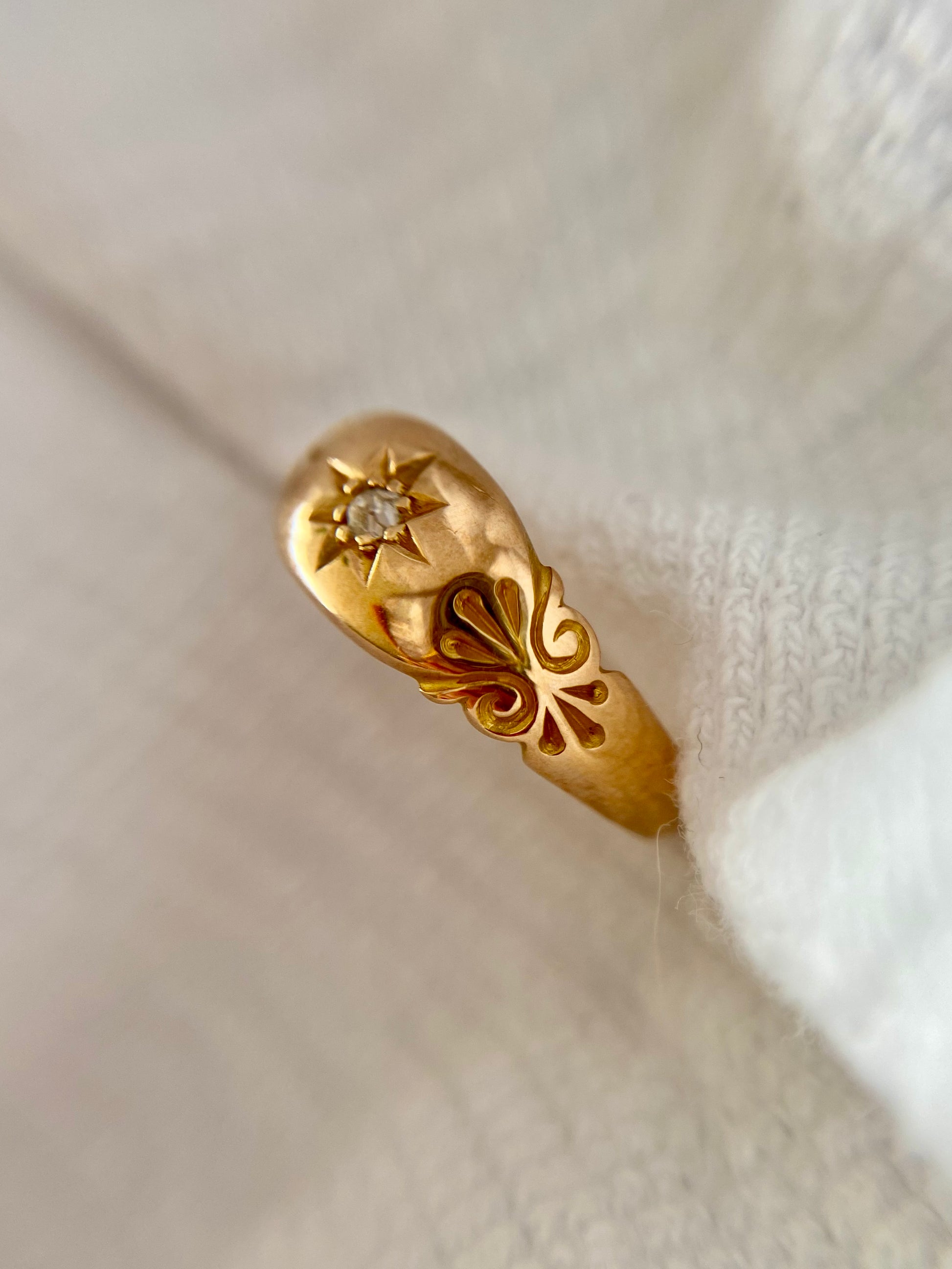 A gorgeous antique 18ct gold diamond ring in a starburst setting. This lovely antique ring is 122 years old. The diamond is an old cut diamond. This ring has beautiful carved shoulders.