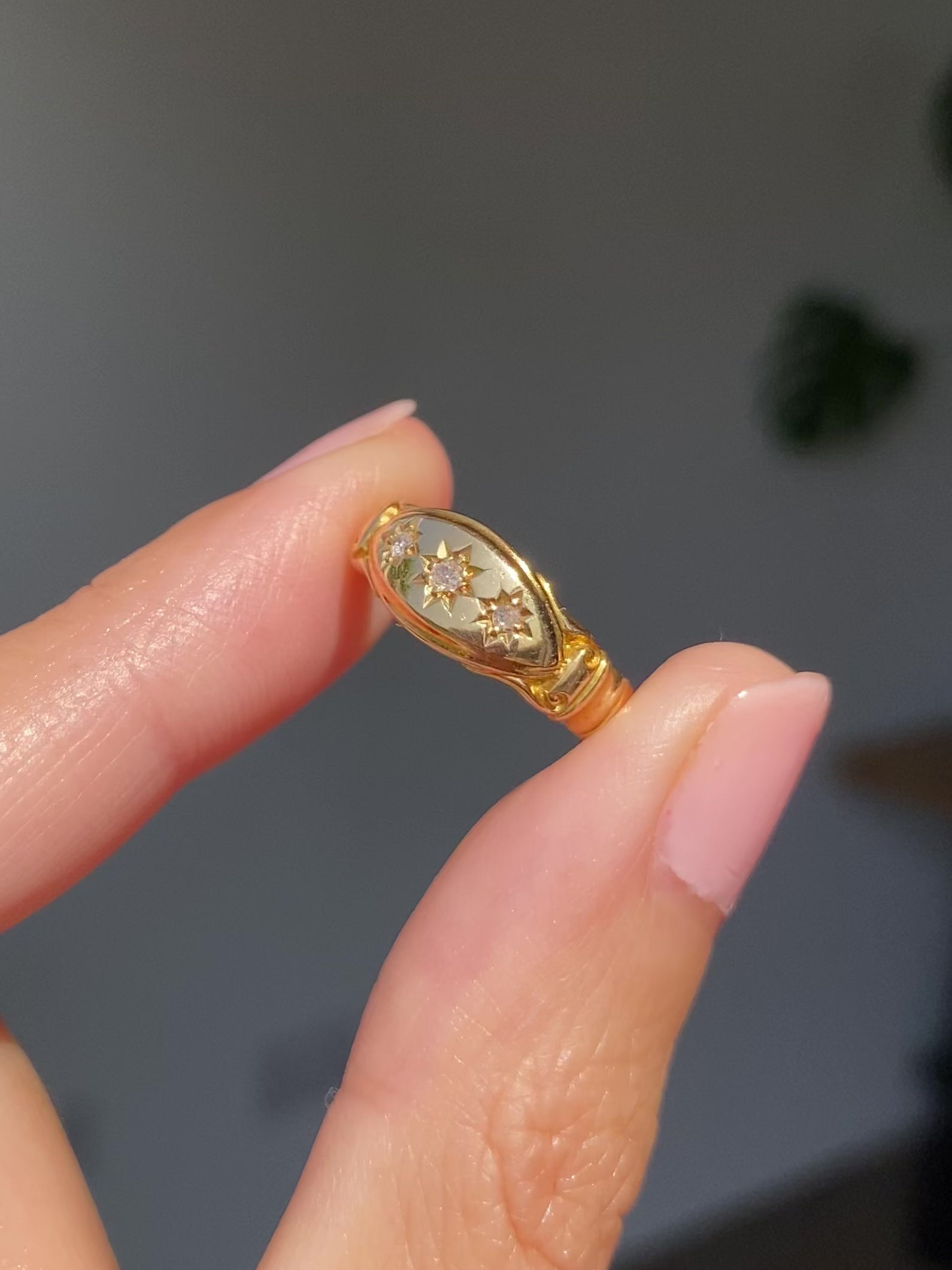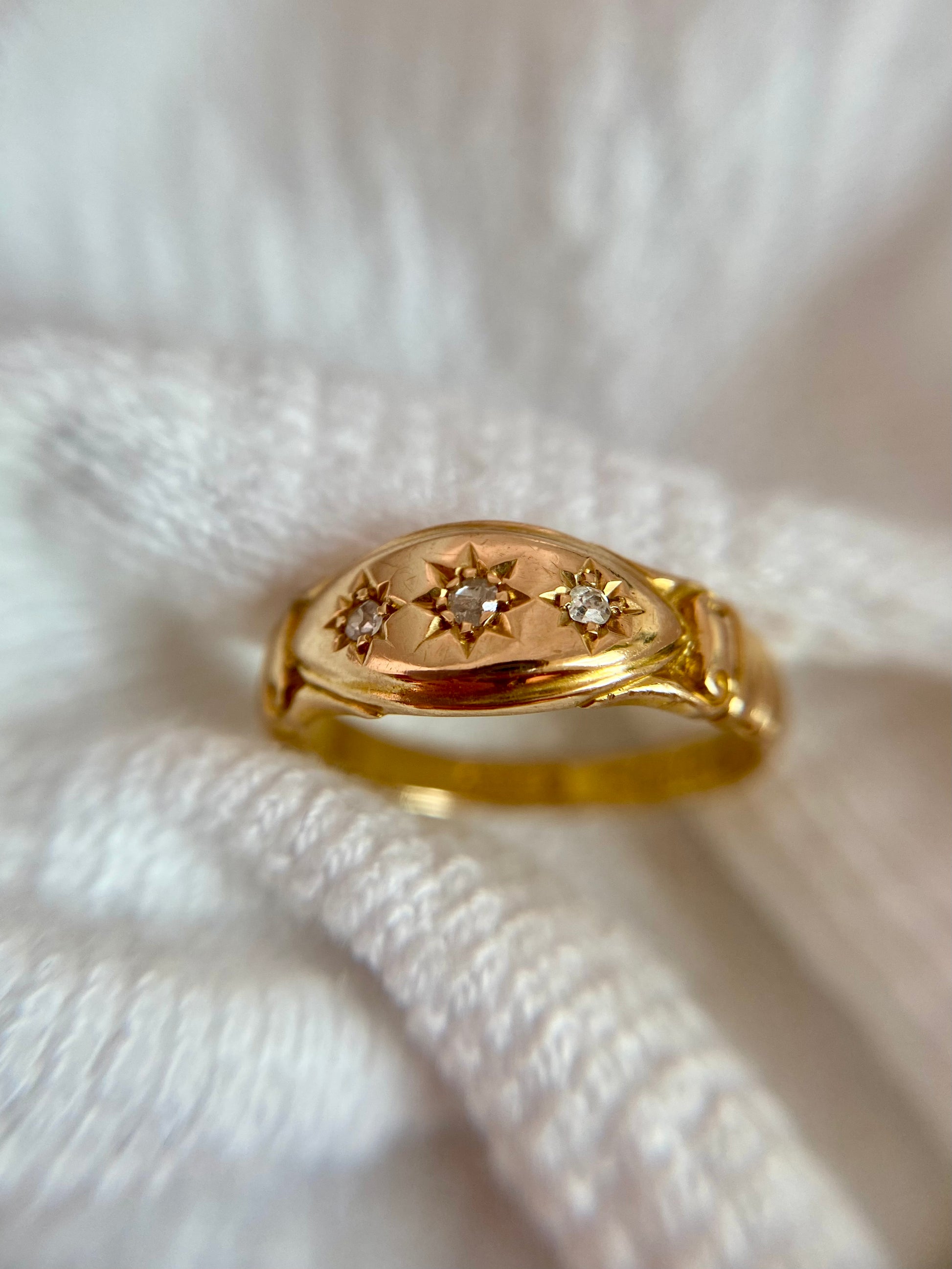 A beautiful antique 18ct gold diamond starburst trilogy ring. This ring is 121 years old!