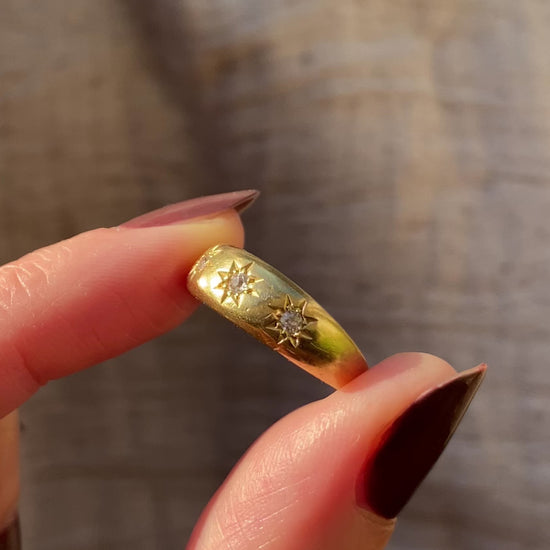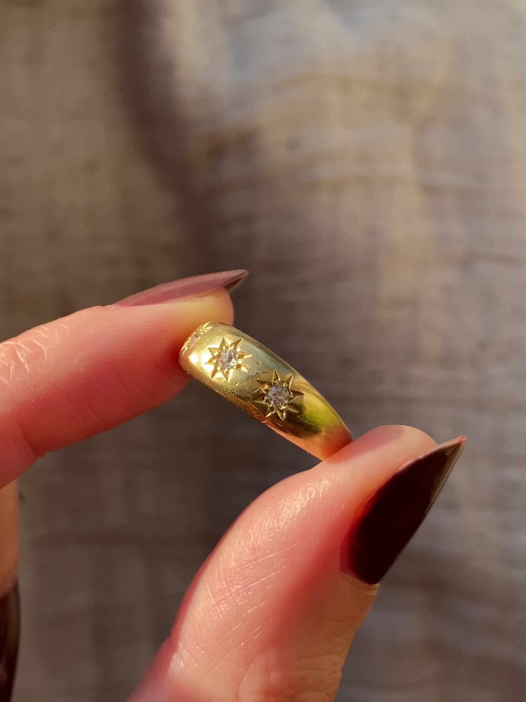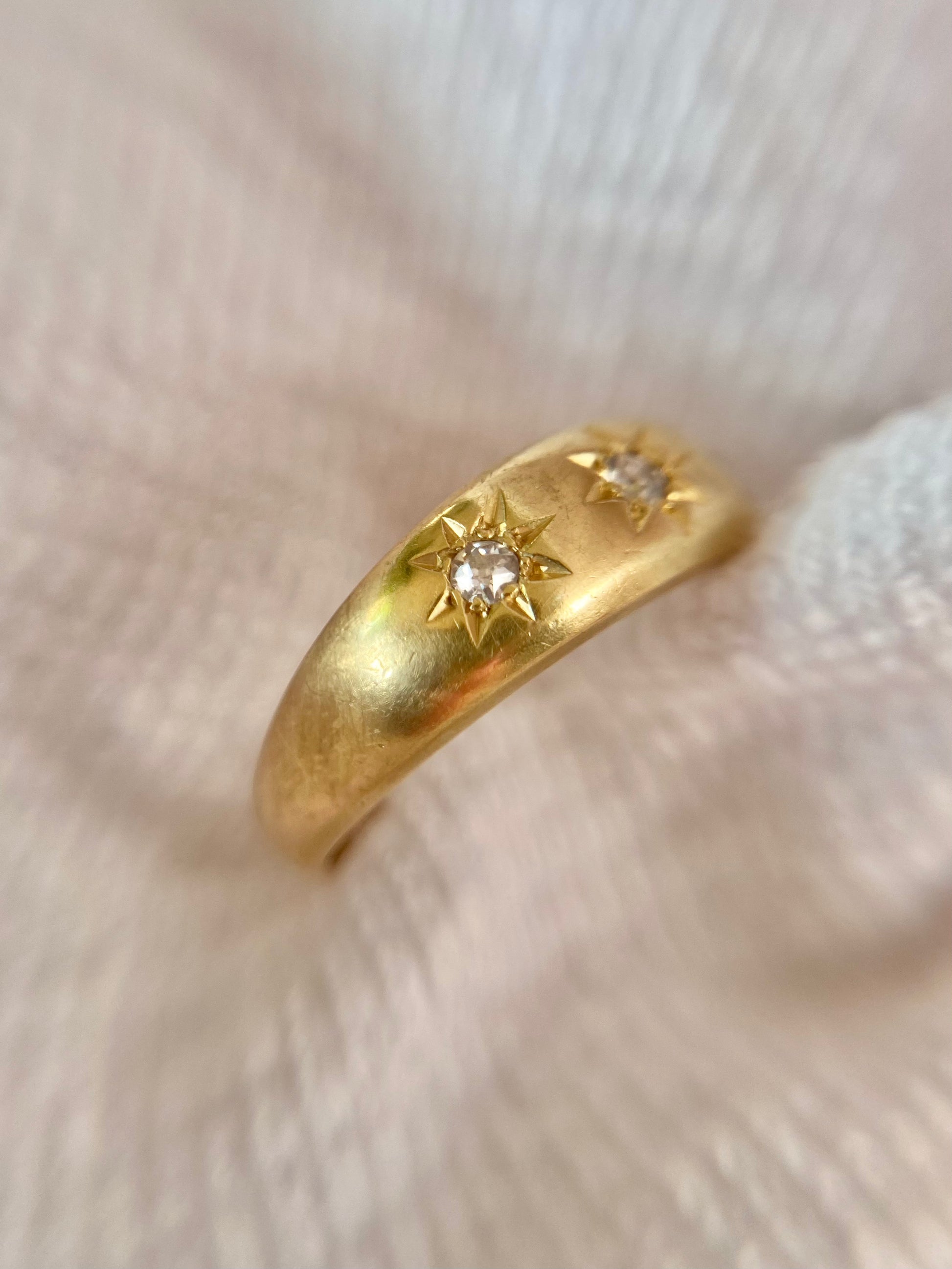 A gorgeous antique 18ct gold old cut diamond trilogy ring in a starburst setting. This ring has a lovely weight to it with most of the weight being in the top half of the ring, the bottom of the band is a lot thinner than the top. Please see photo of the side profile!