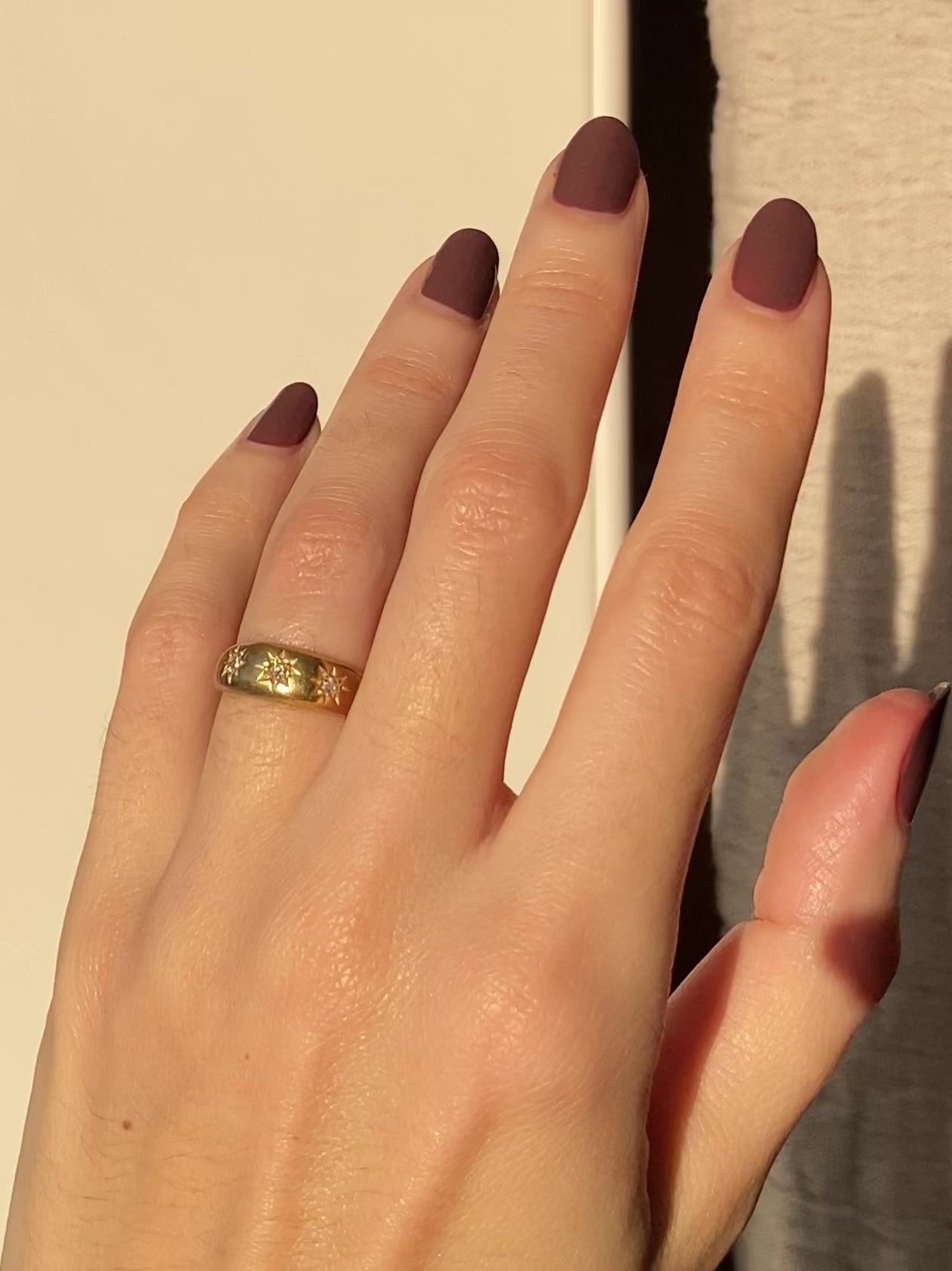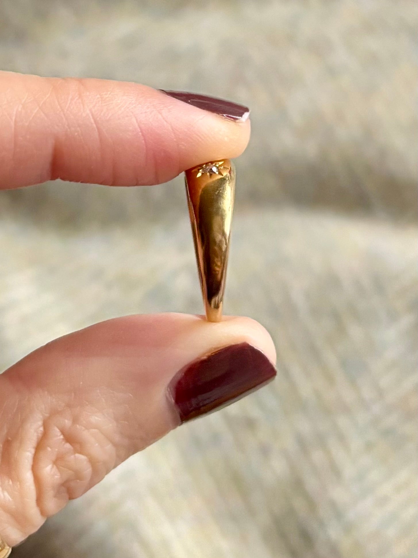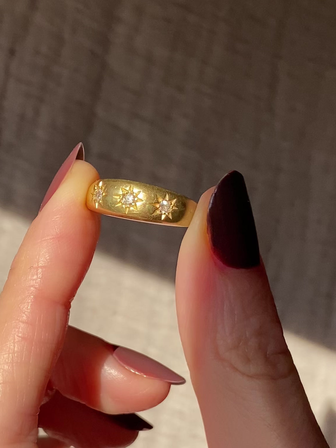A gorgeous antique 18ct gold old cut diamond trilogy ring in a starburst setting. This ring has a lovely weight to it with most of the weight being in the top half of the ring, the bottom of the band is a lot thinner than the top. Please see photo of the side profile!