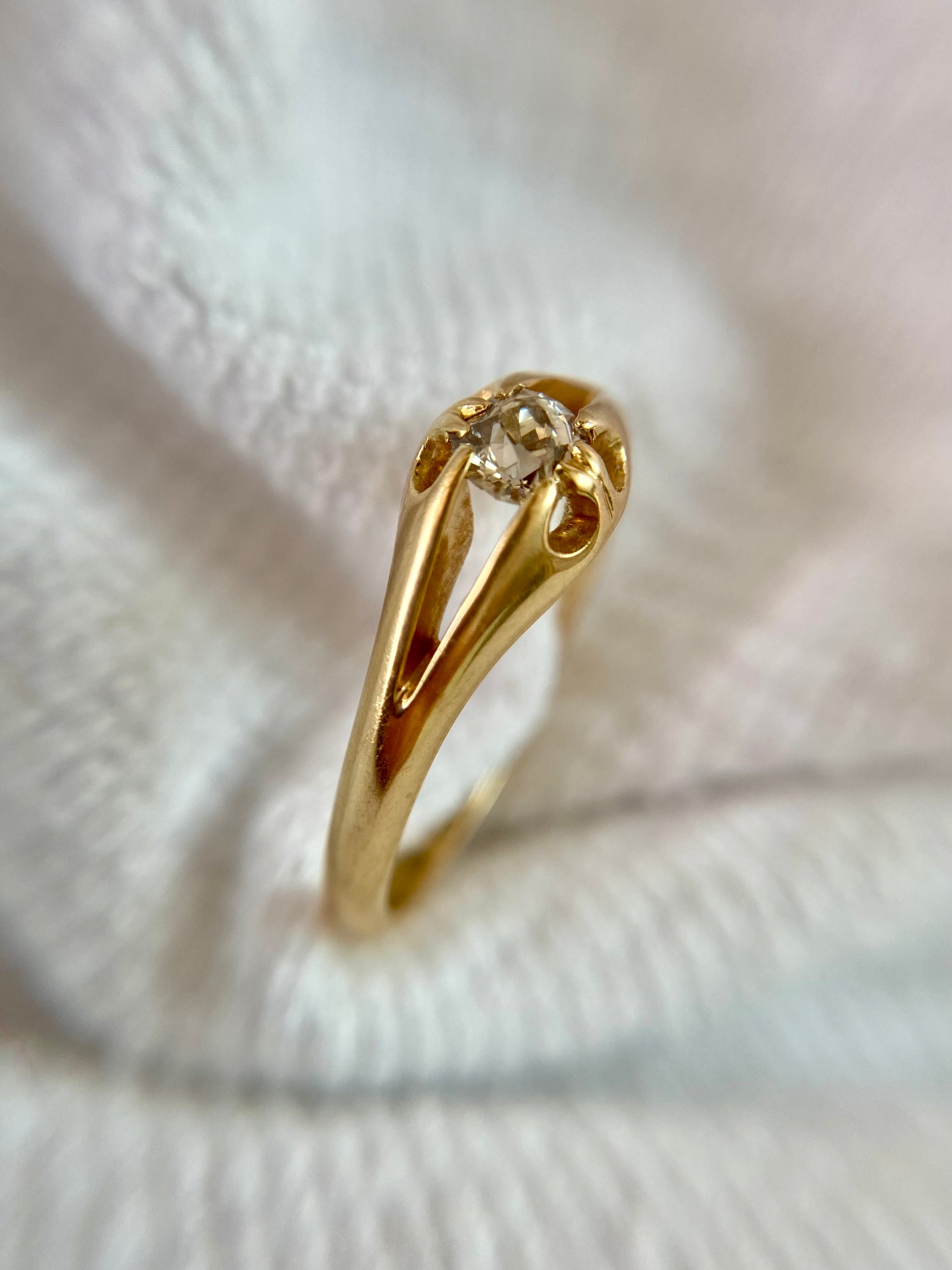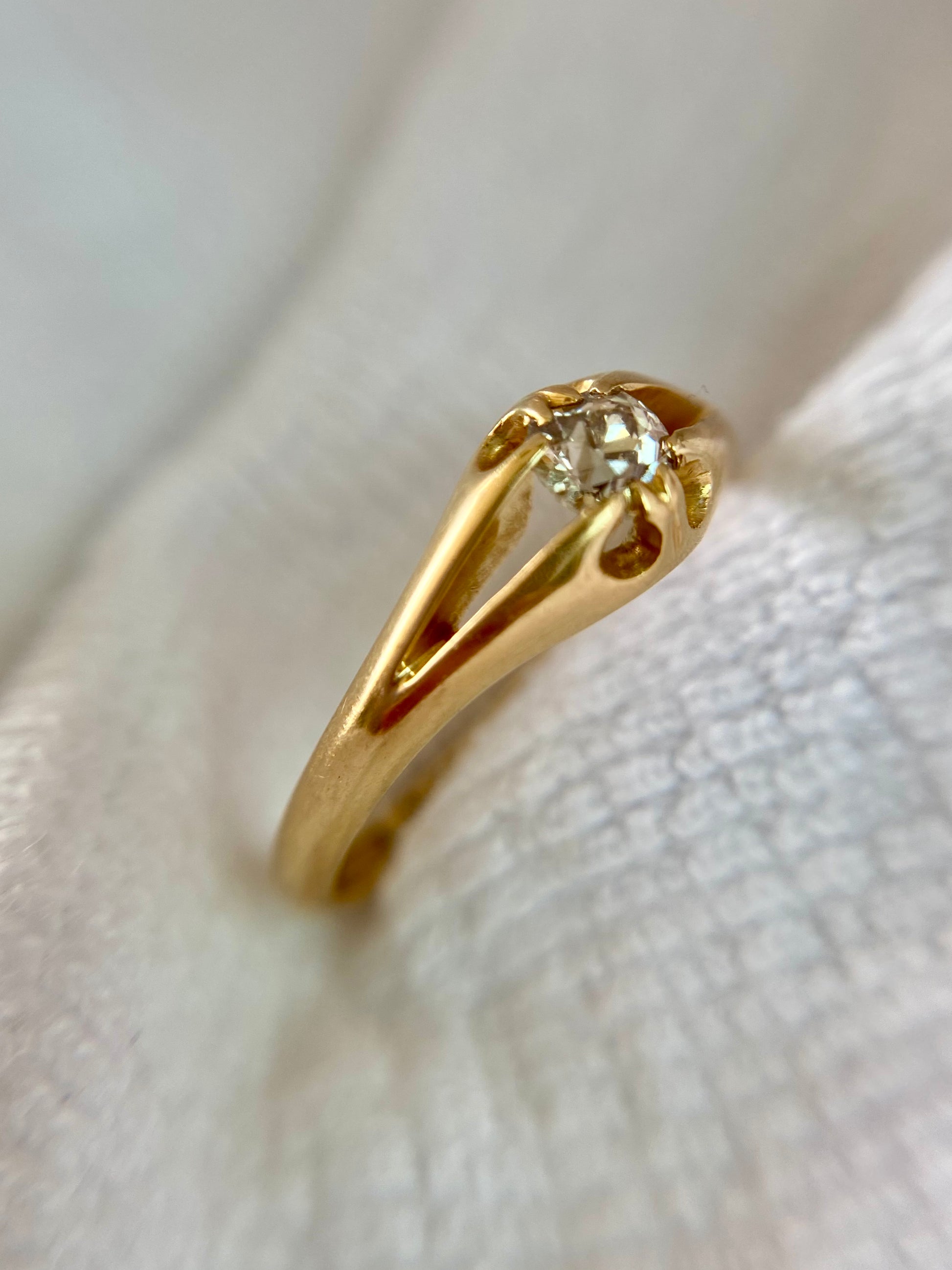 A gorgeous antique 18ct gold diamond ring in a split buttercup setting. The diamond measured approximately 4x4mm.