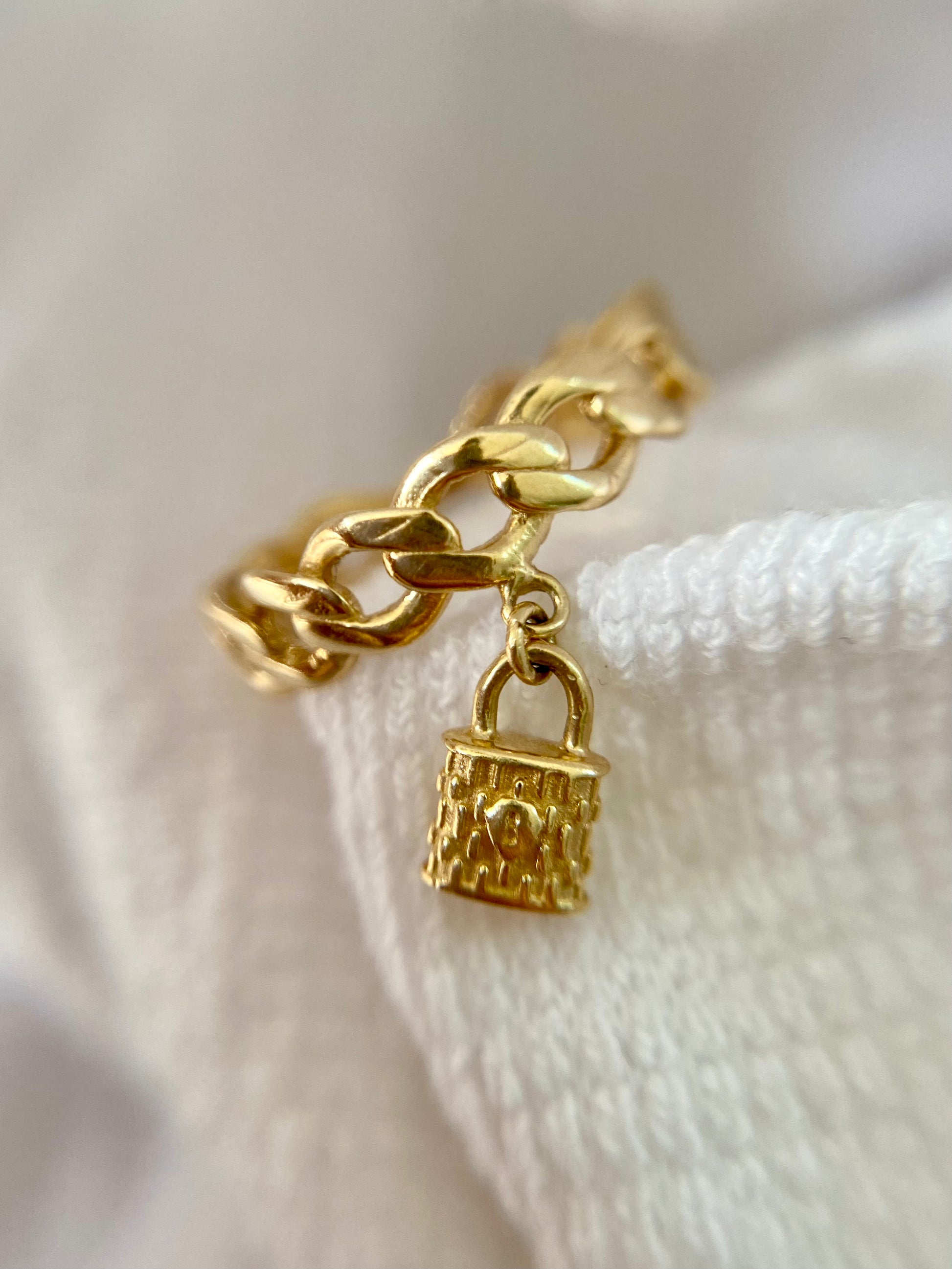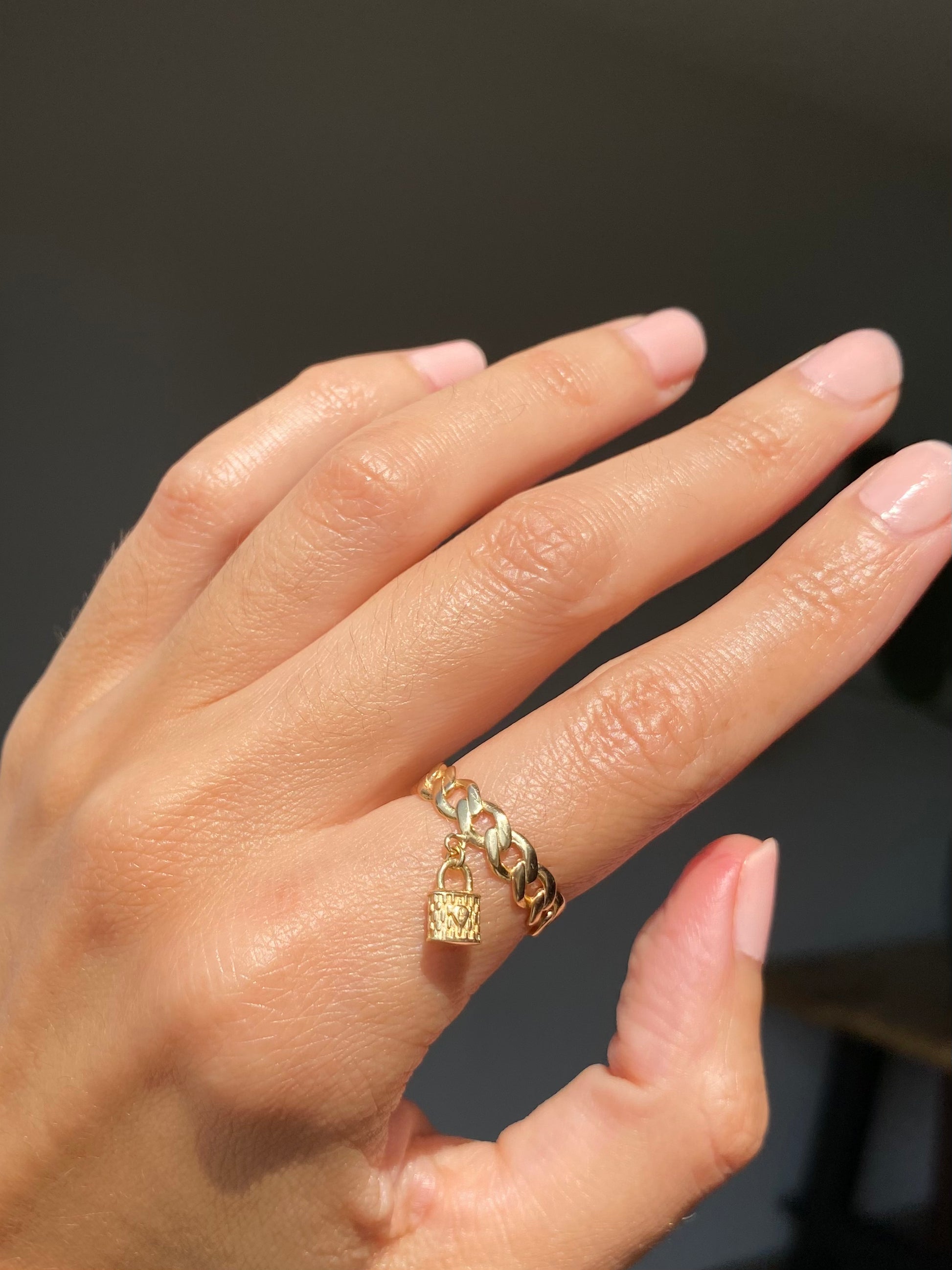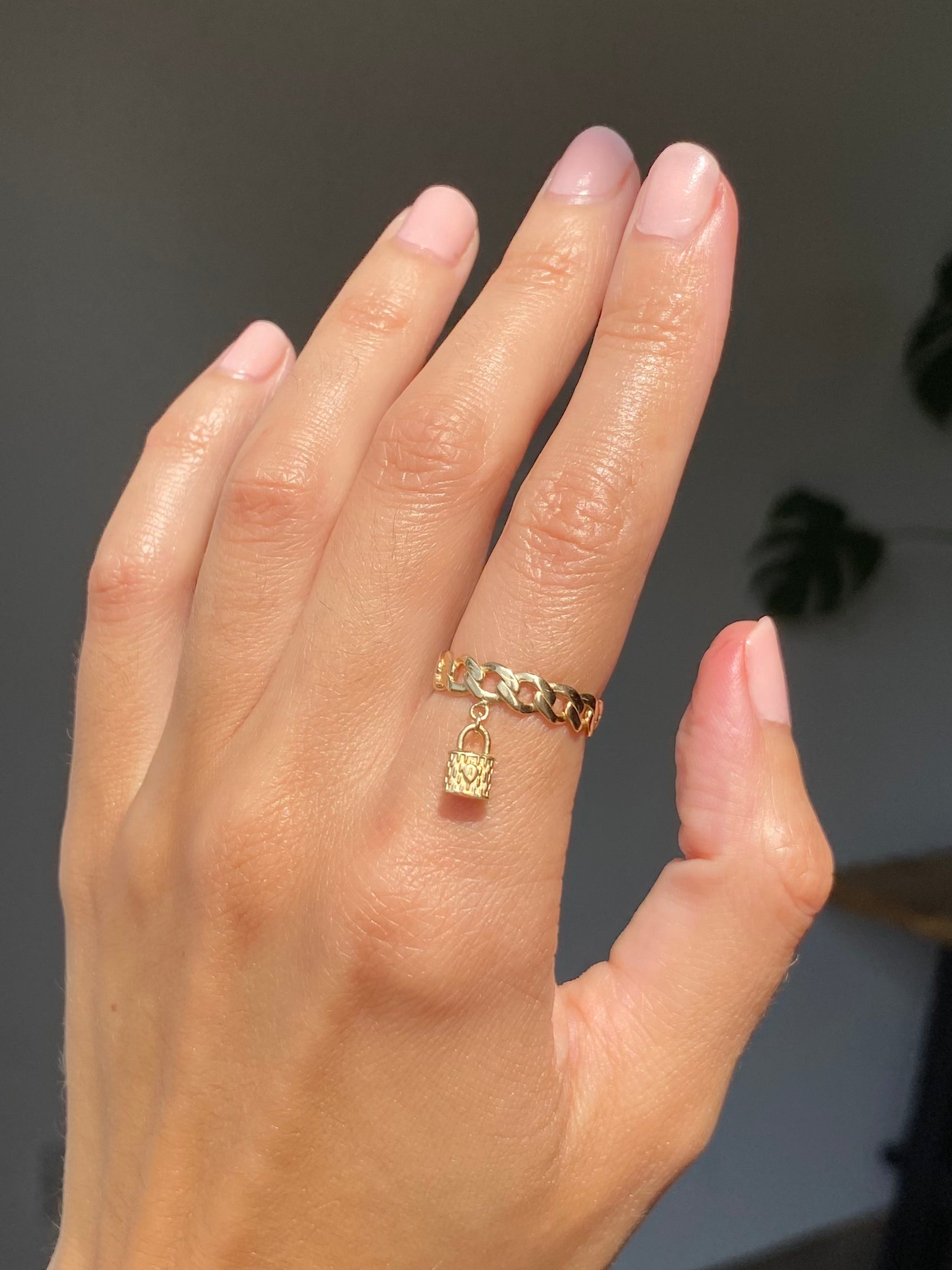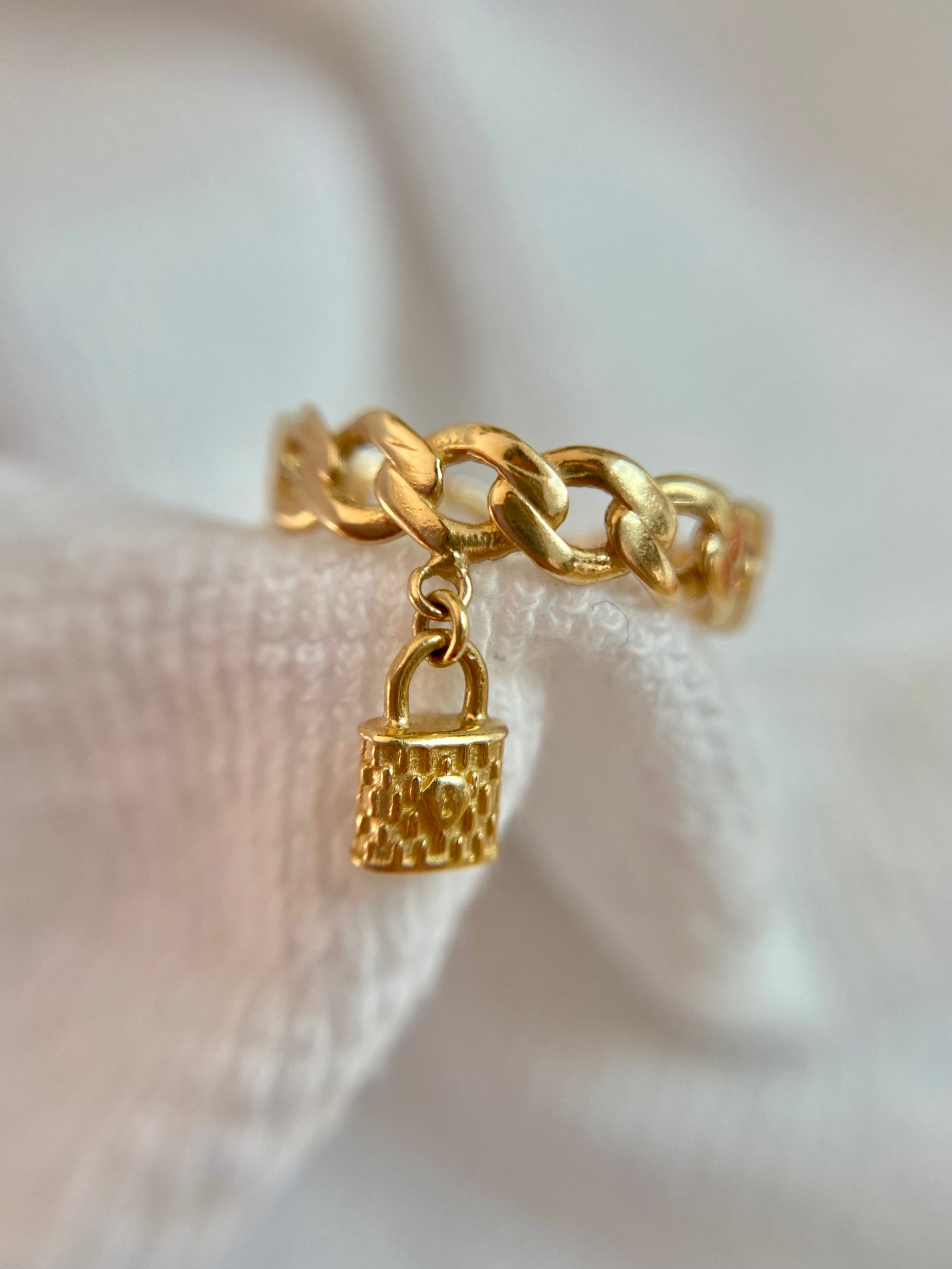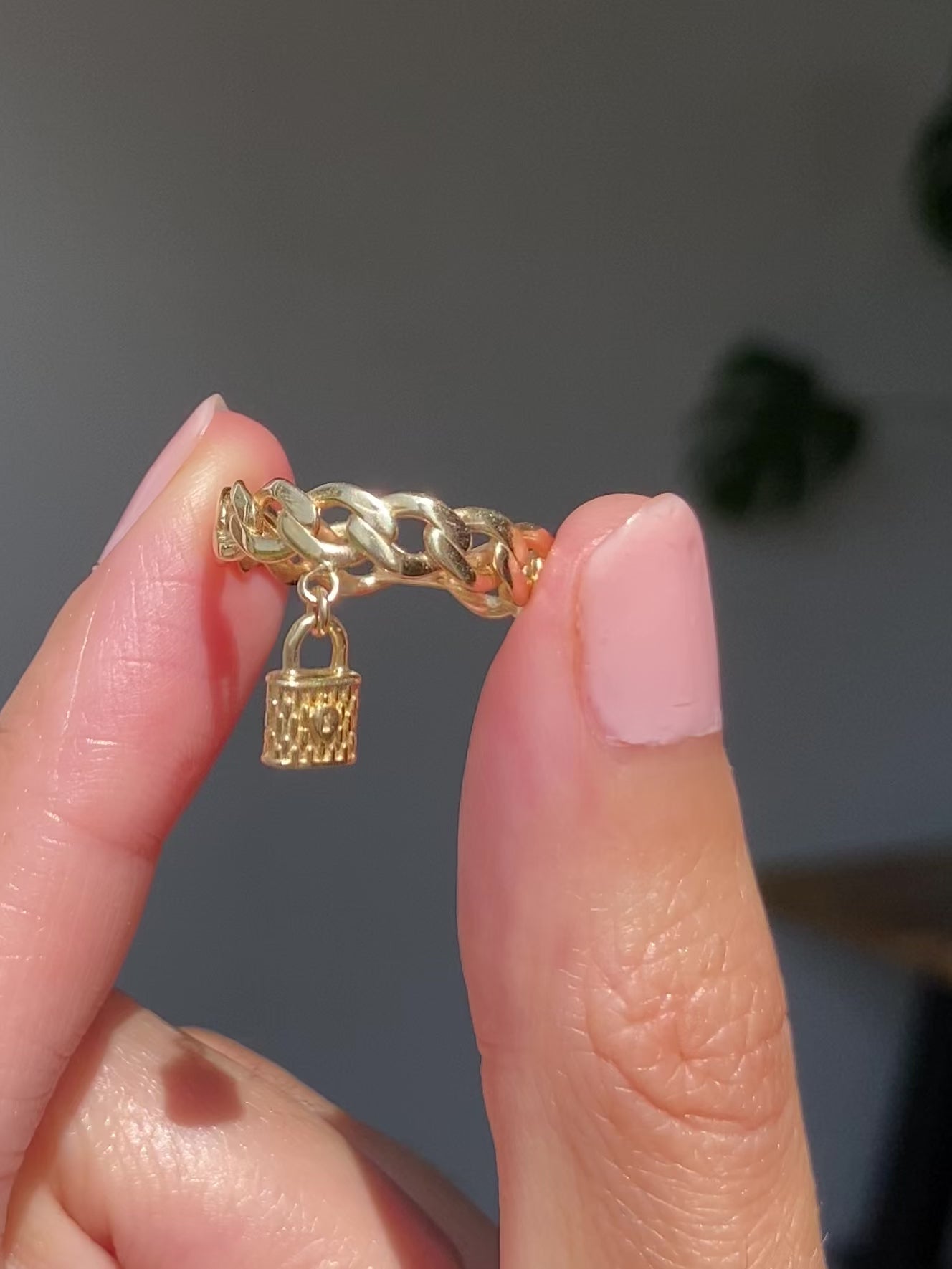 A beautiful vintage 14ct gold chain ring with padlock charm.