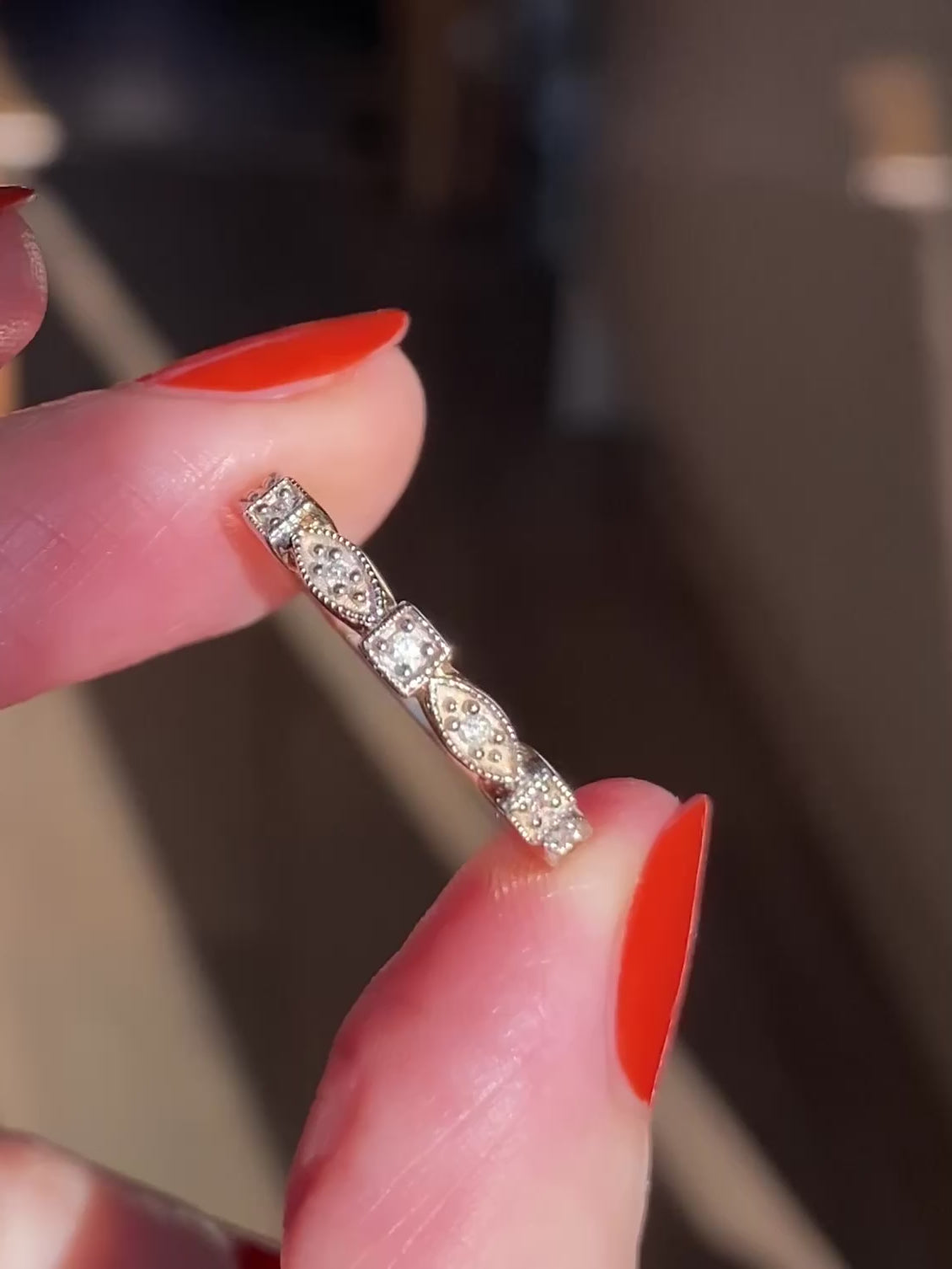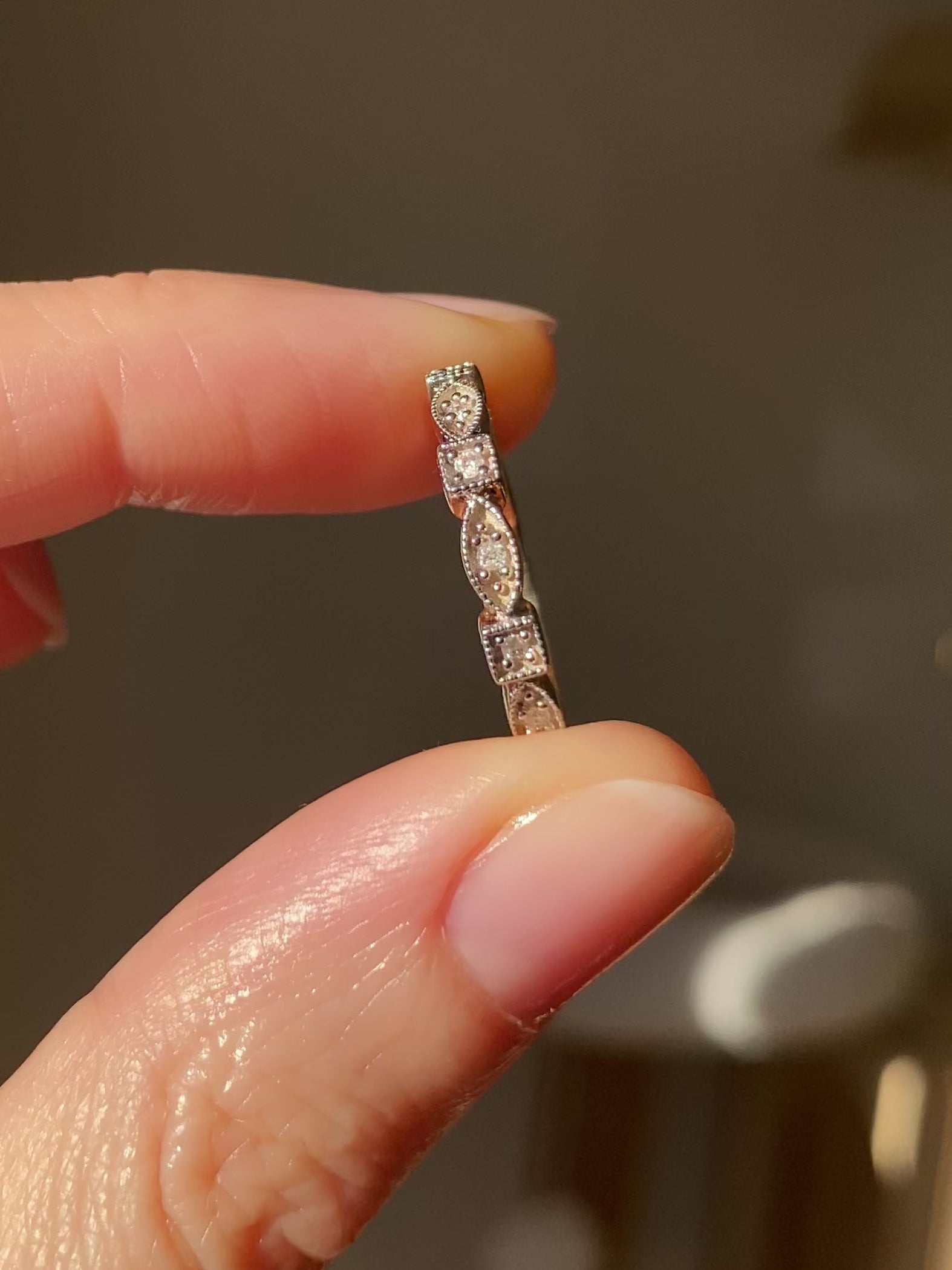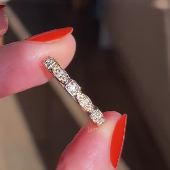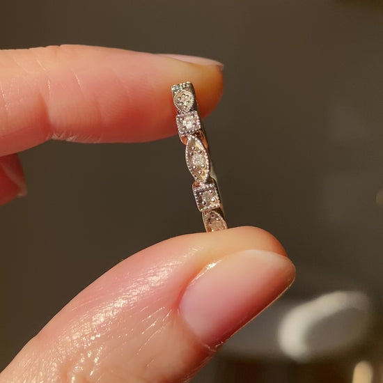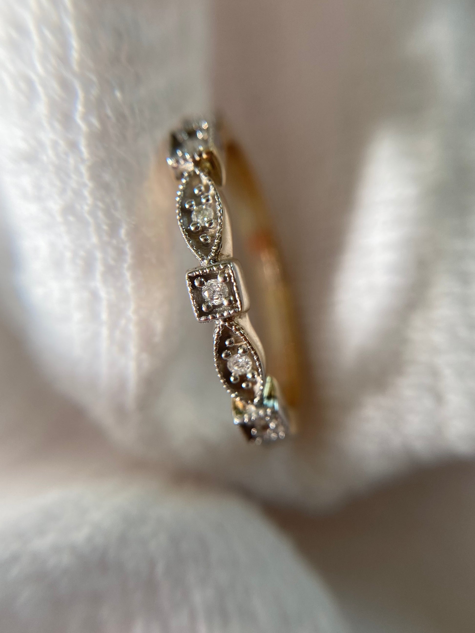 A pretty preloved 9ct gold diamond band. This band has 7 small diamonds in an alternating marquise and square pattern. Each shape has a pretty milgrain edging, a really lovely piece. This ring sits 2.5mm above the hand at it's highest point.