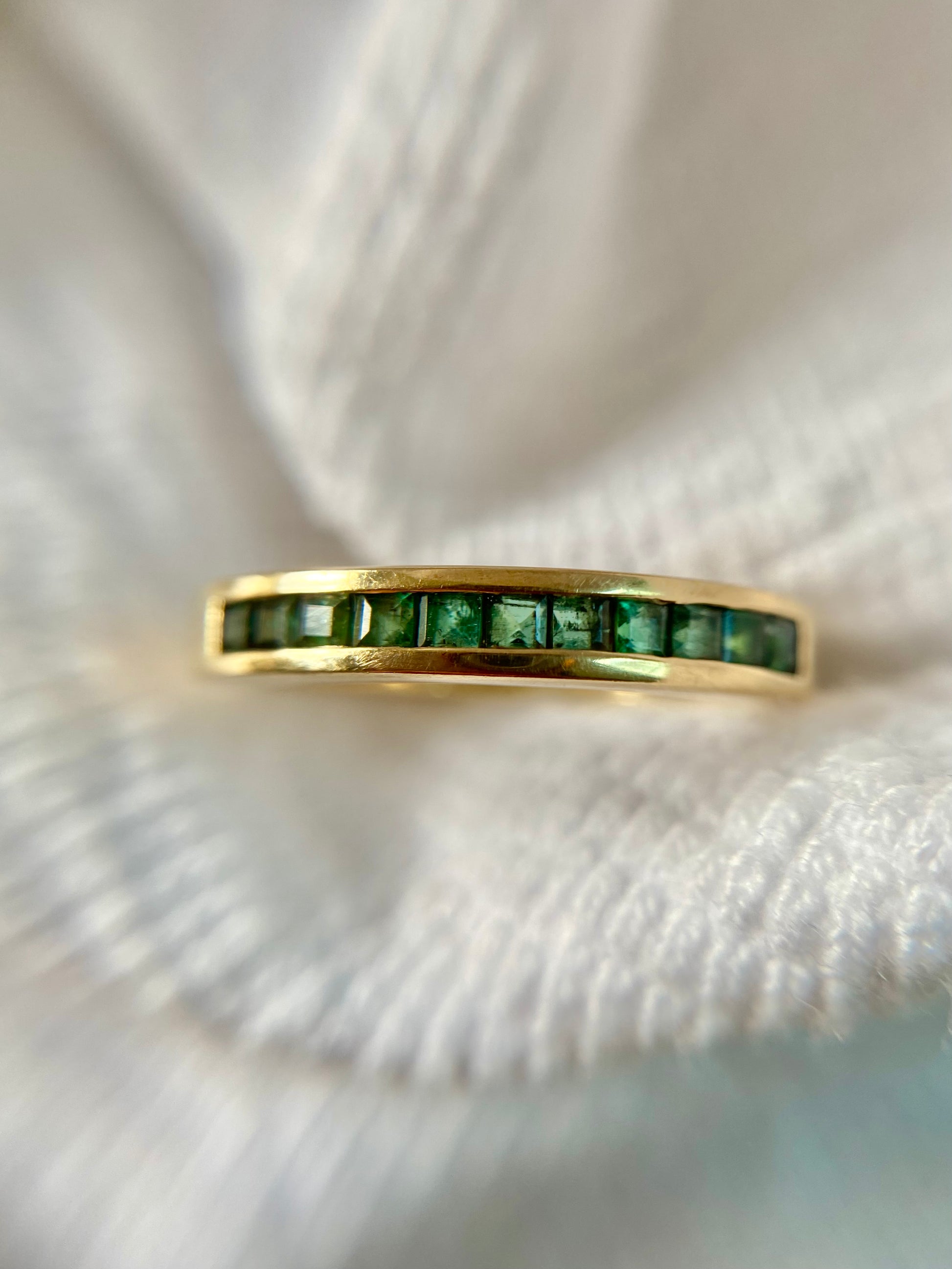 A very beautiful 9ct gold emerald half eternity ring. This ring has a row of 11 emeralds in a channel setting.