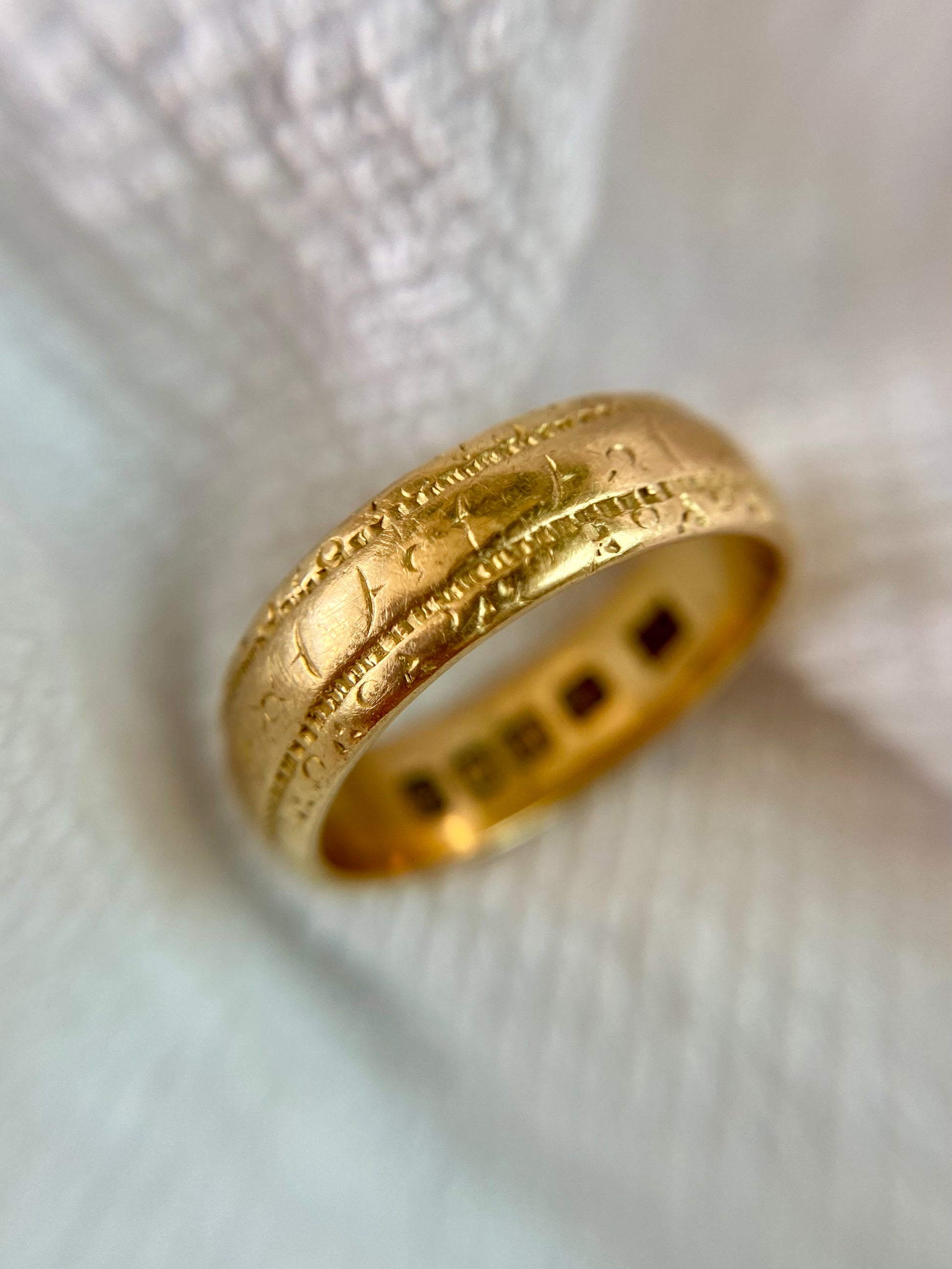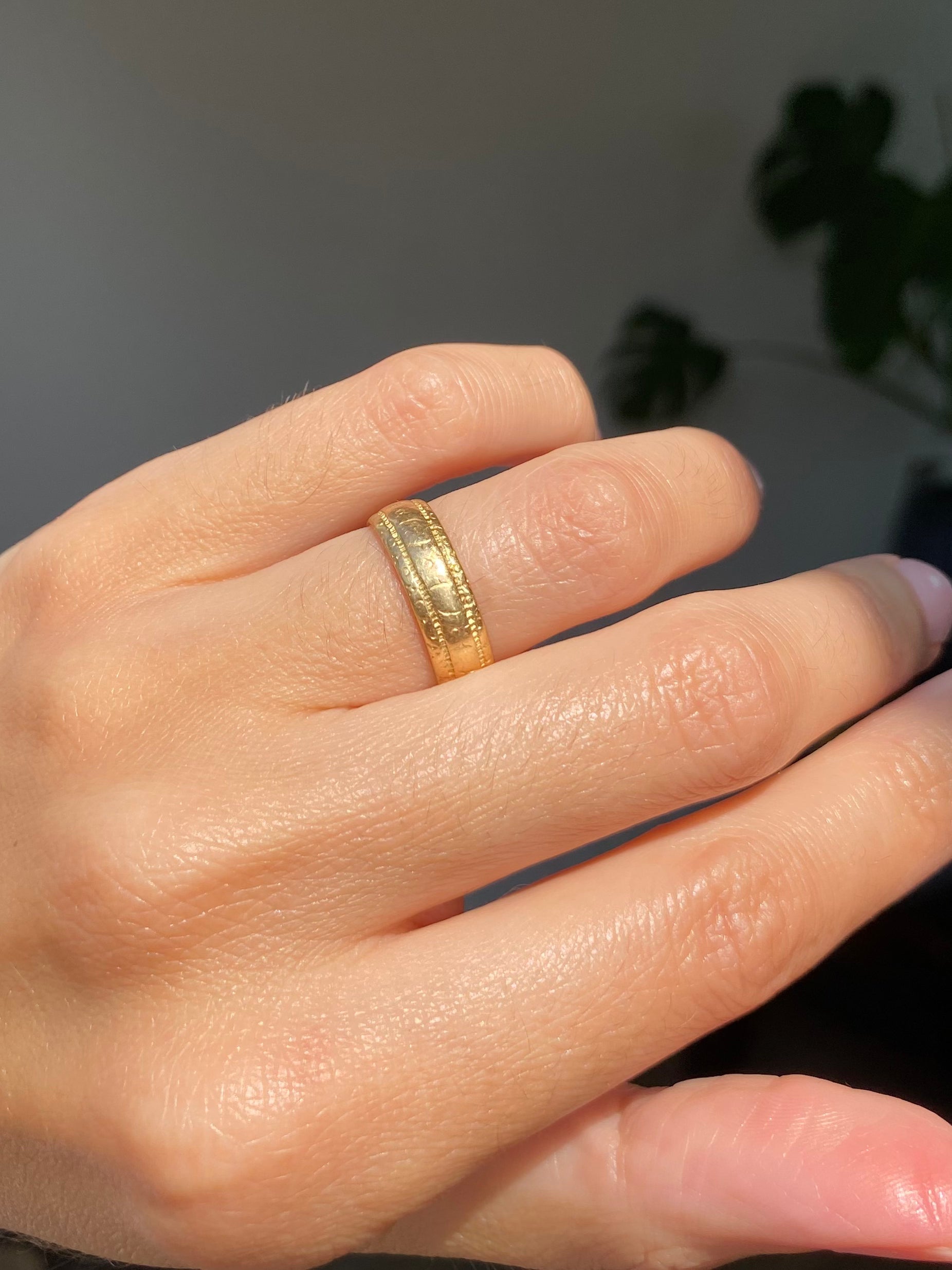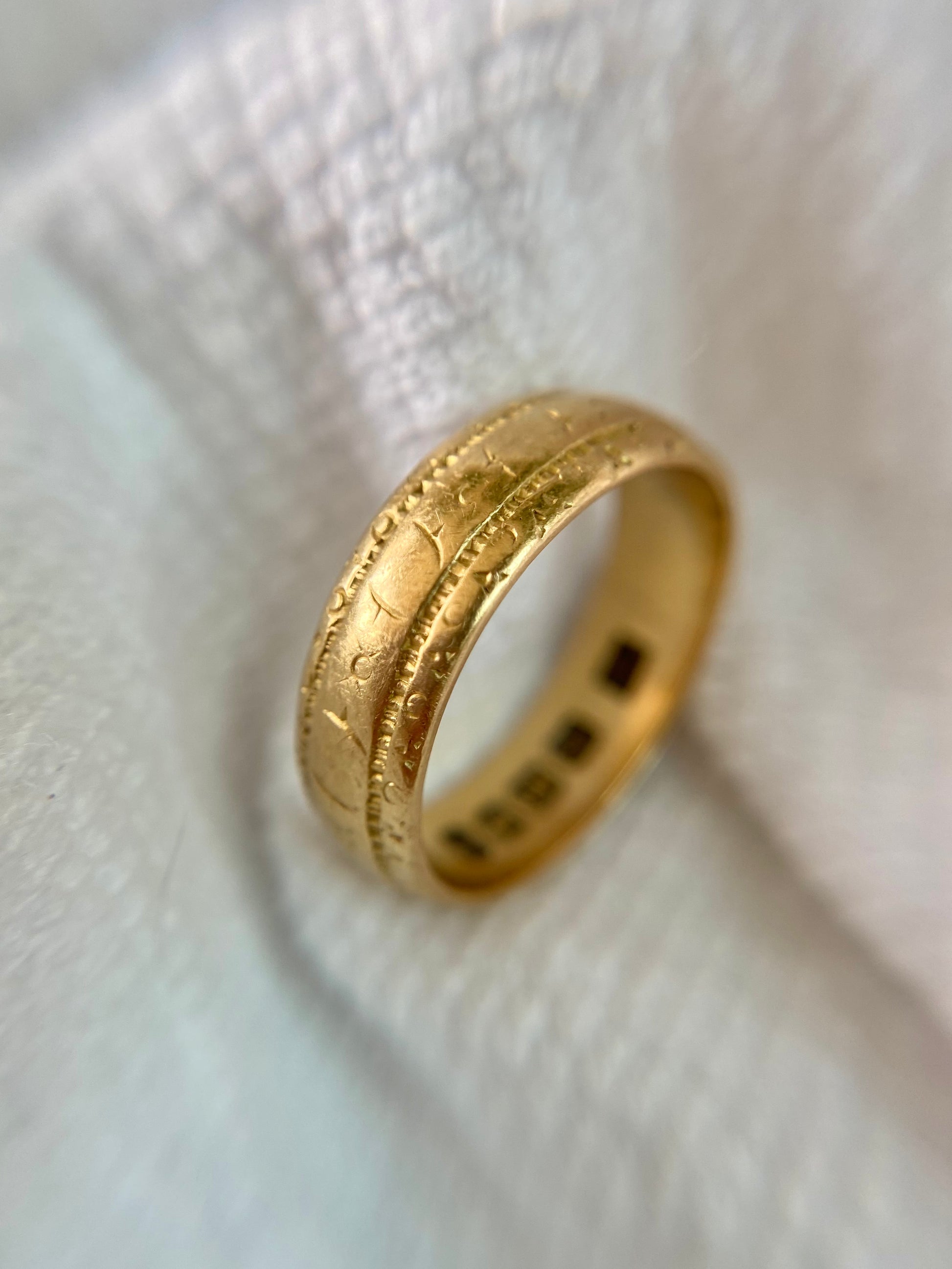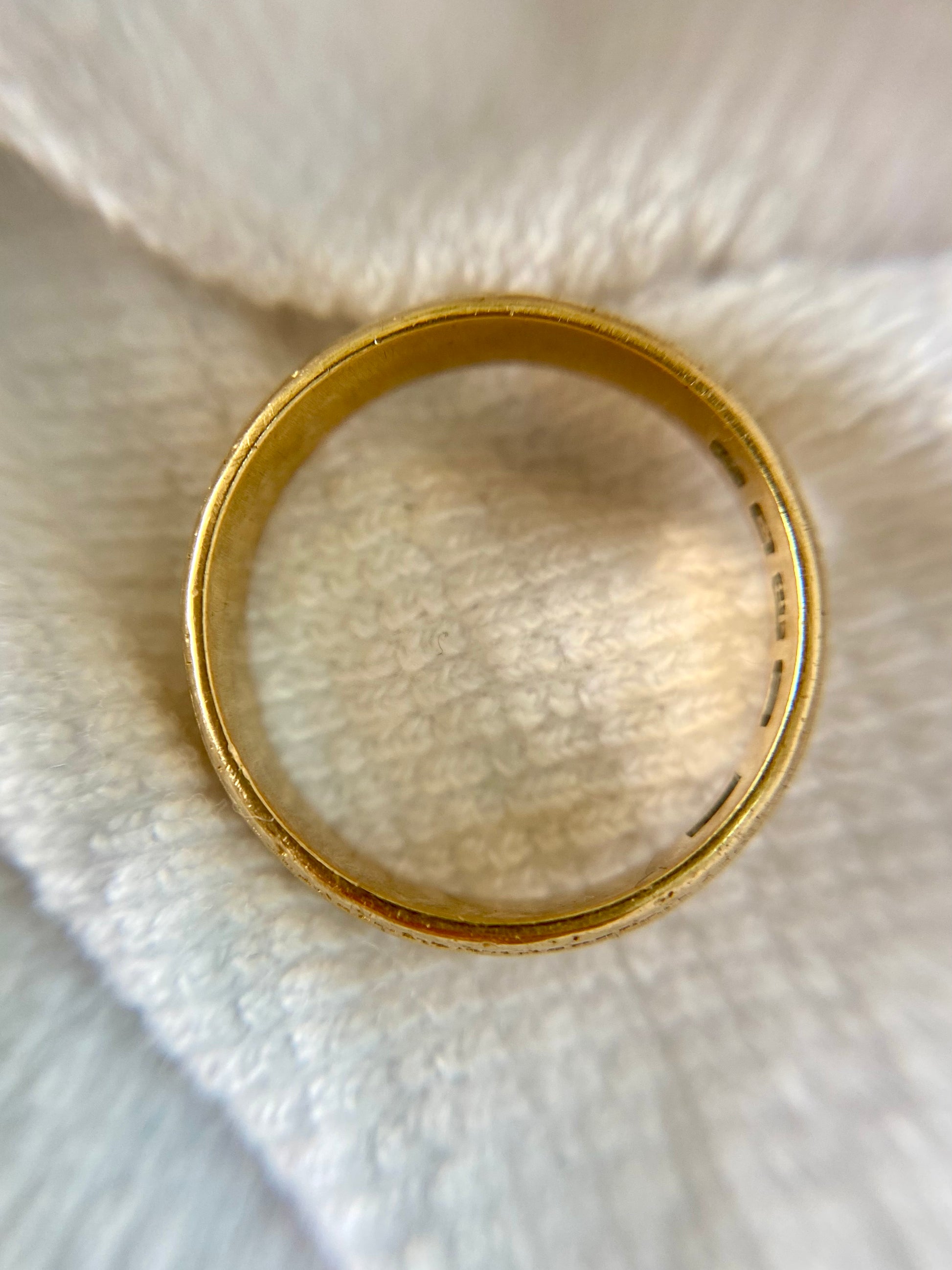 A beautiful vintage 18ct gold band. It has a faded carved floral pattern on the edges of the outer band. A gorgeous buttery yellow band with gorgeous patina.
