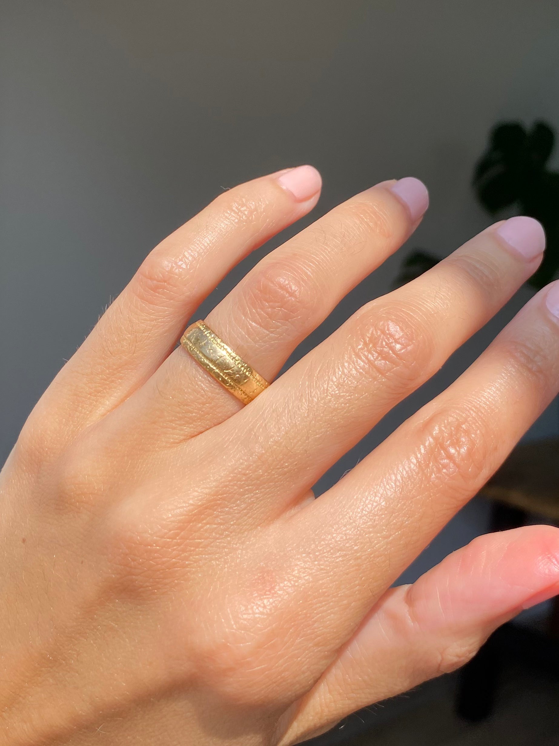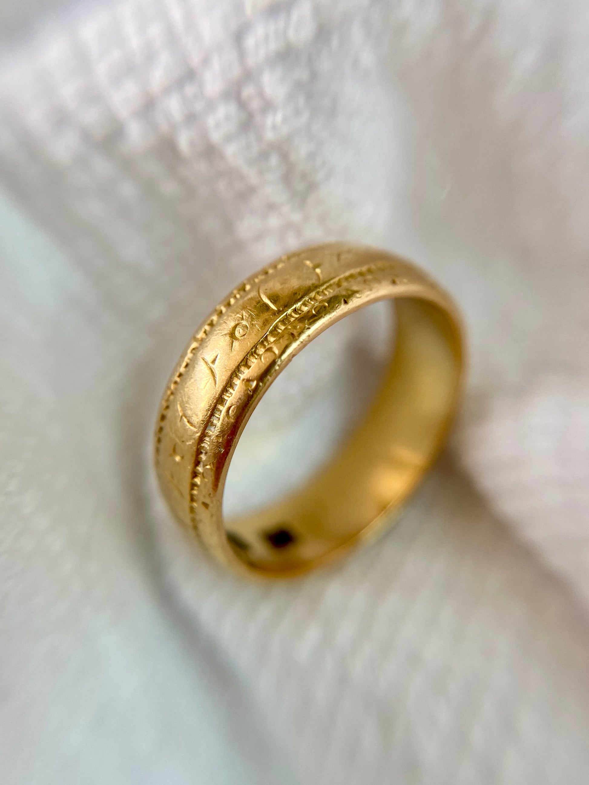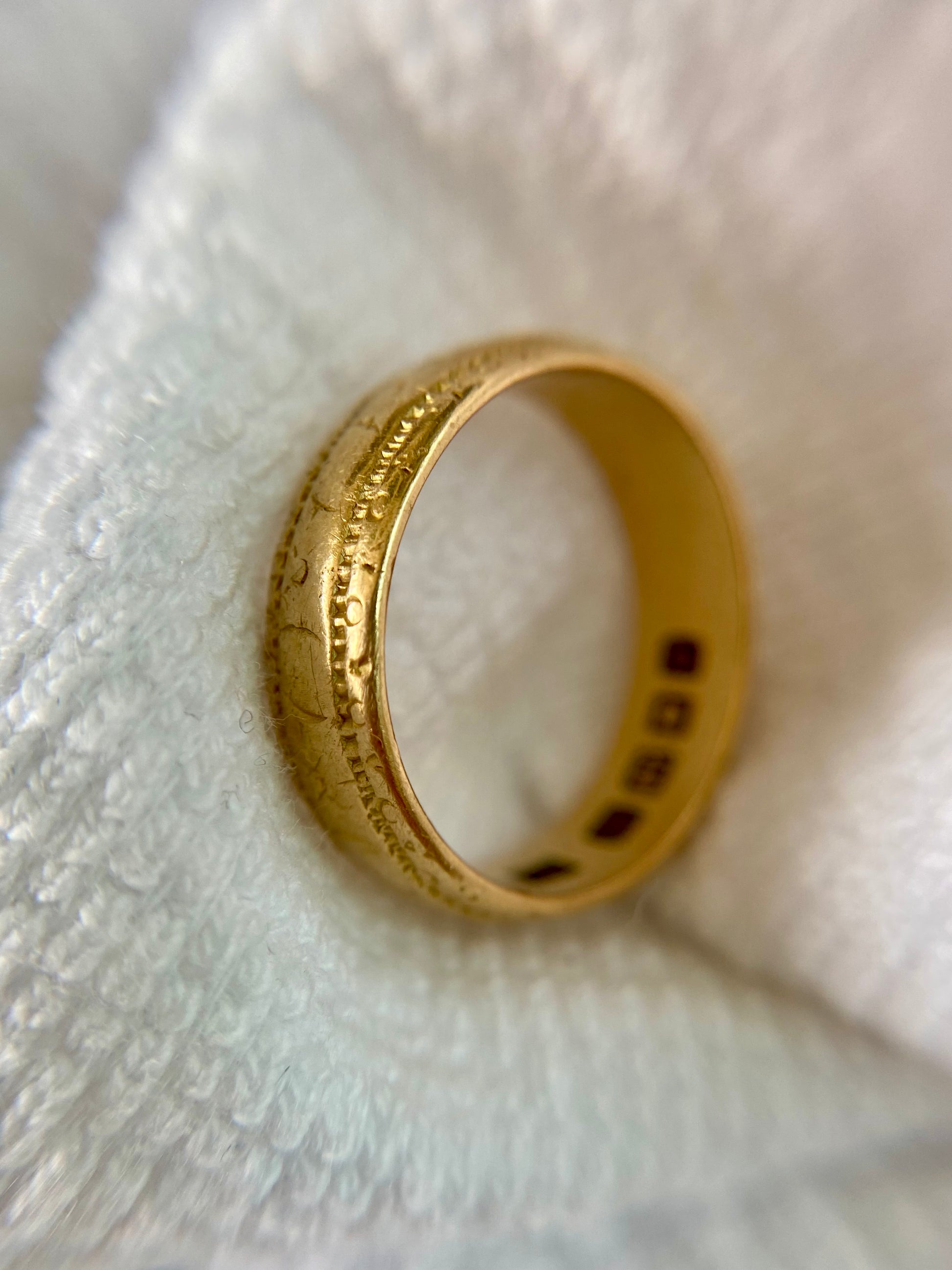 A beautiful vintage 18ct gold band. It has a faded carved floral pattern on the edges of the outer band. A gorgeous buttery yellow band with gorgeous patina.