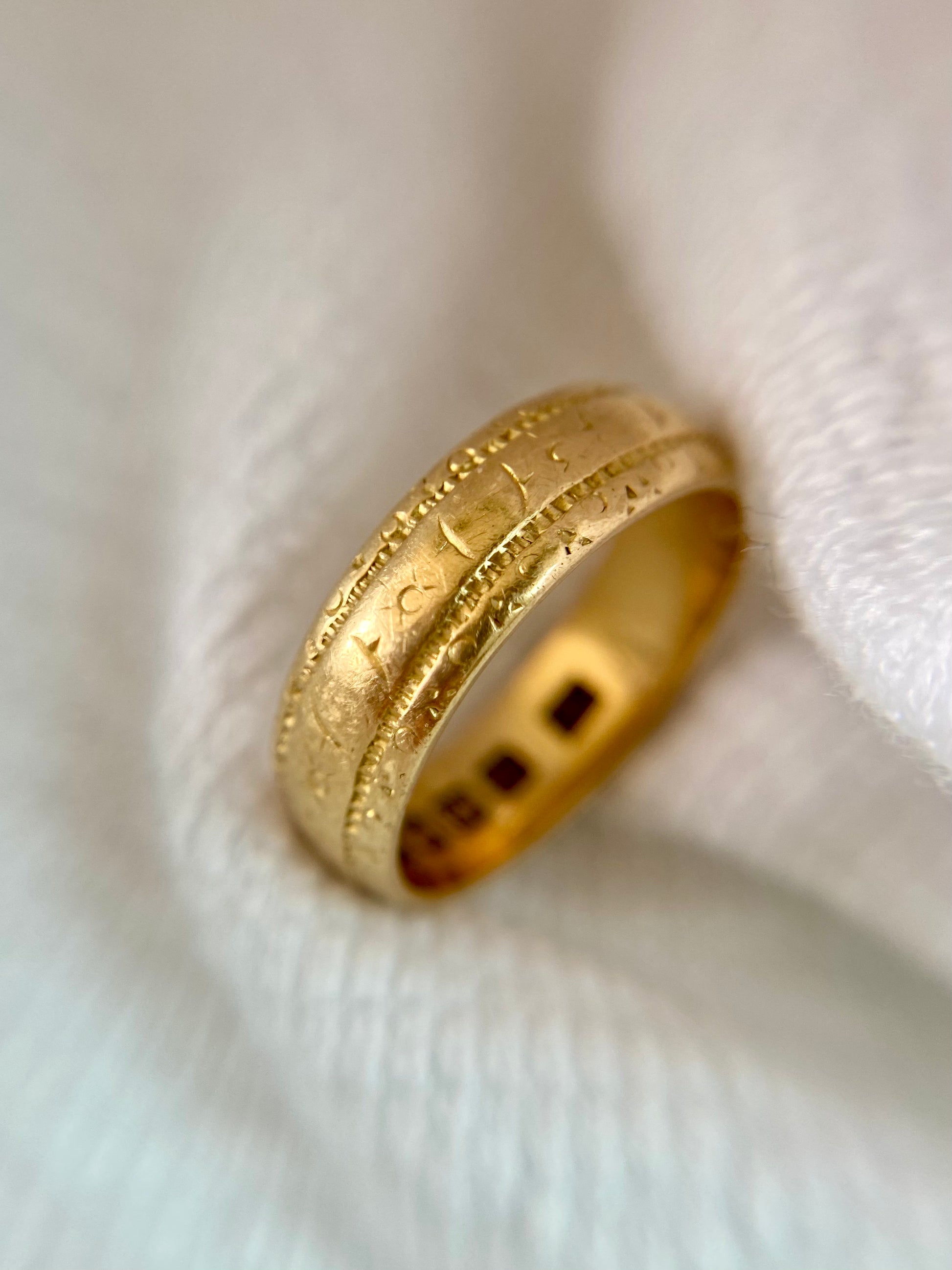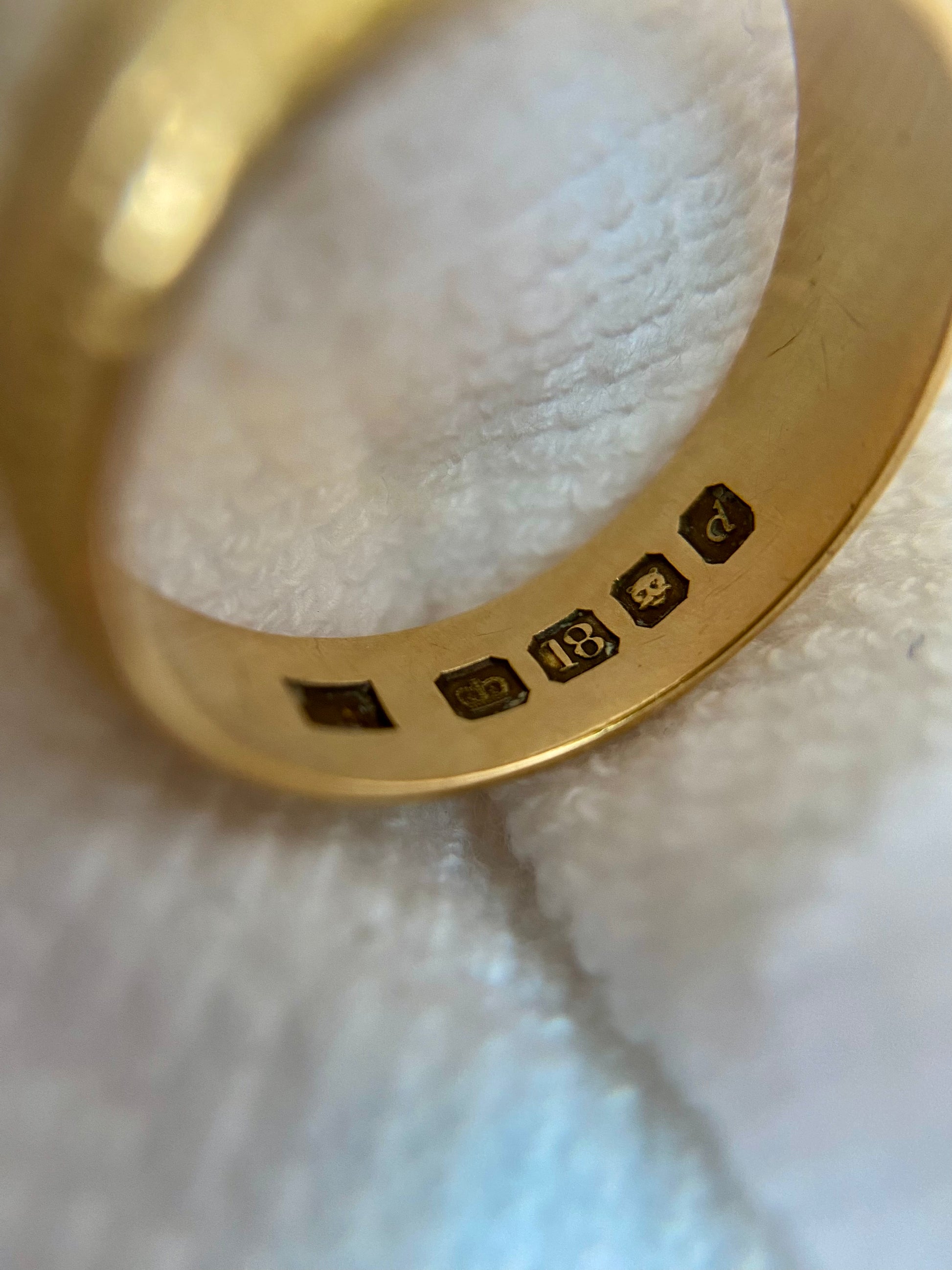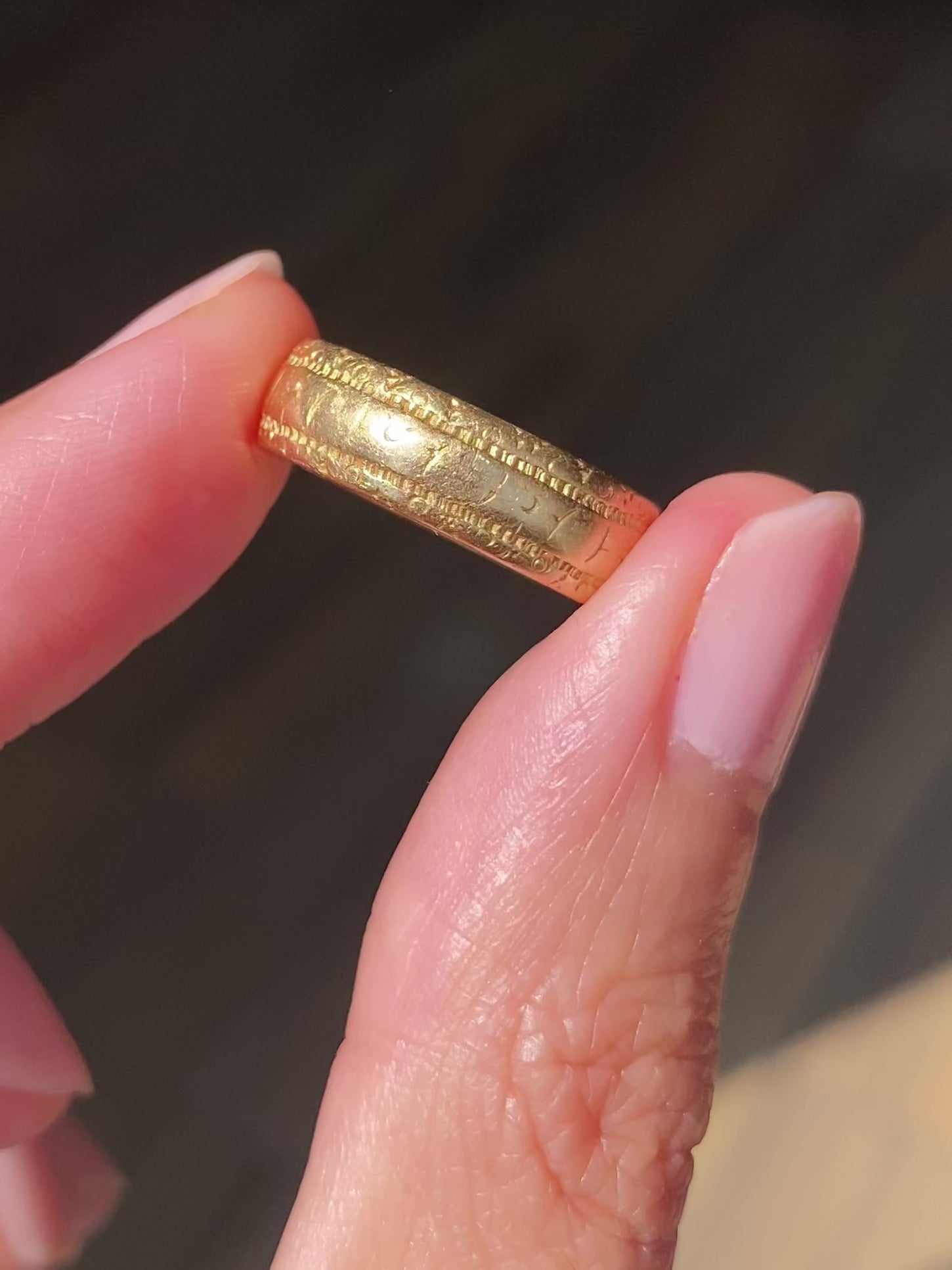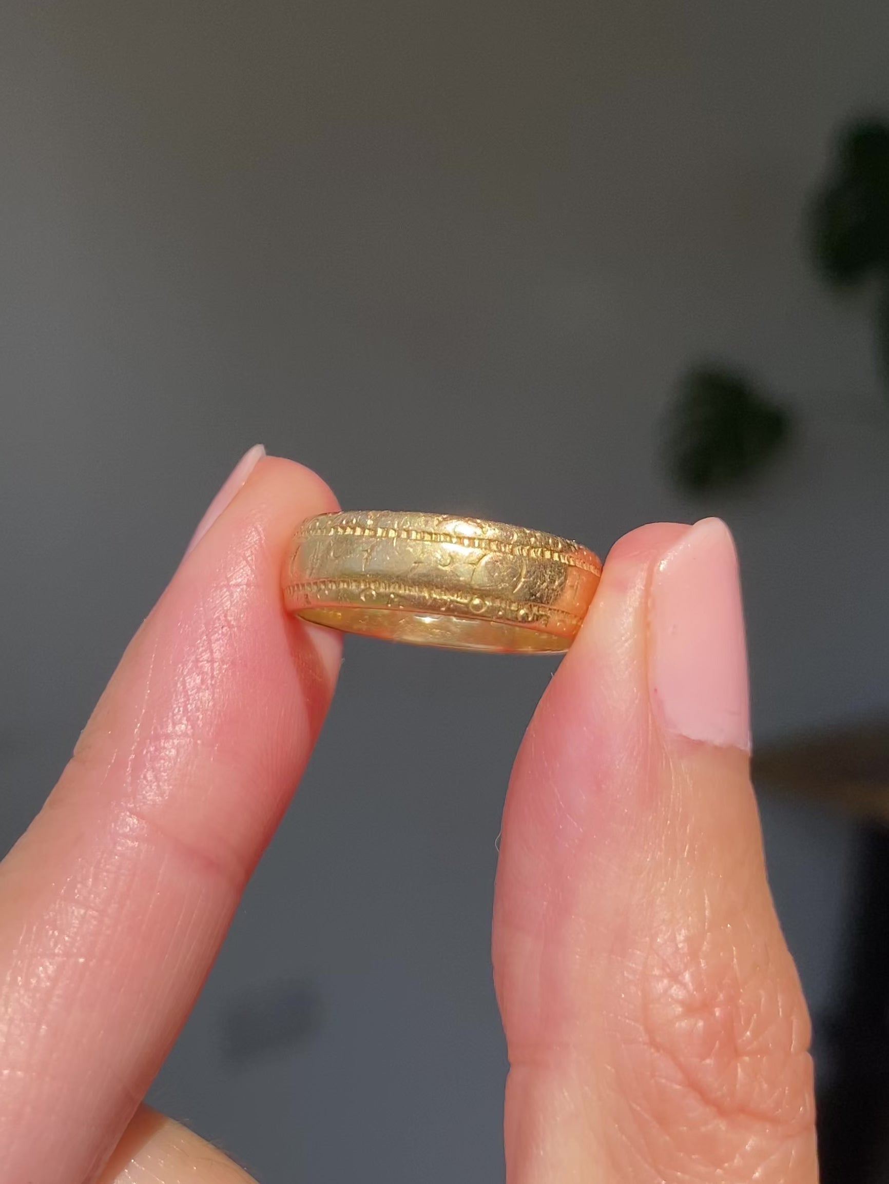 A beautiful vintage 18ct gold band. It has a faded carved floral pattern on the edges of the outer band. A gorgeous buttery yellow band with gorgeous patina.