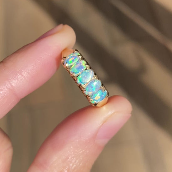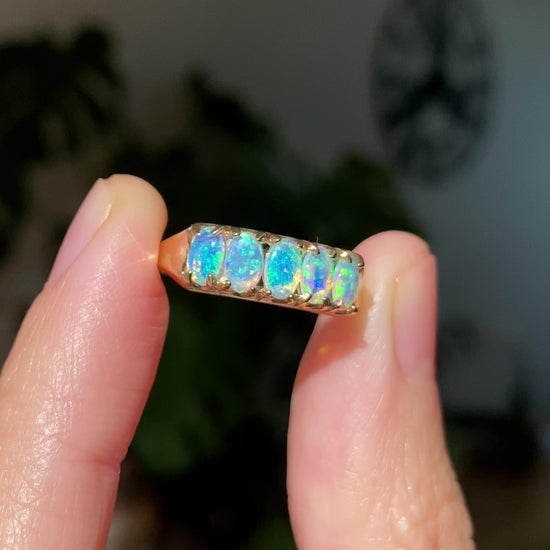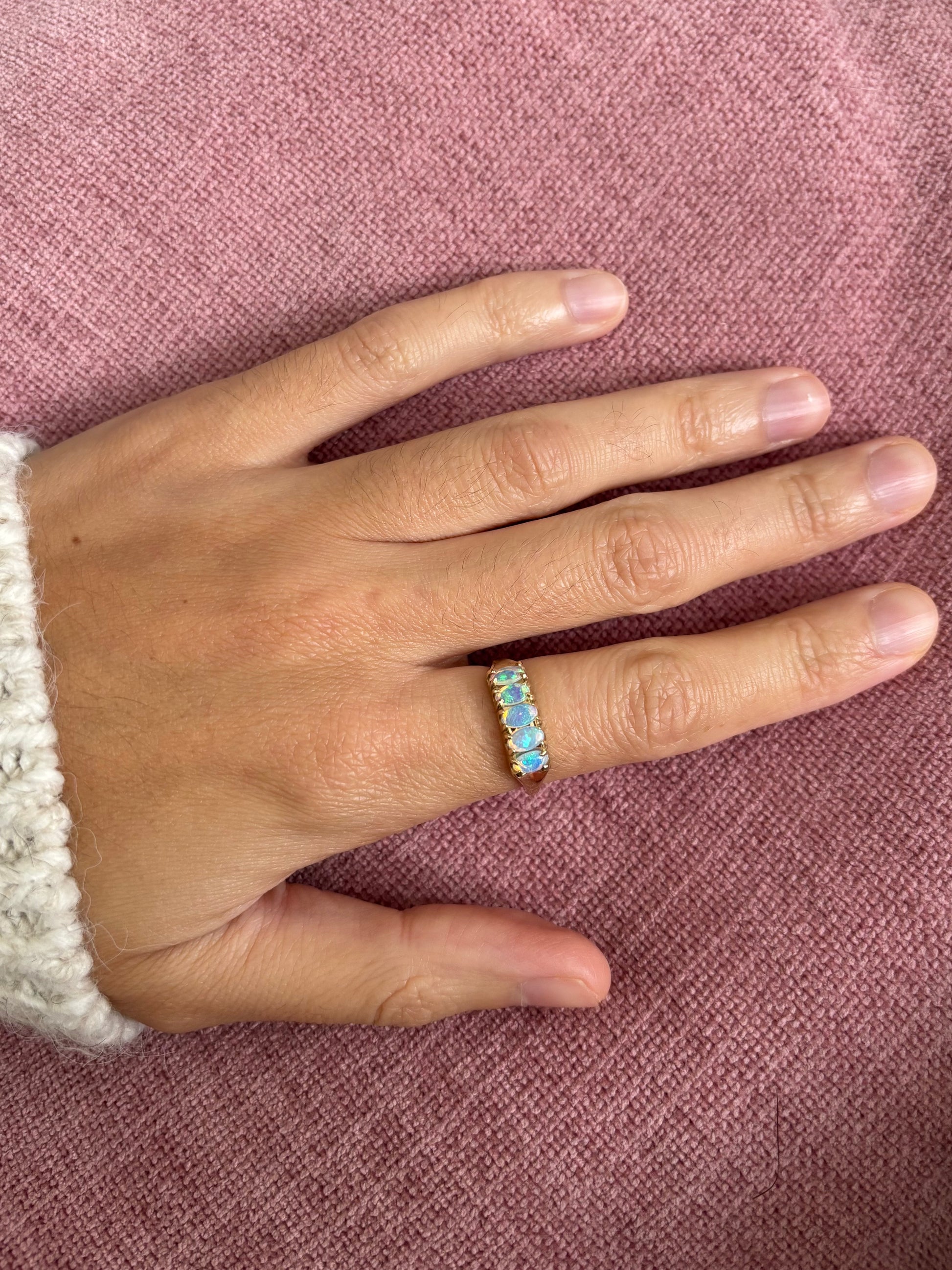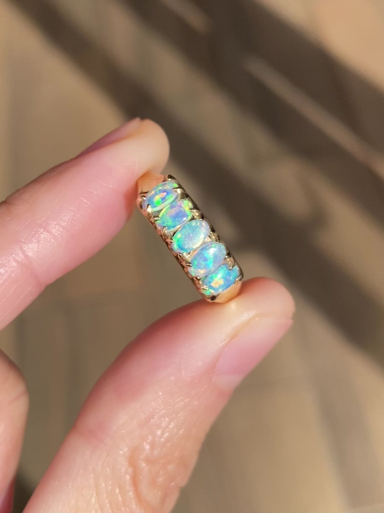 A beautiful 9ct gold 5x opal ring. The jelly opals are lovely and colourful in the sunshine, very fiery!