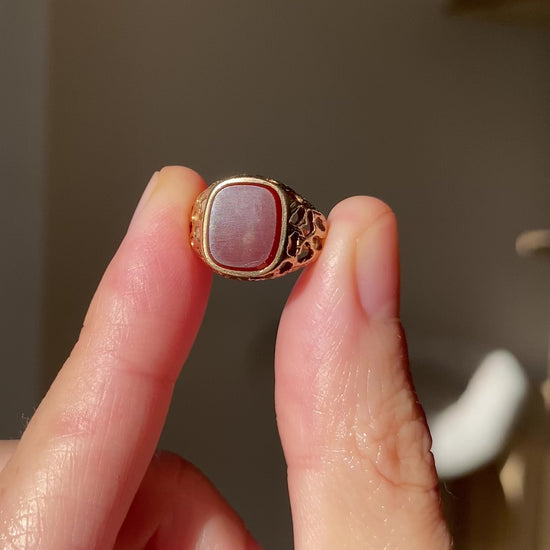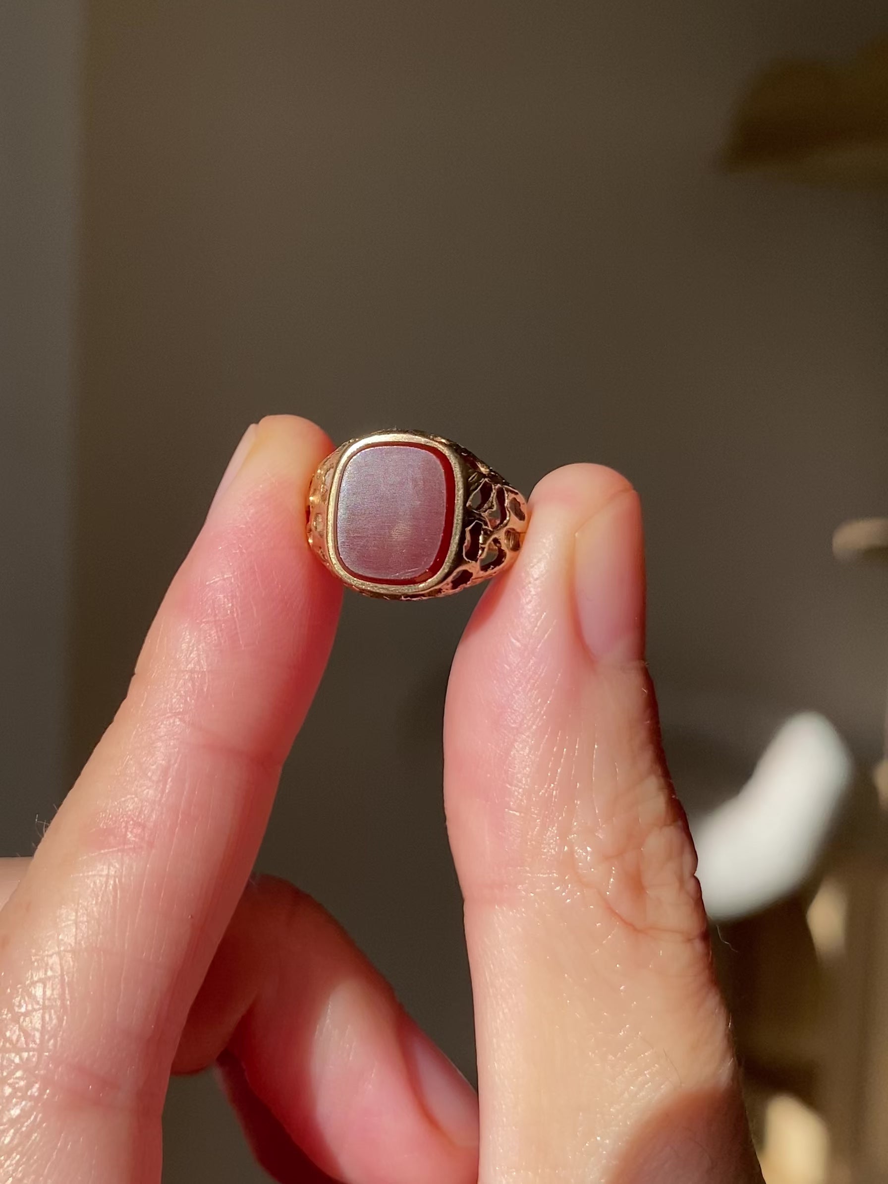 A vintage solid 9ct gold pinky ring with a carnelian gemstone, in an ornate setting.