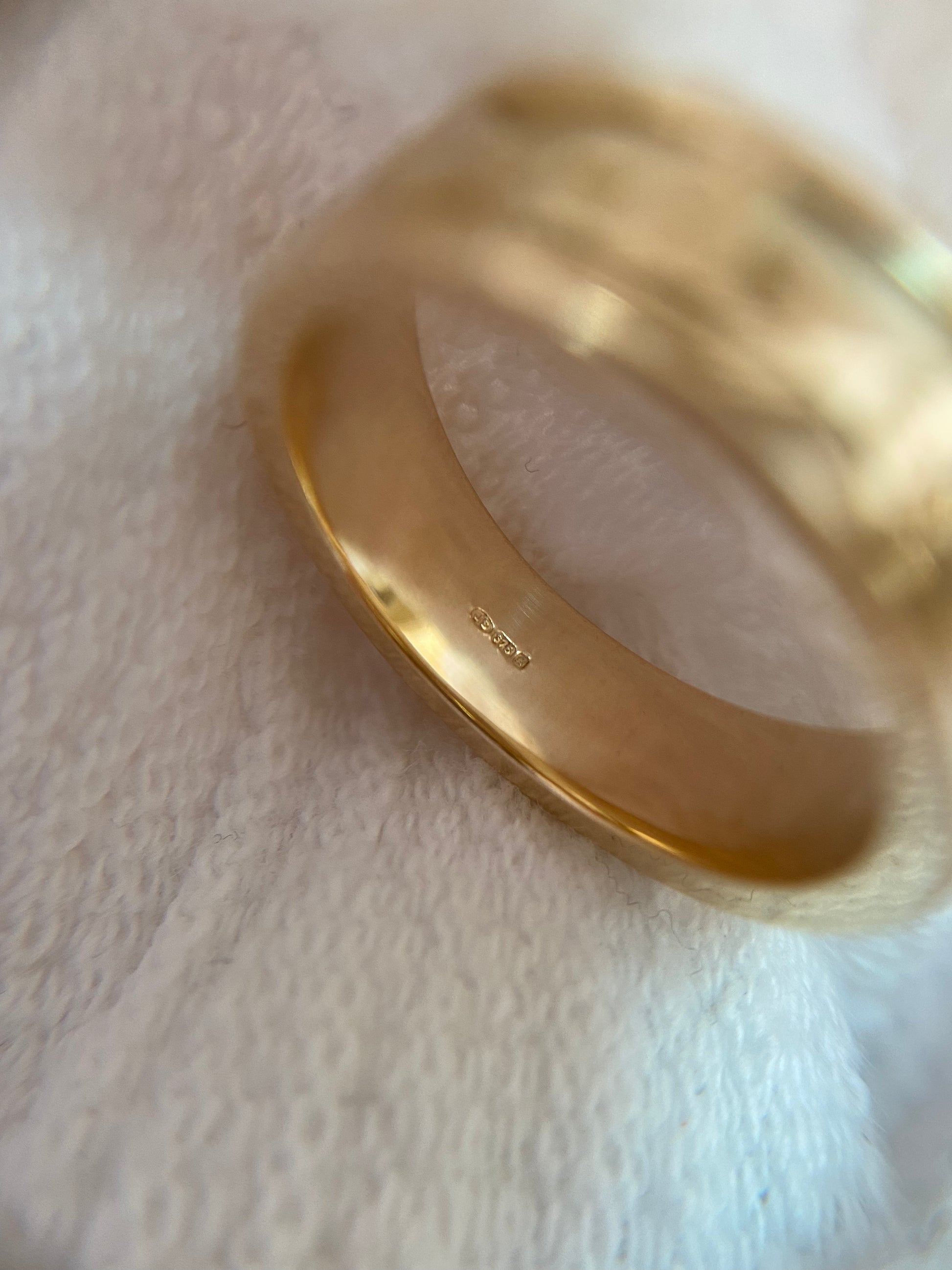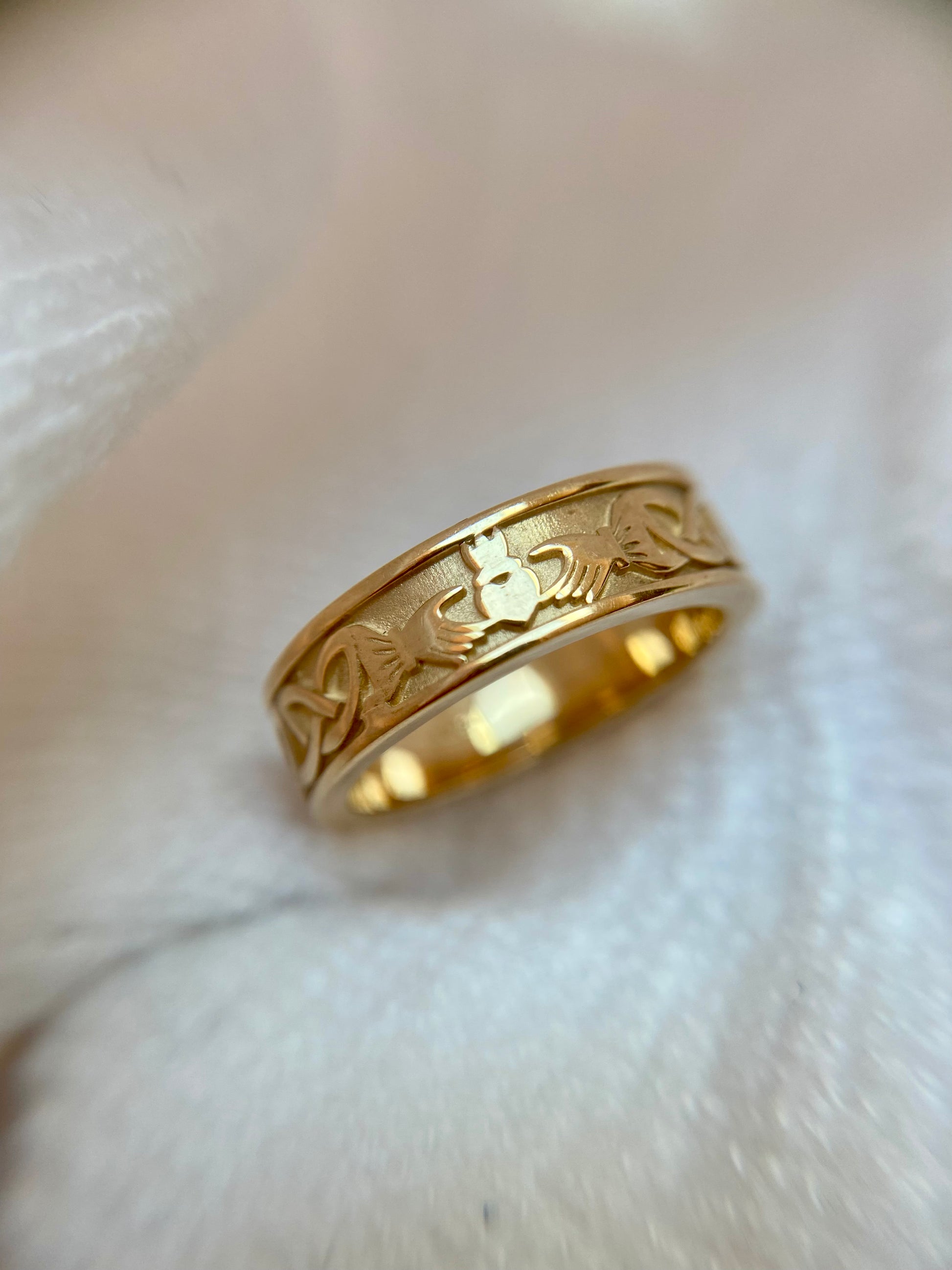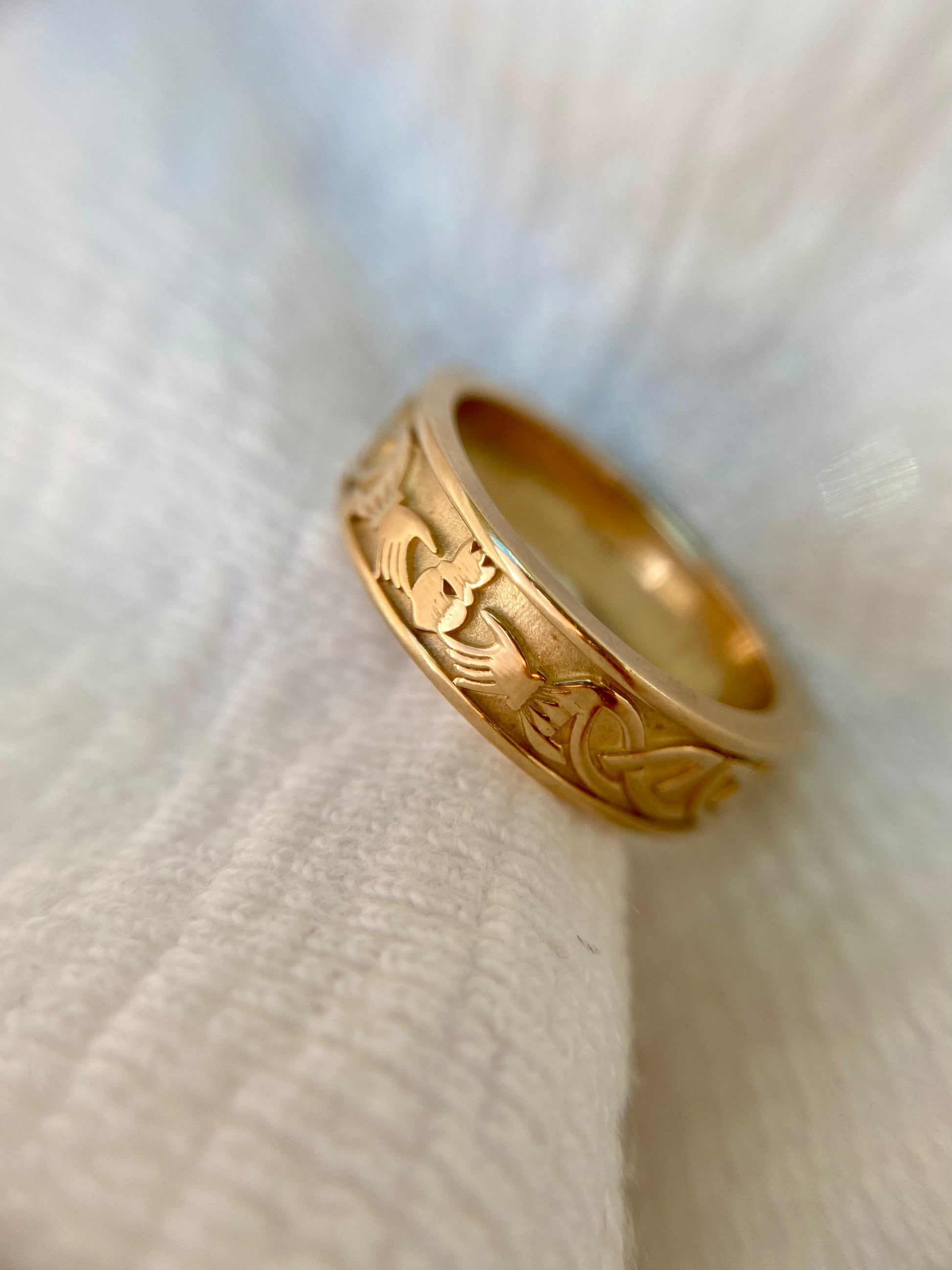 A beautiful vintage 9ct gold claddagh band ring! This ring has a lovely carving all the way around and has a great weight to the band.