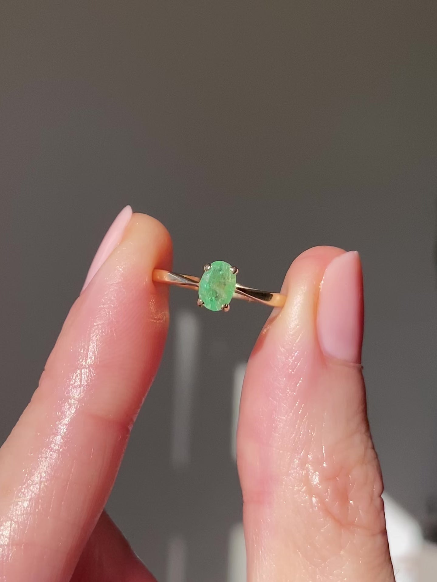 A dainty vintage 9ct gold emerald solitaire ring.