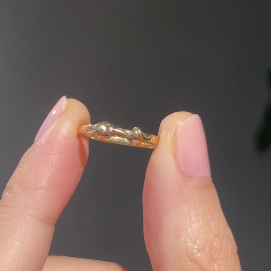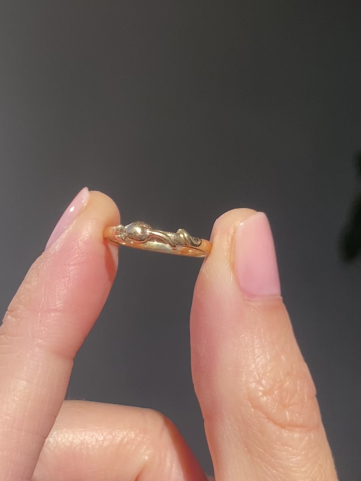 A sweet solid 9ct gold ring with a mouse sitting on the top of the band with its tail wrapping around.