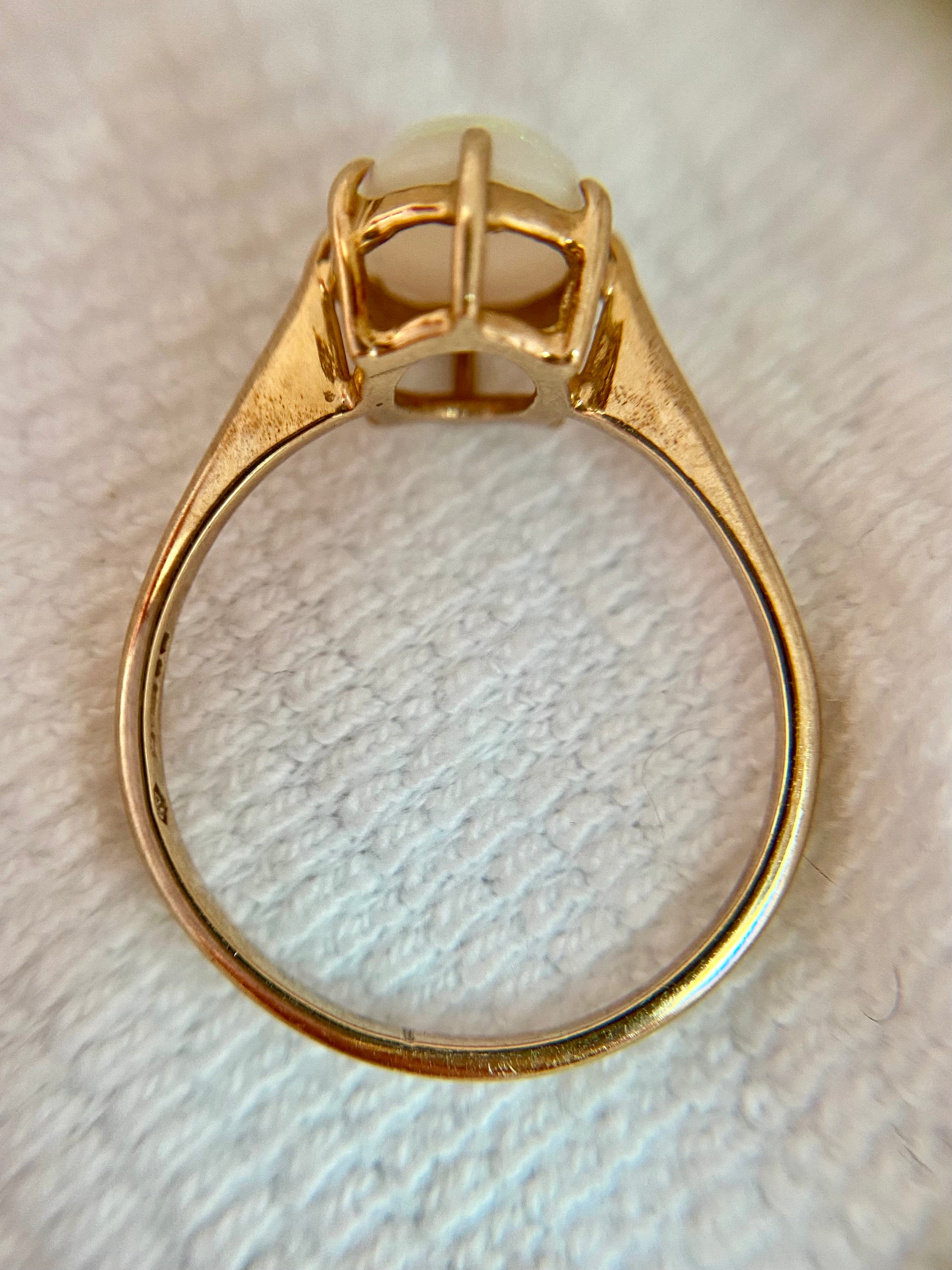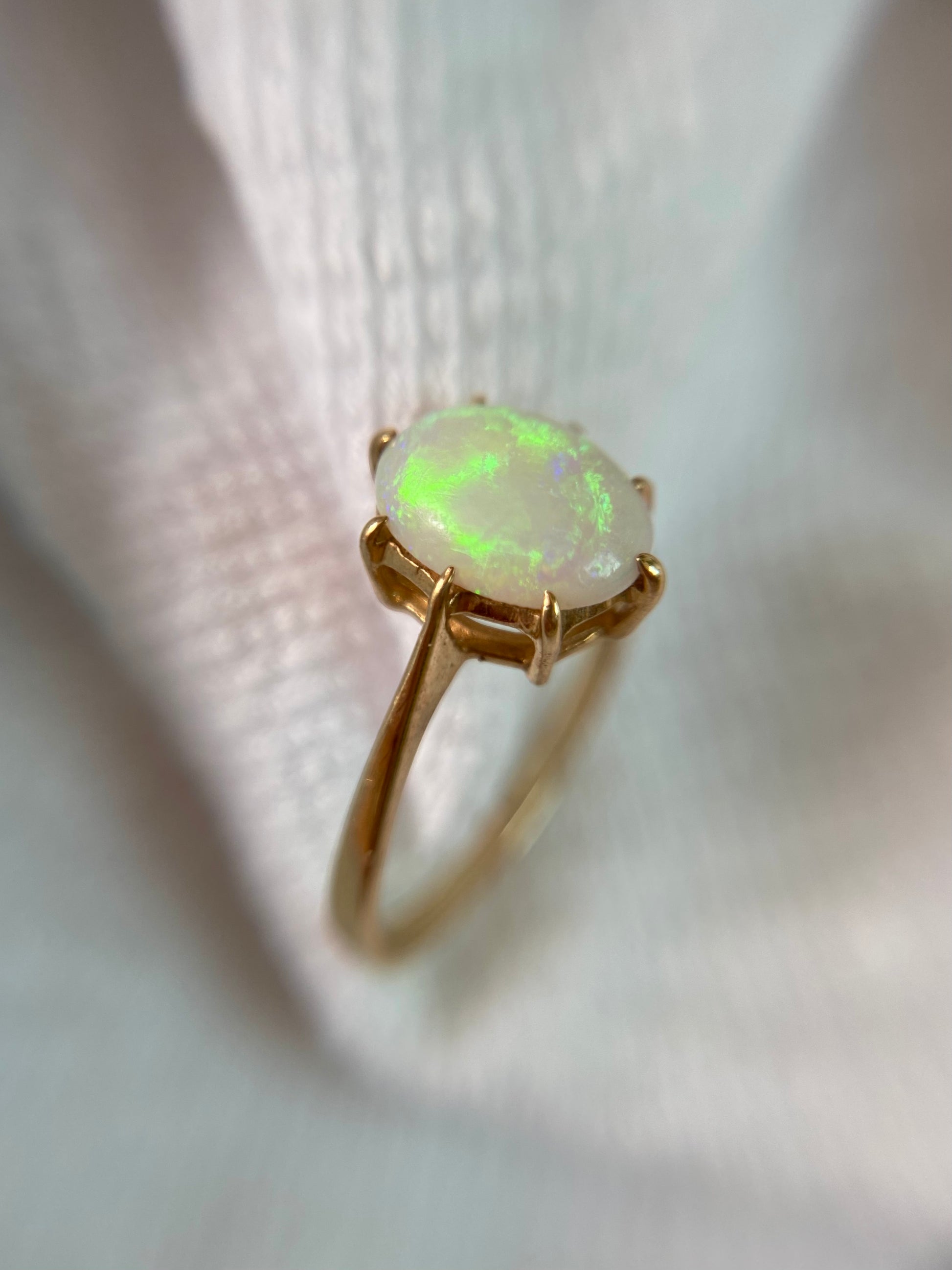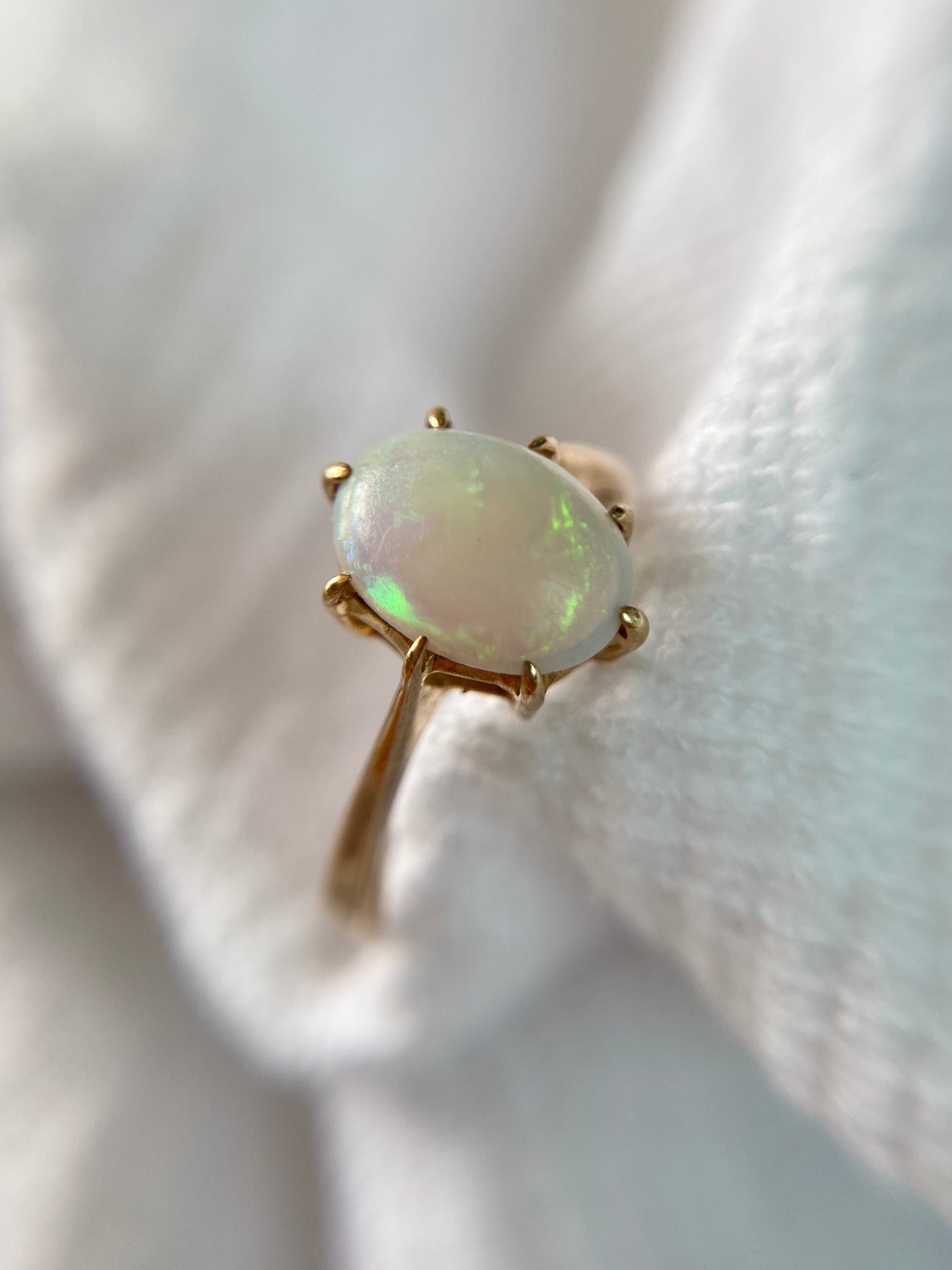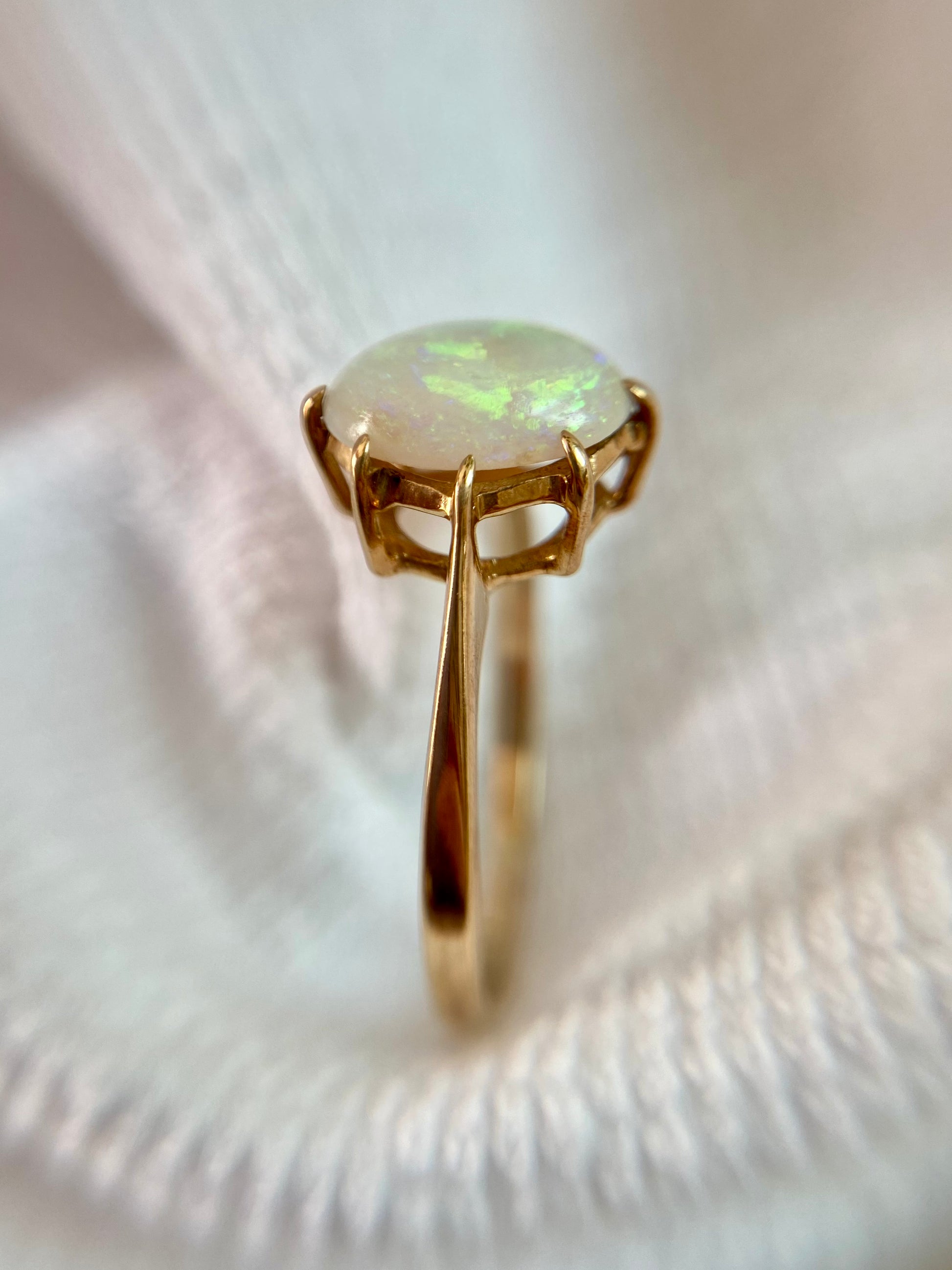 A gorgeous vintage 9ct gold opal solitaire ring. This opal is a milky white colour in most lights with bright green/yellow flashes in some angles.