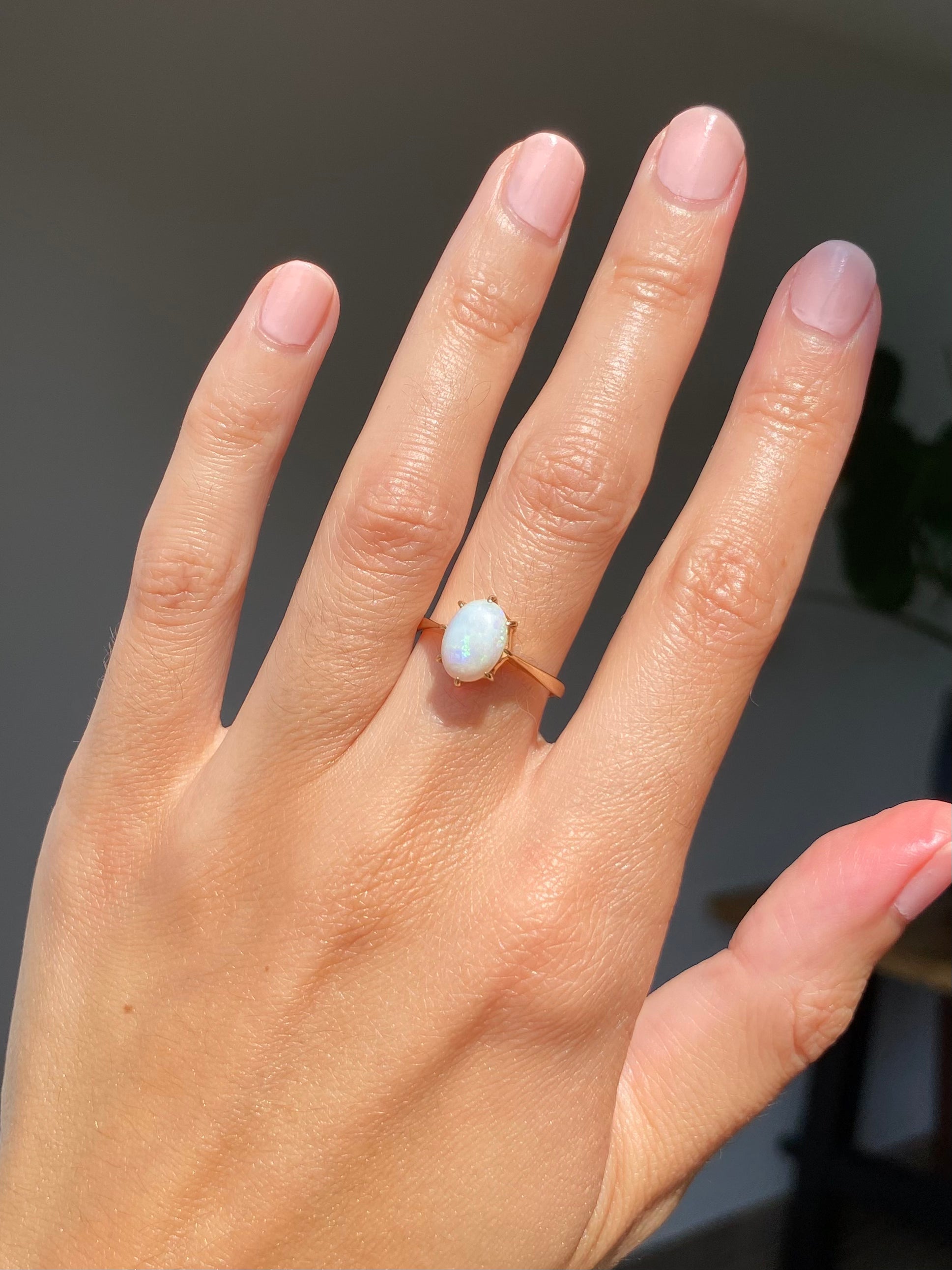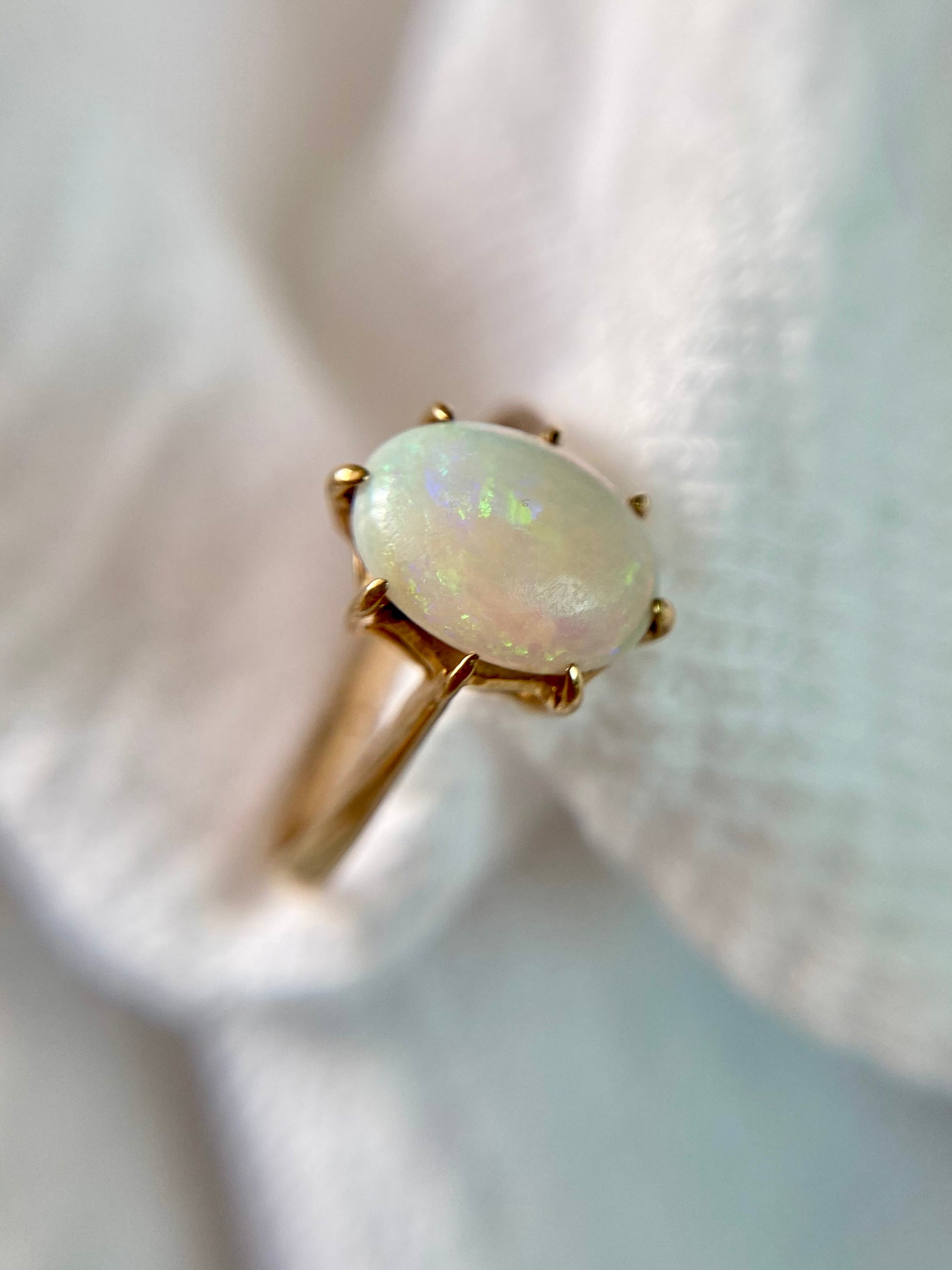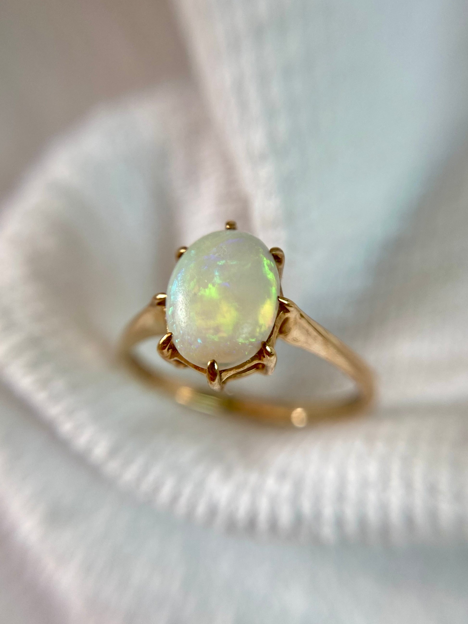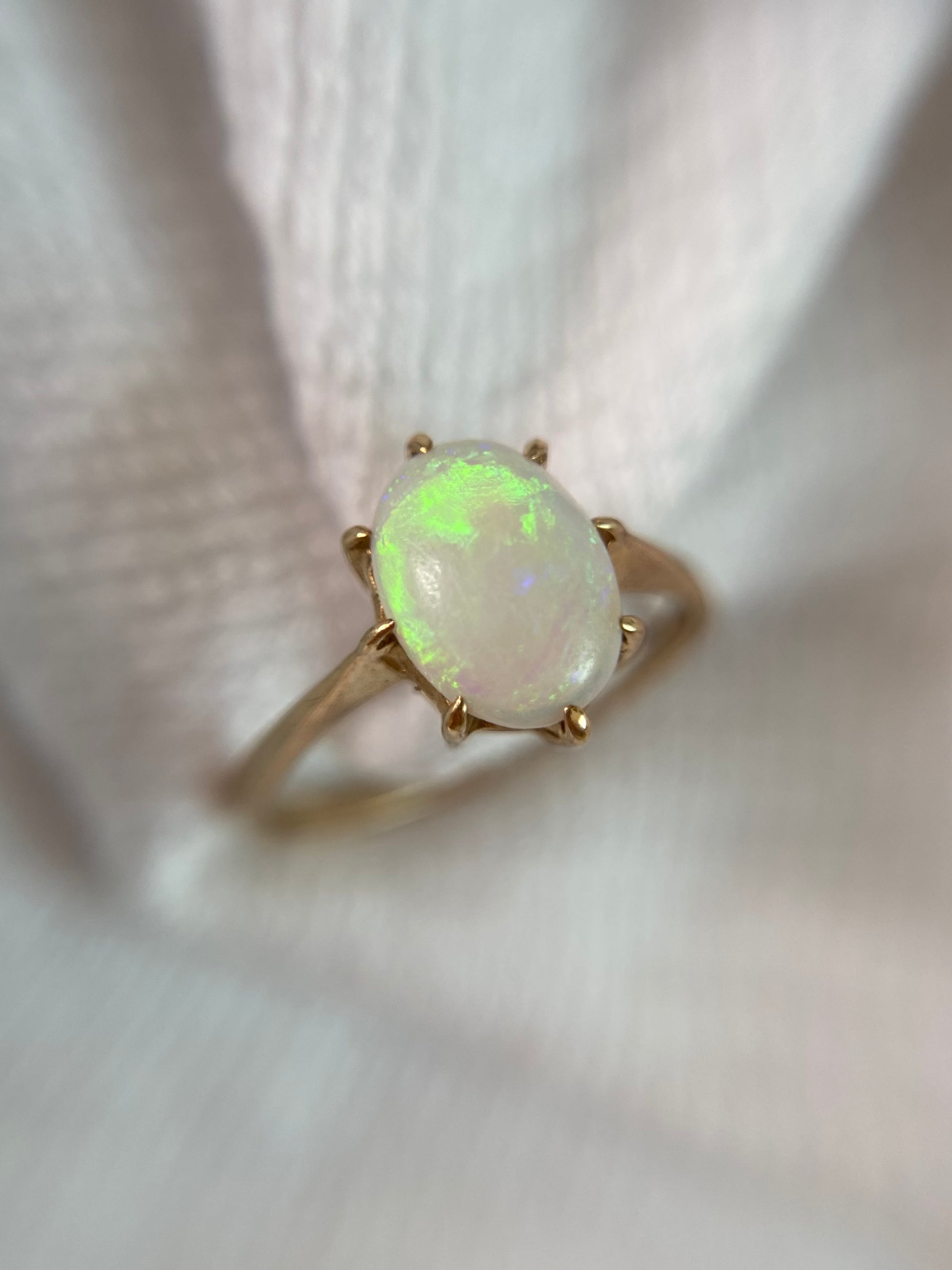 A gorgeous vintage 9ct gold opal solitaire ring. This opal is a milky white colour in most lights with bright green/yellow flashes in some angles.