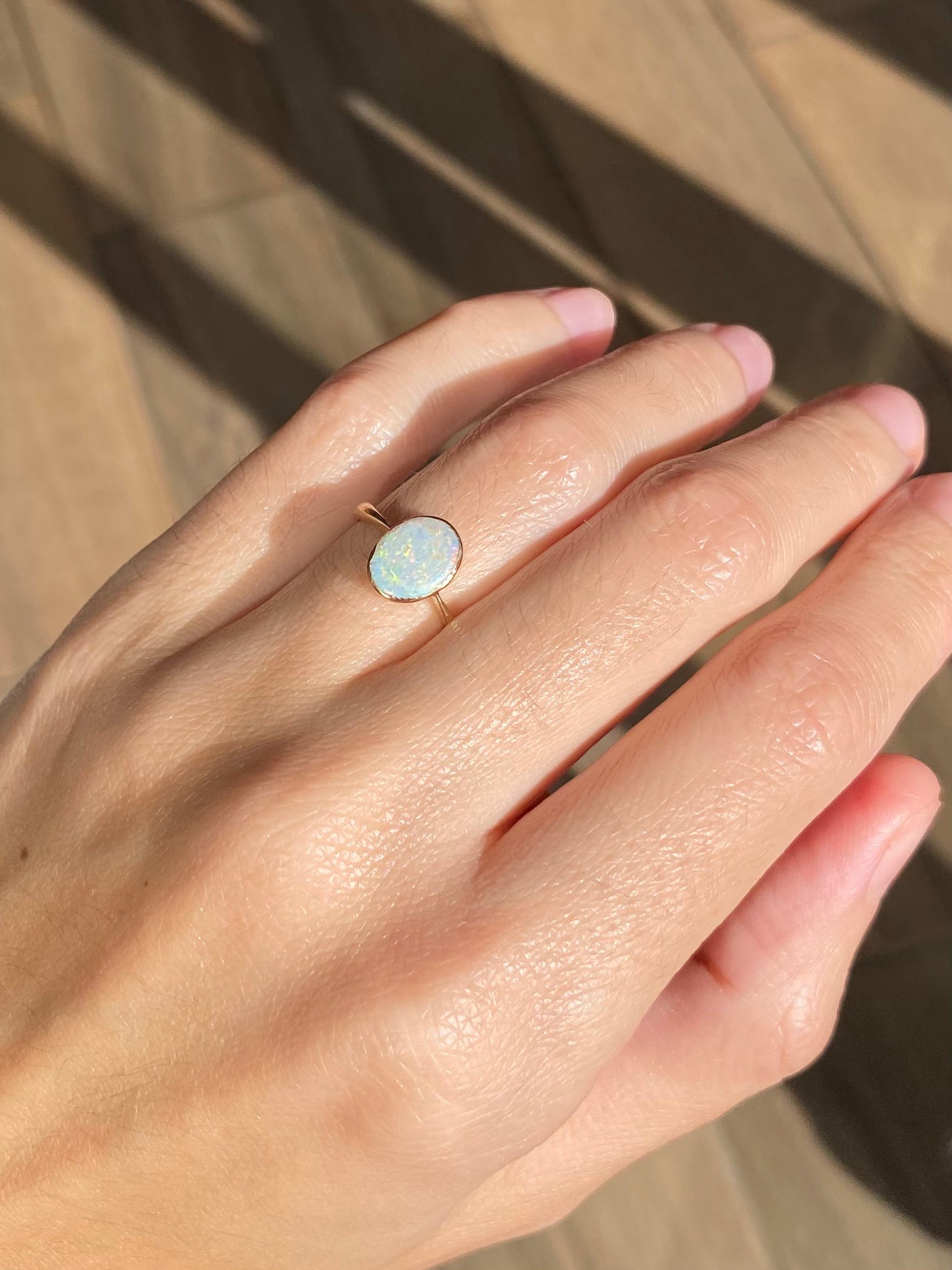 Things to note: The opal is not shiny and has surface scratches to it. The edge of the bezel setting has an organic finish, with an uneven edge.
