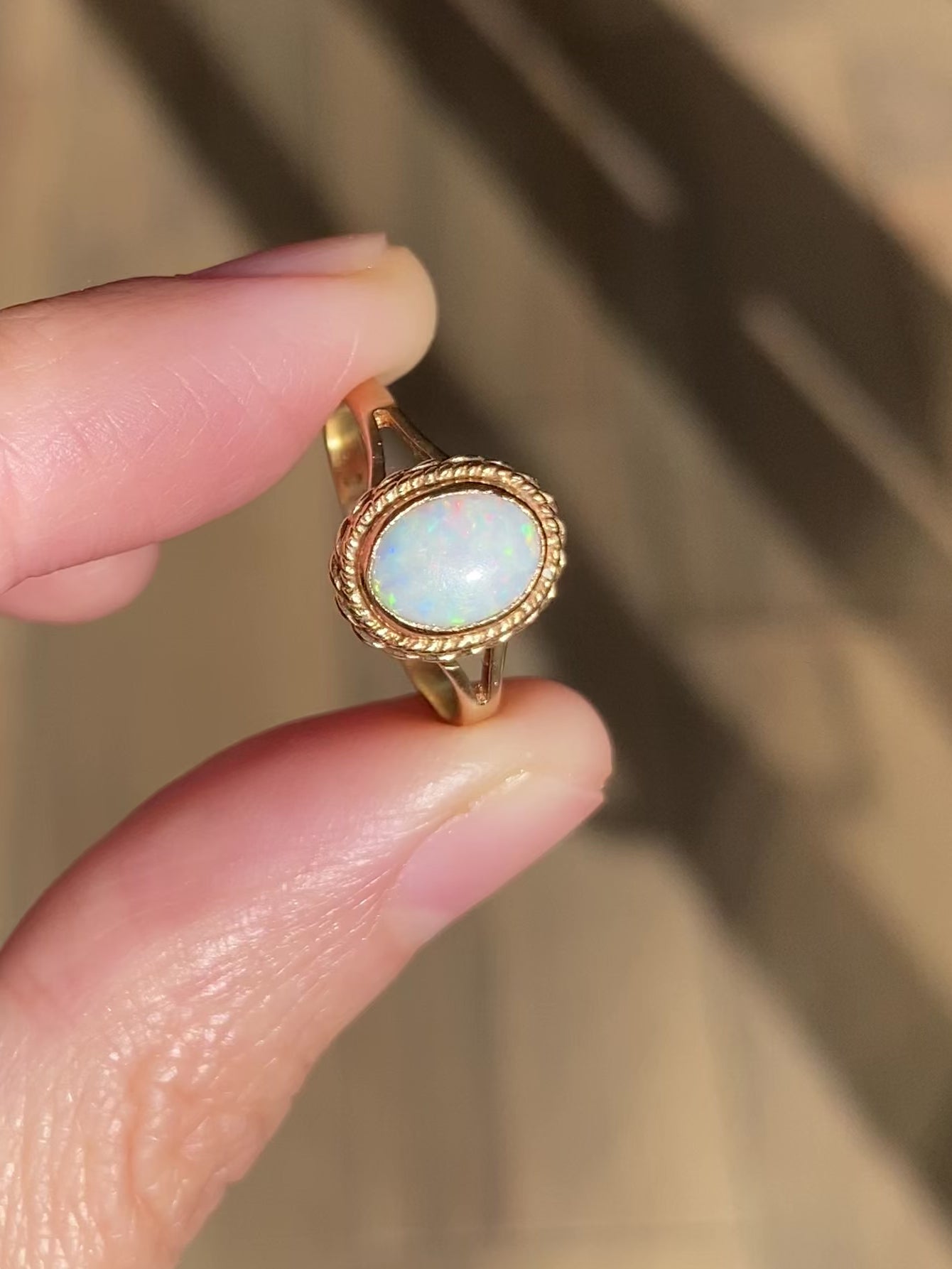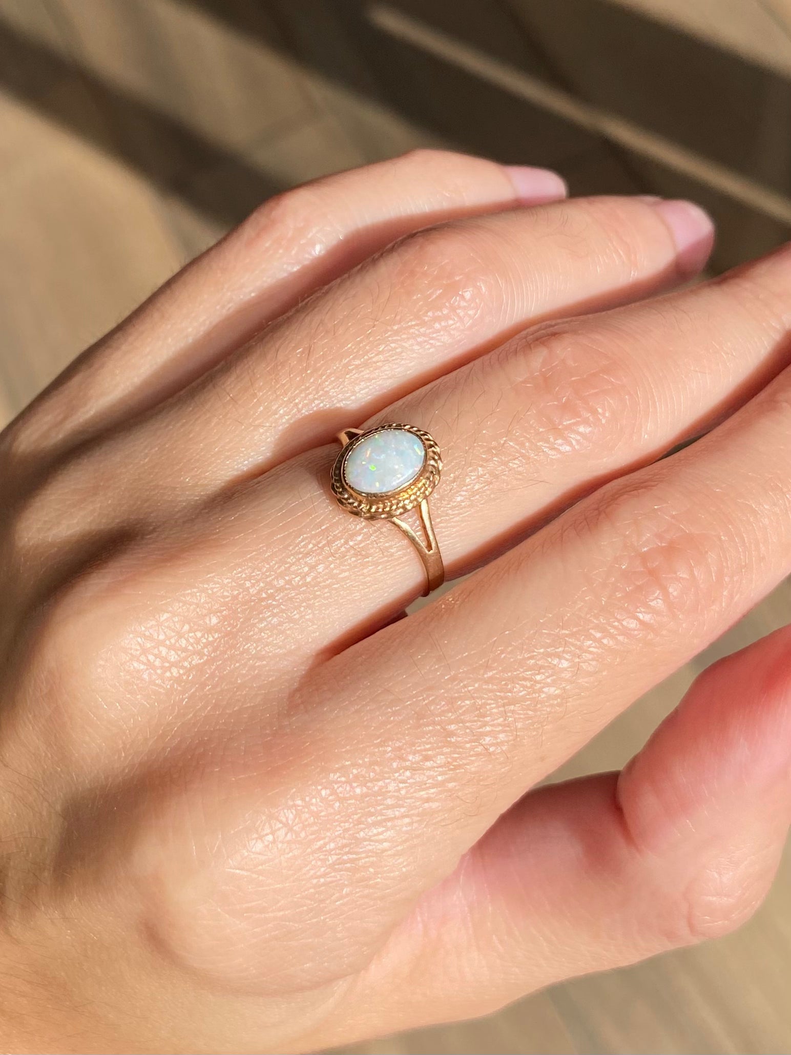 A pretty vintage 9ct gold opal solitaire ring with rope detailing.