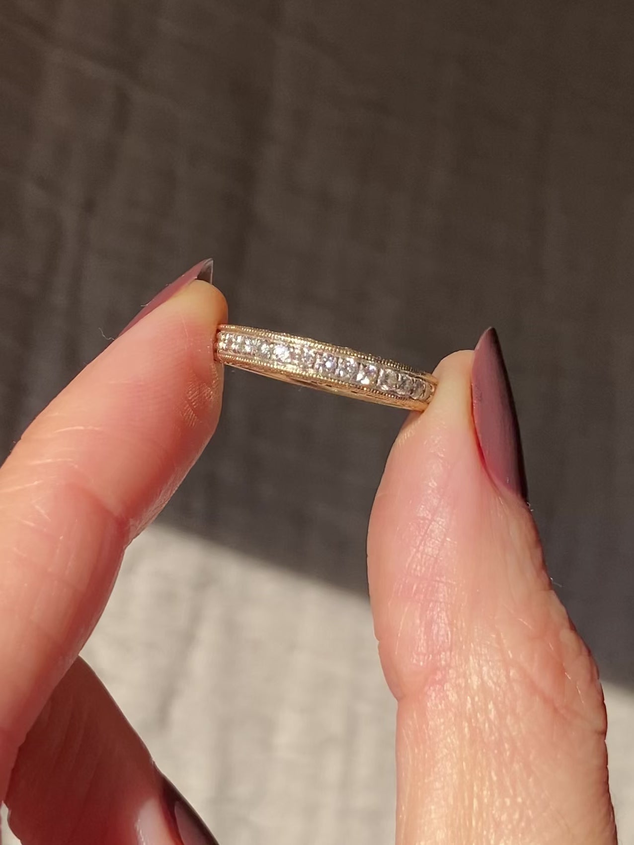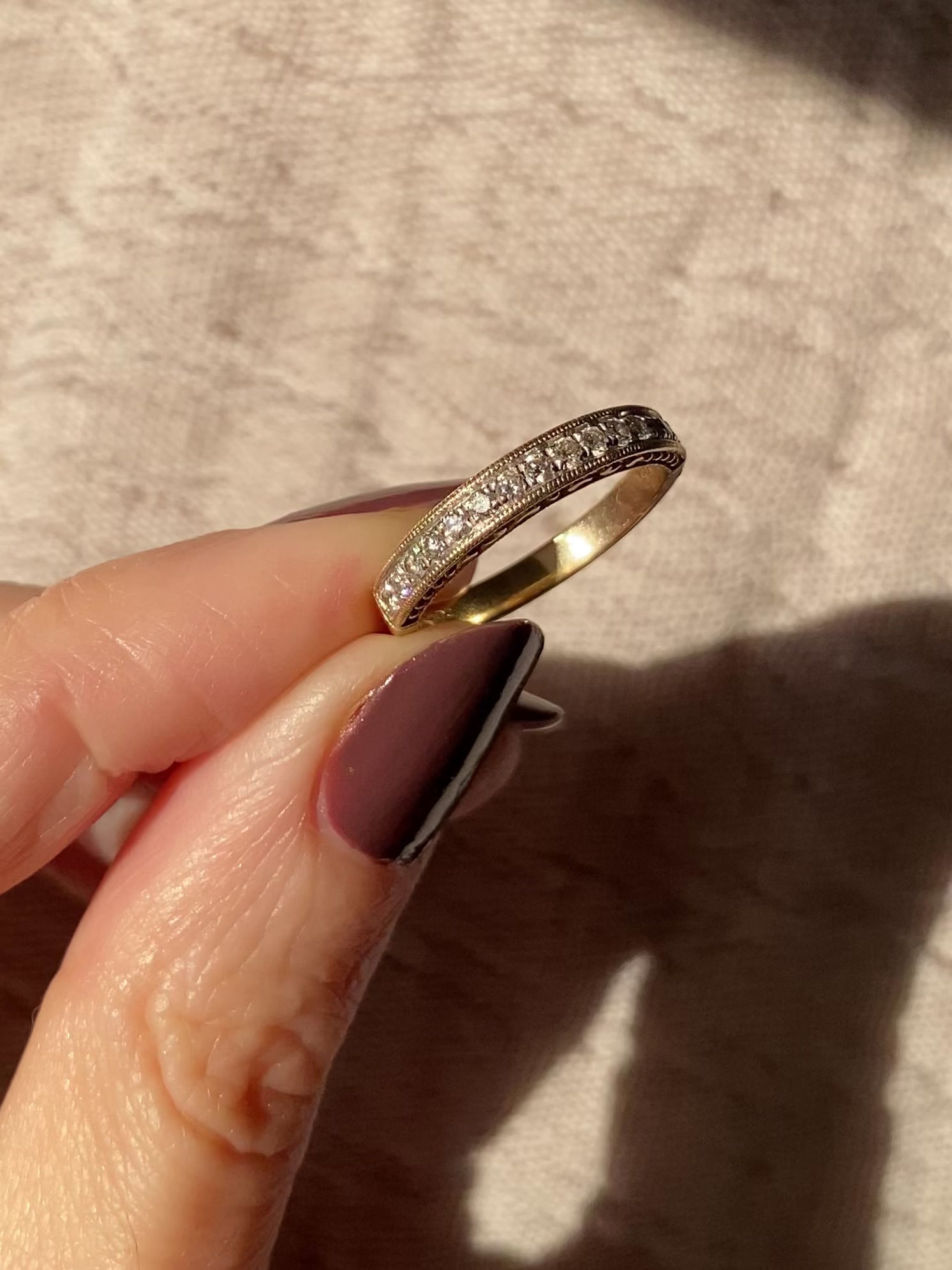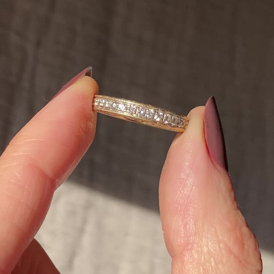 A very beautiful 9ct gold diamond half eternity ring. This ring has a row of 15 diamonds in a milgrain setting with a decorative profile.
