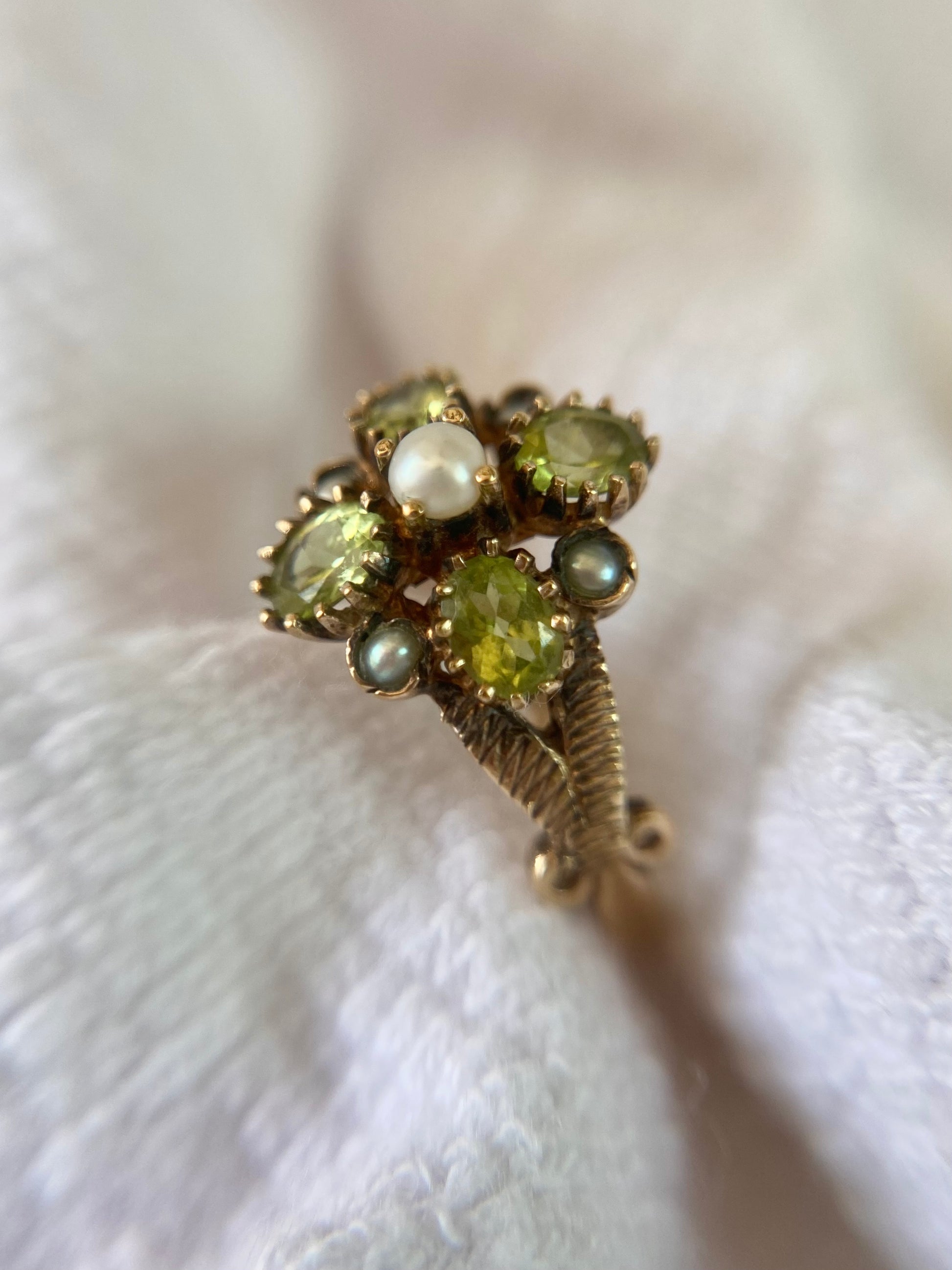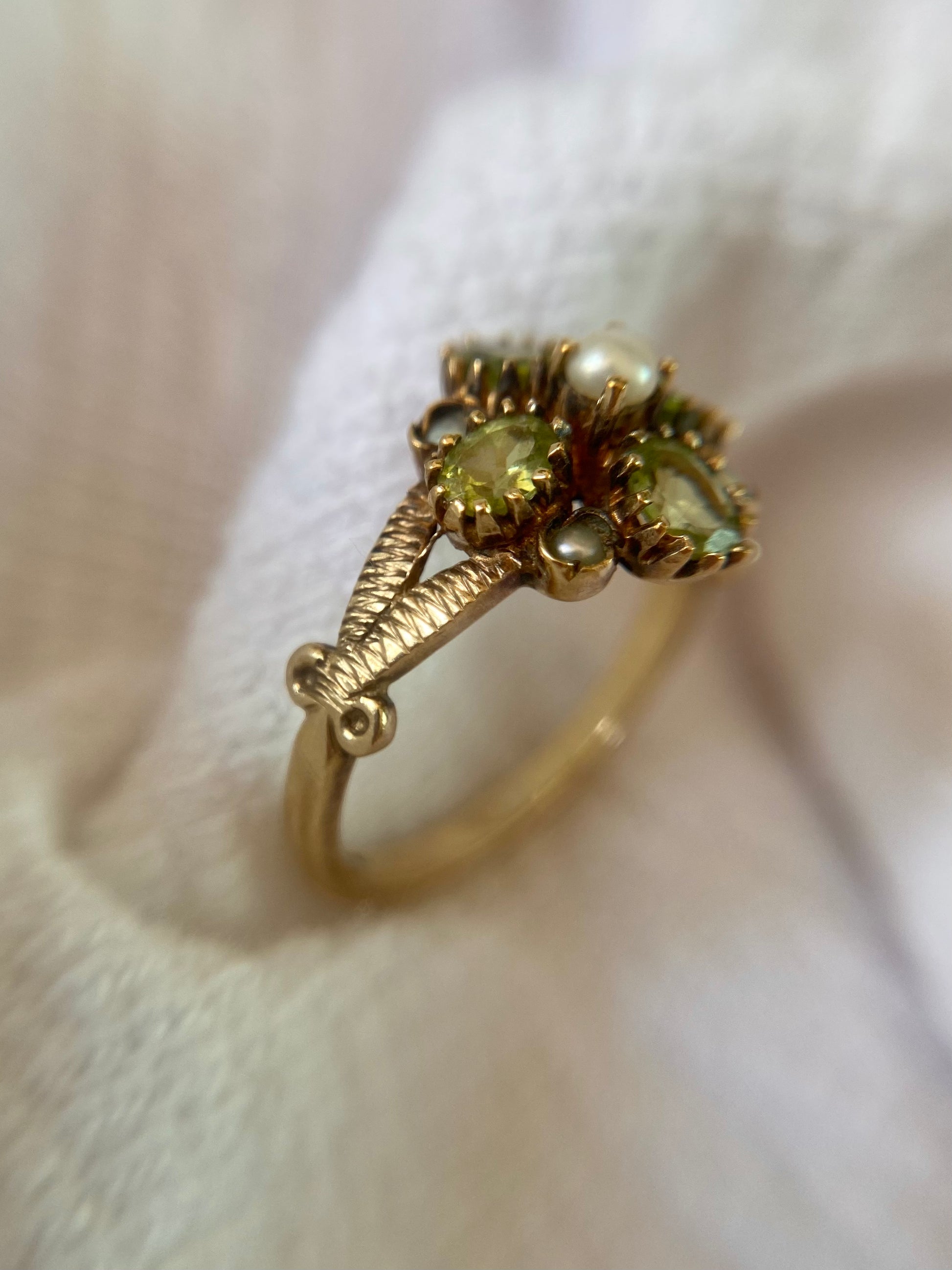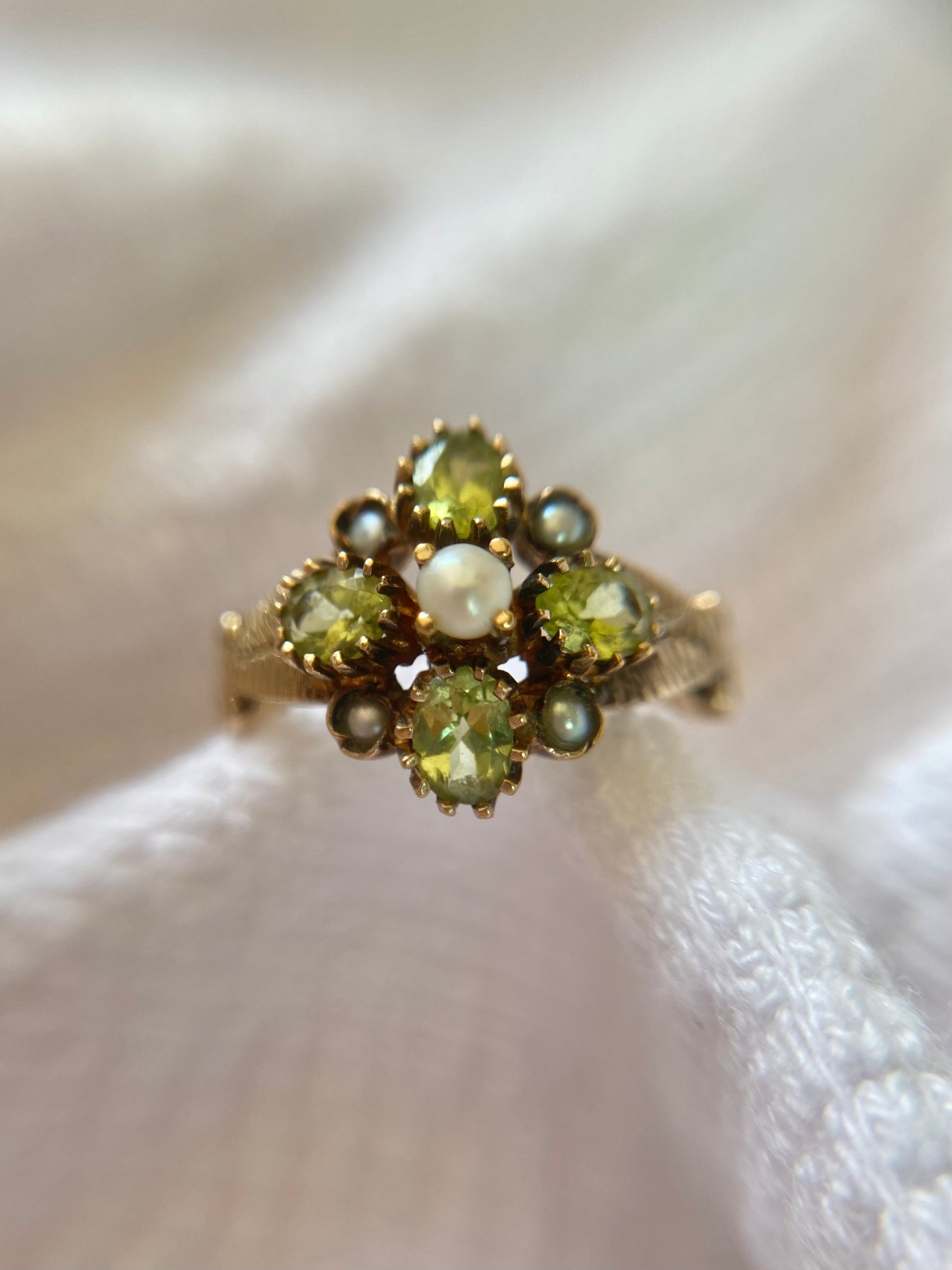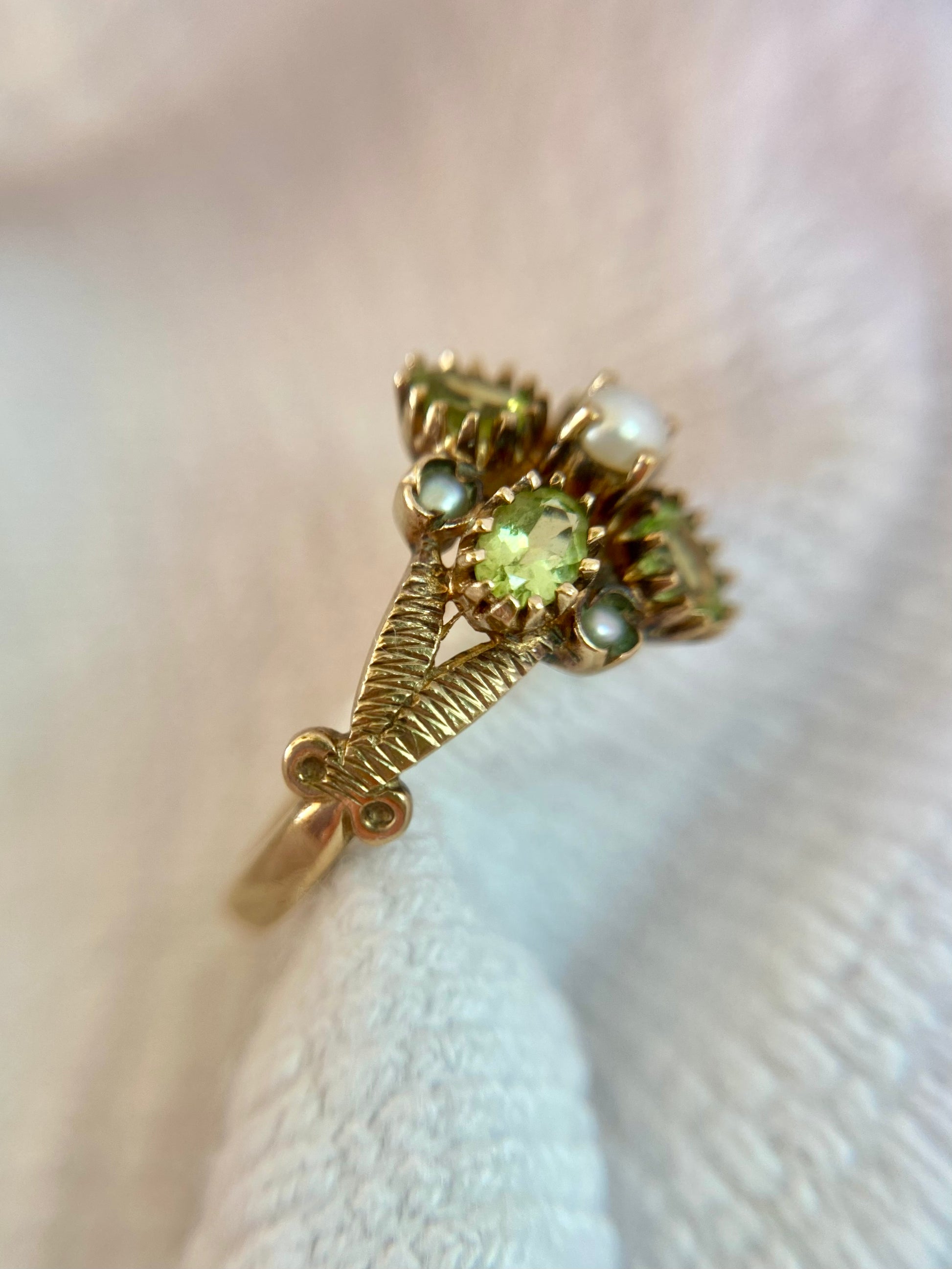 A beautiful vintage 9ct gold peridot and seed pearl ring.