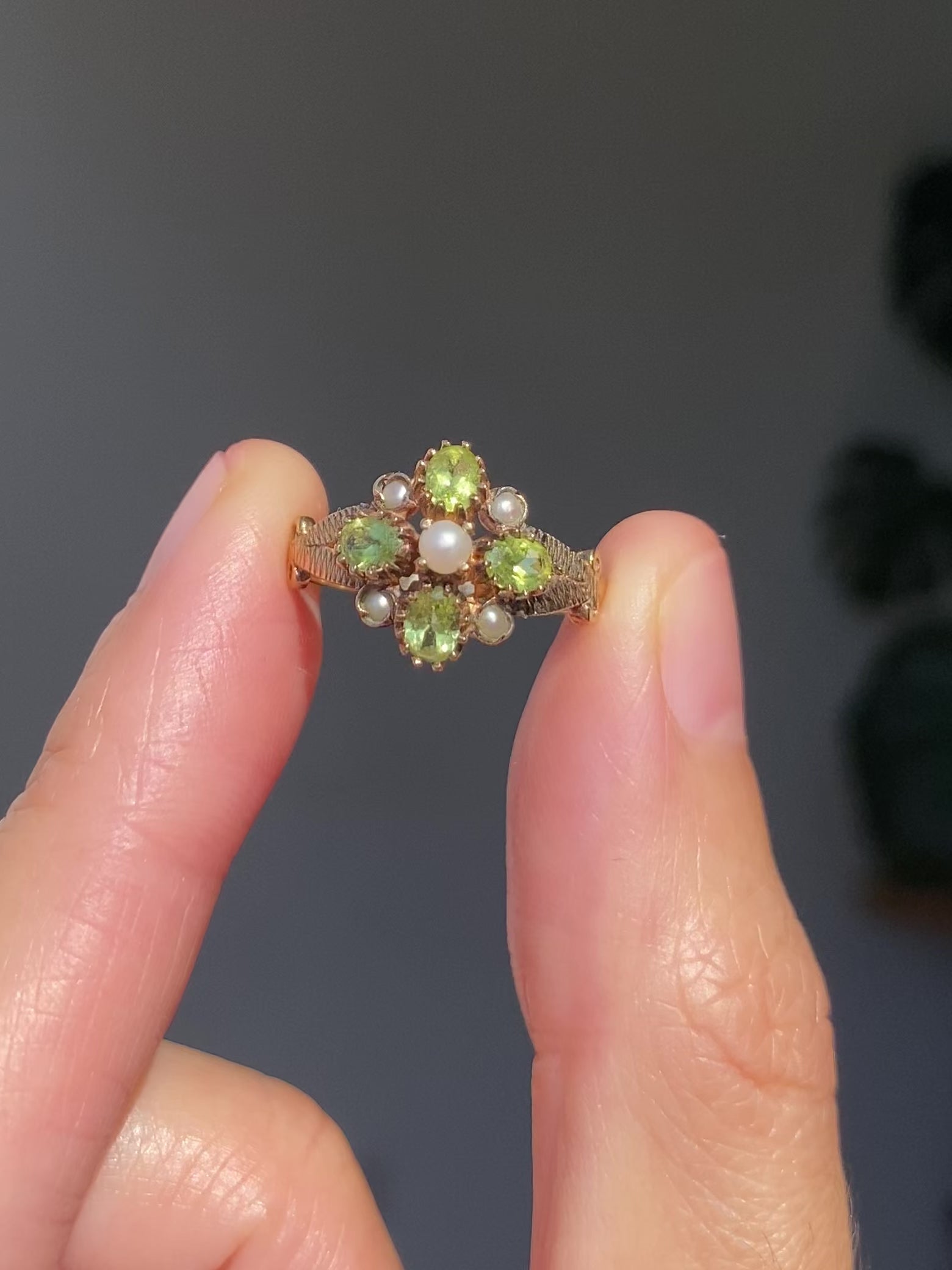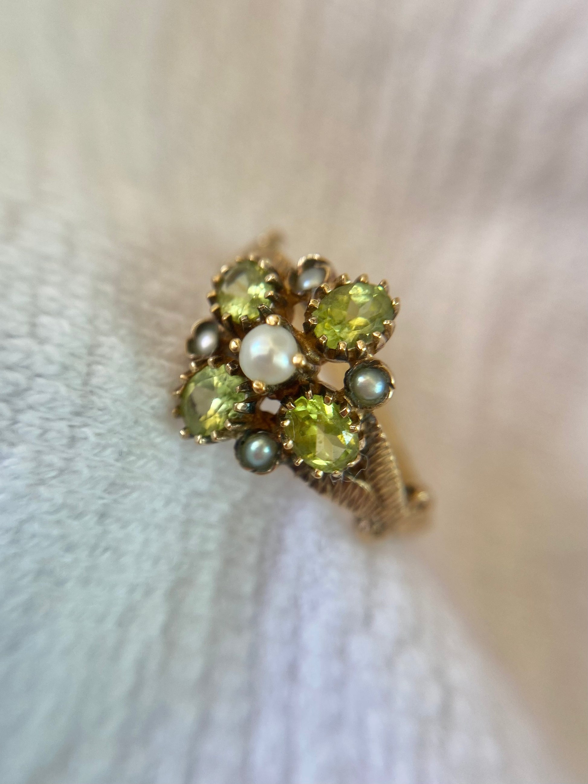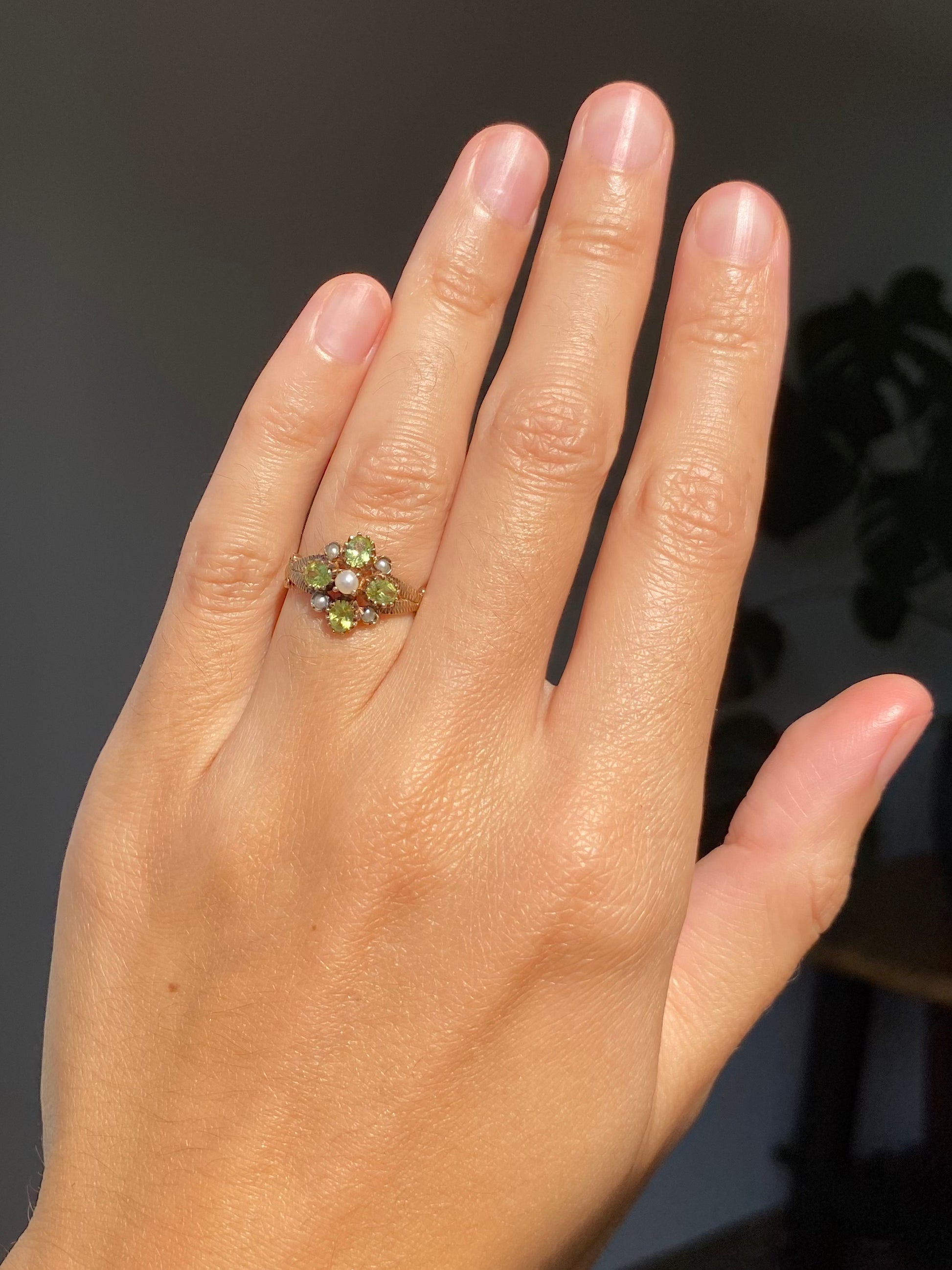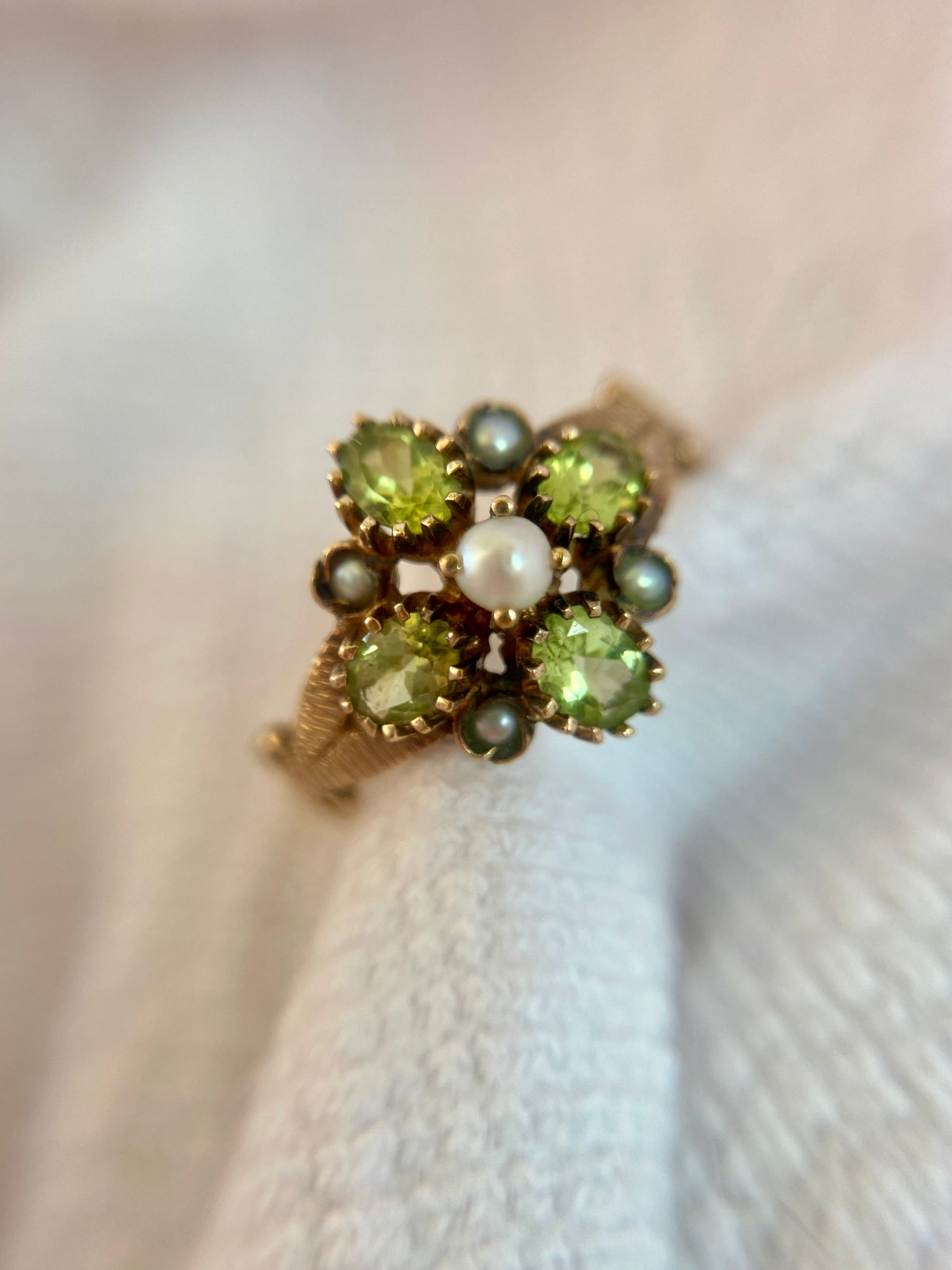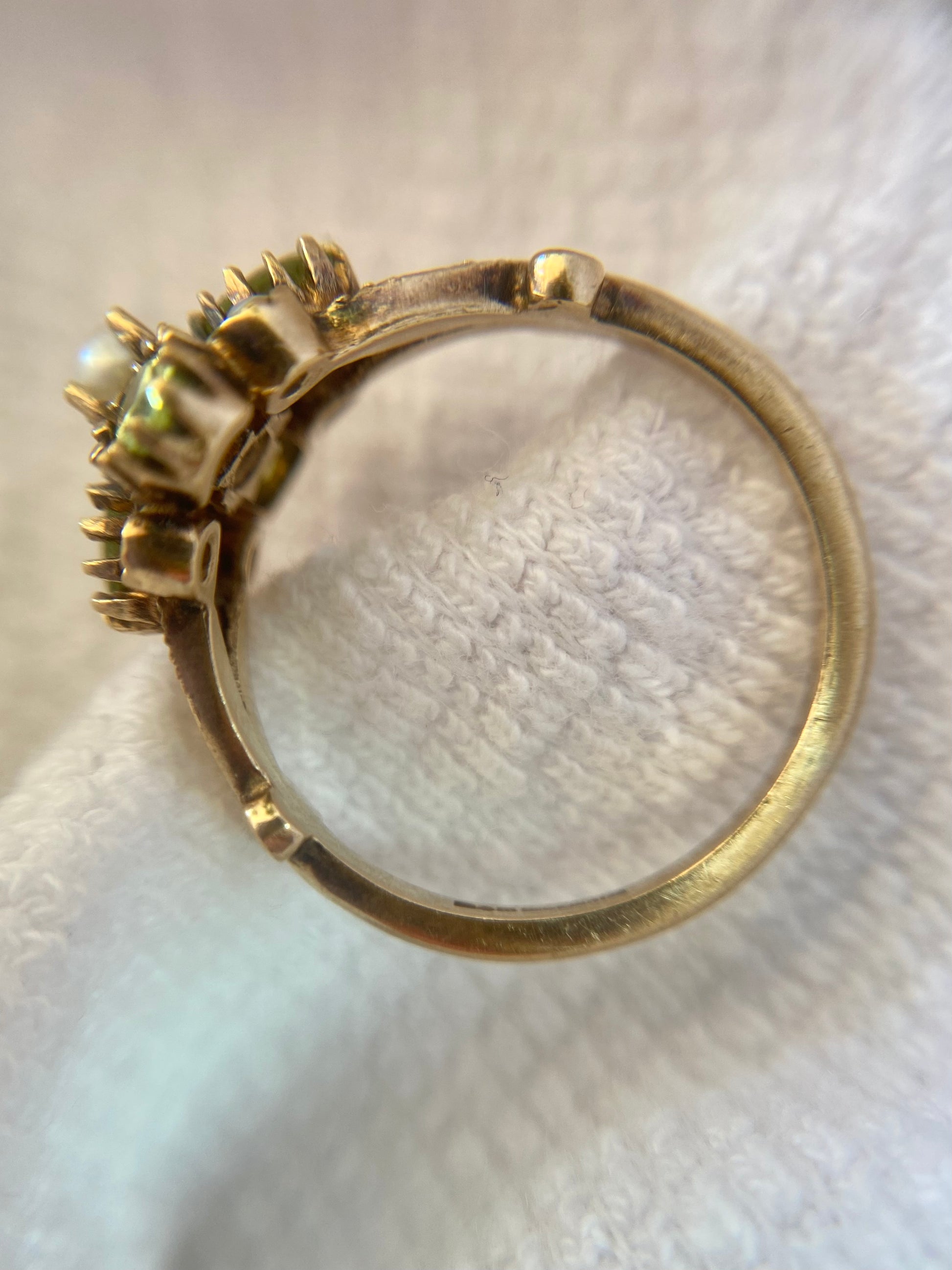 A beautiful vintage 9ct gold peridot and seed pearl ring.