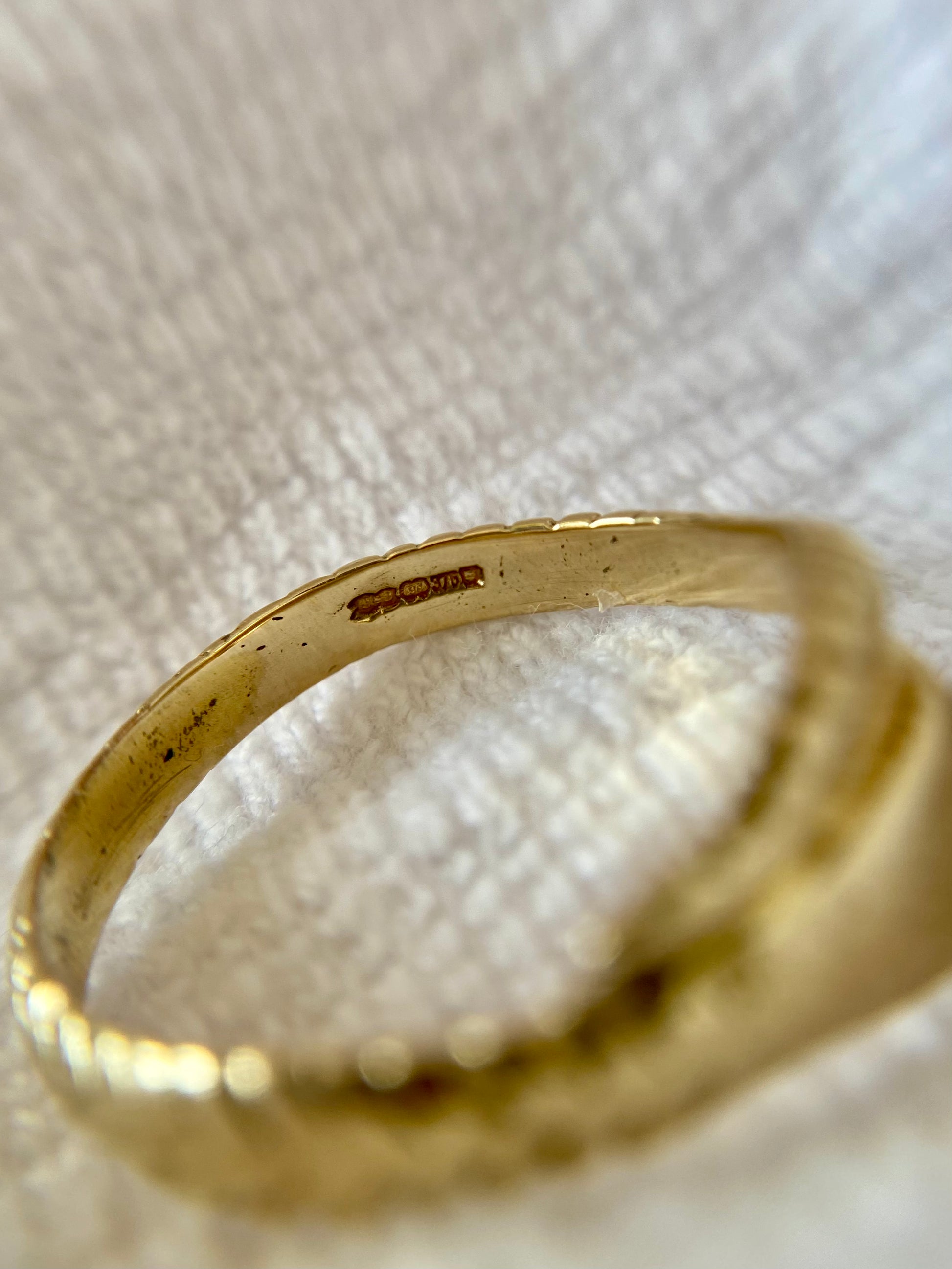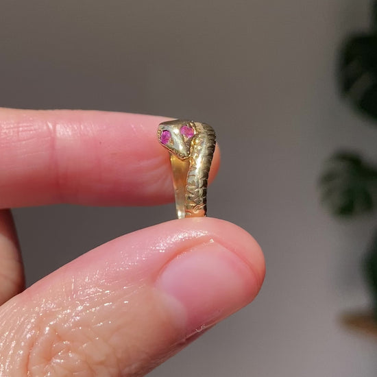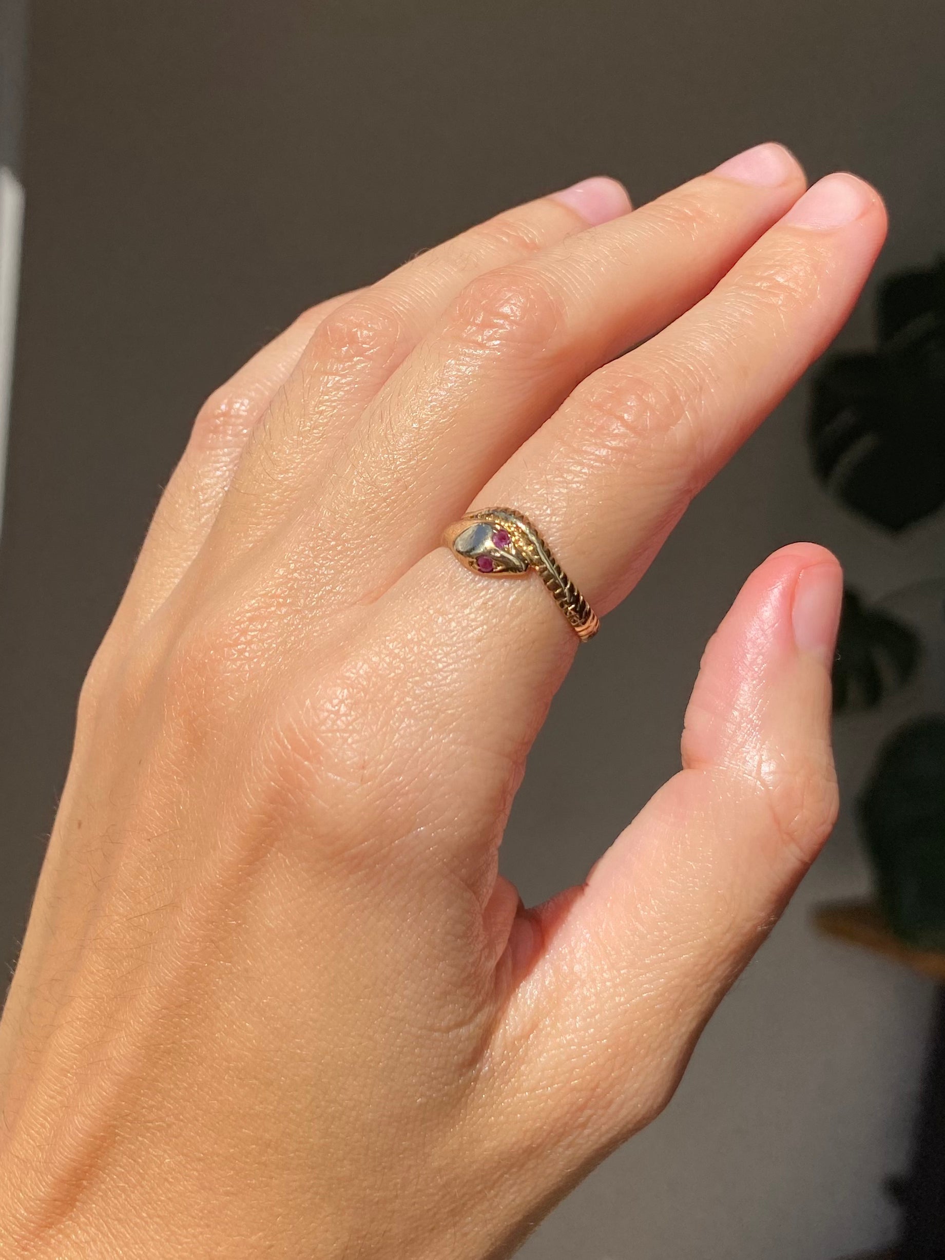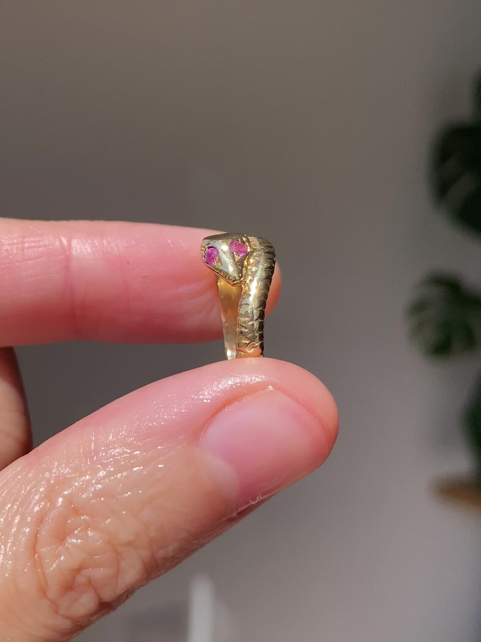 A vintage solid 9ct gold snake ring with 2 ruby eyes.