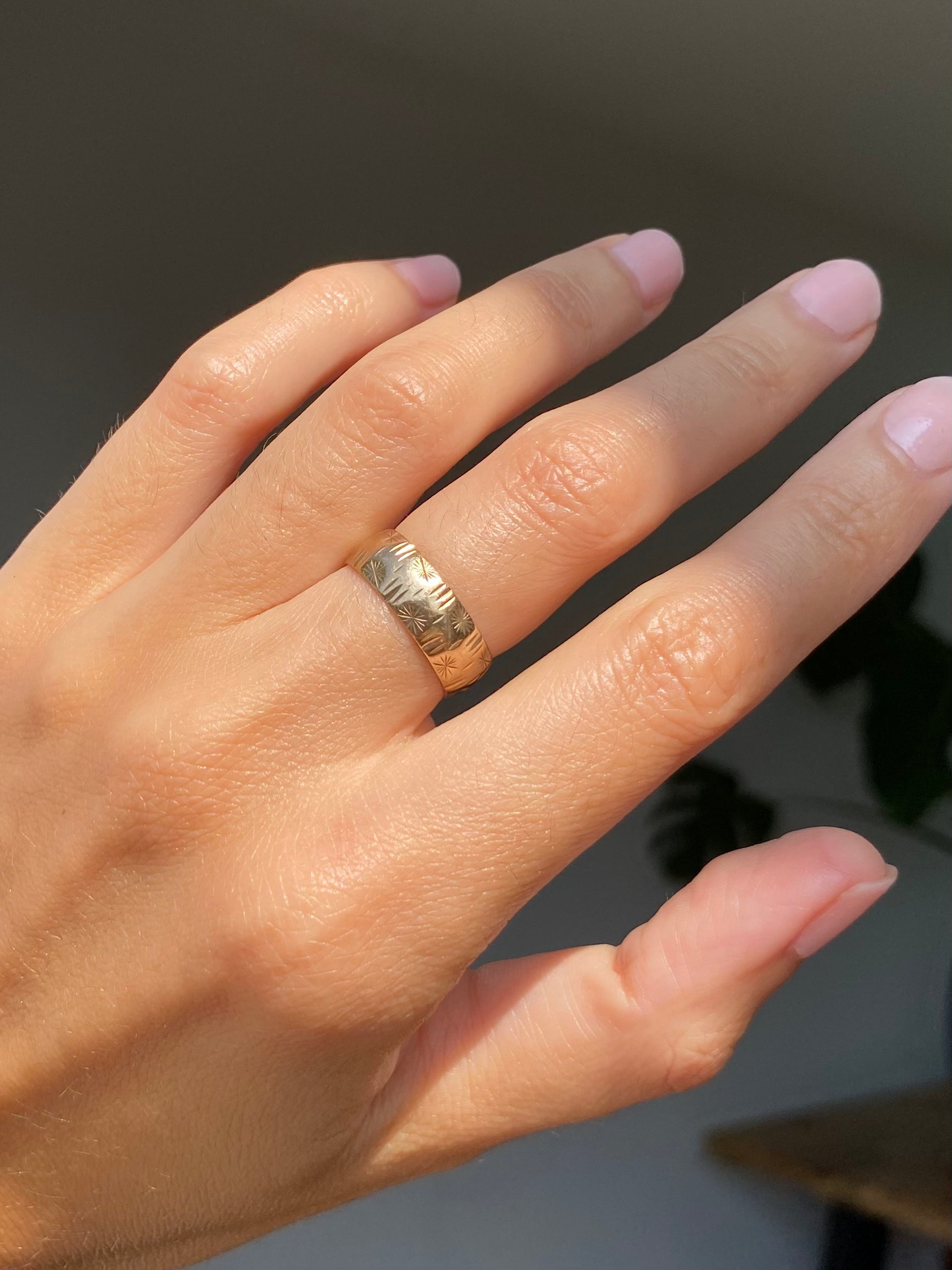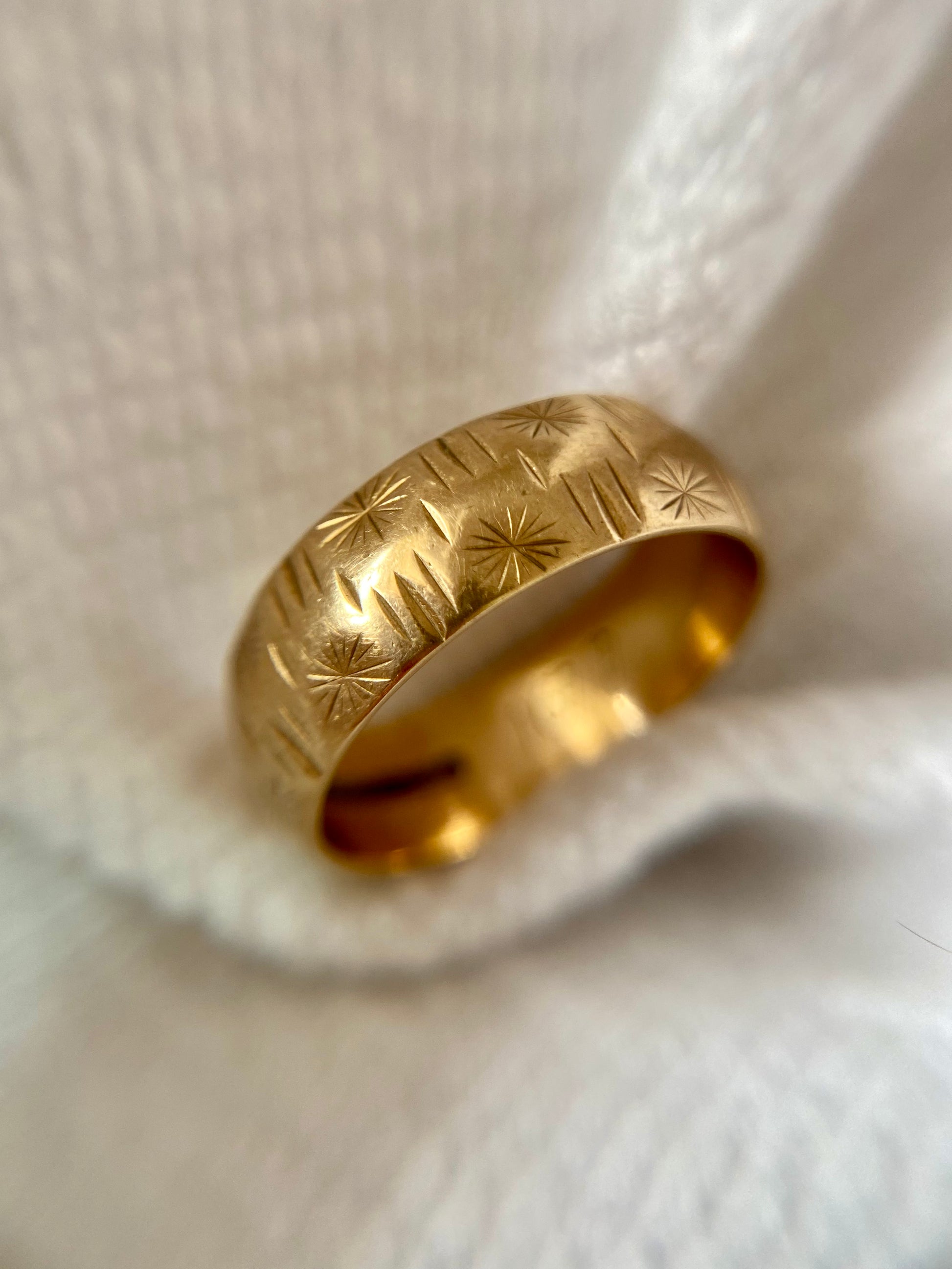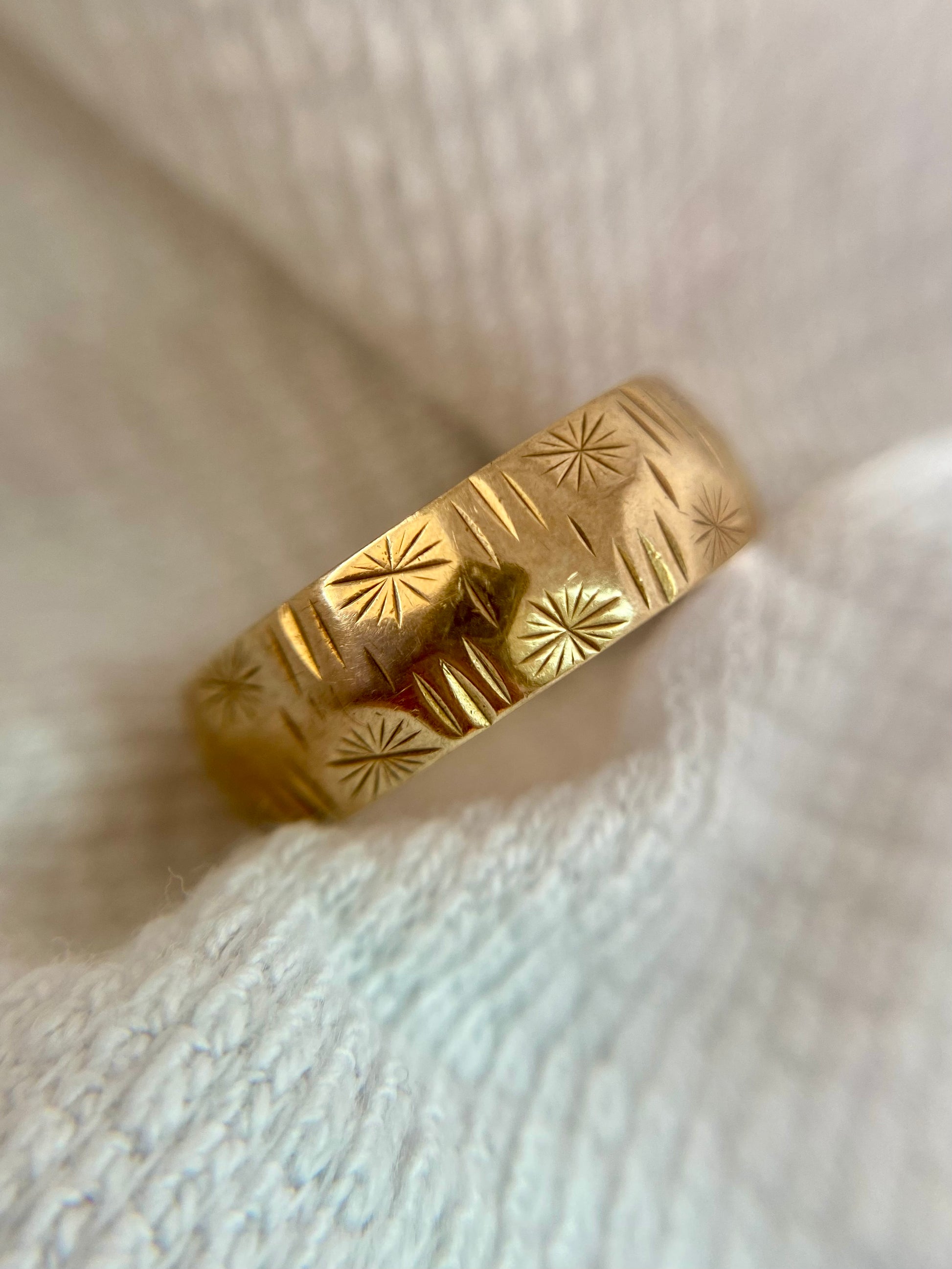 A beautiful vintage solid 9ct gold starry band. This ring sits low on the hand so is perfect for daily wear. It has a starry pattern all the way around.