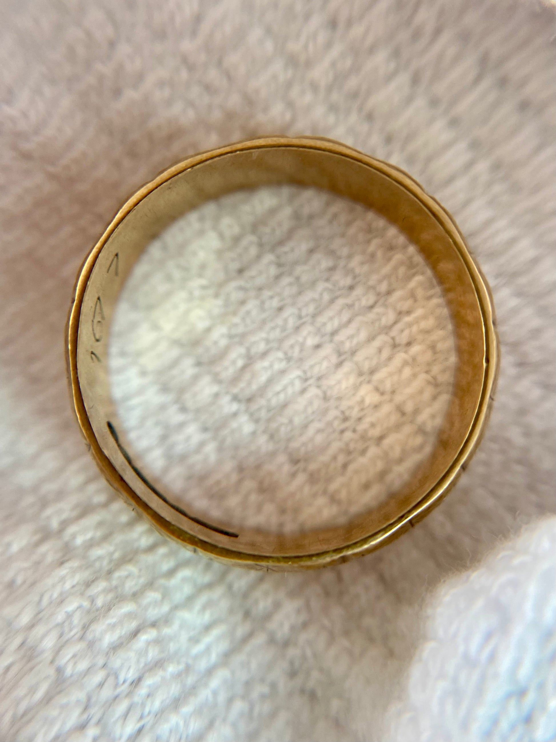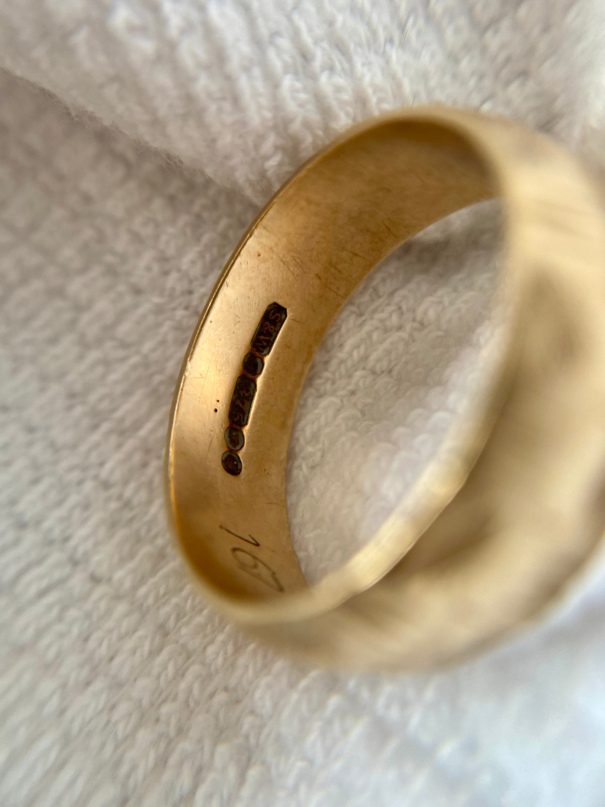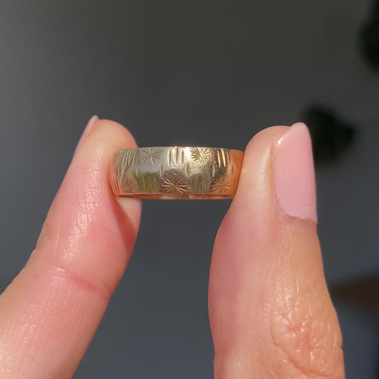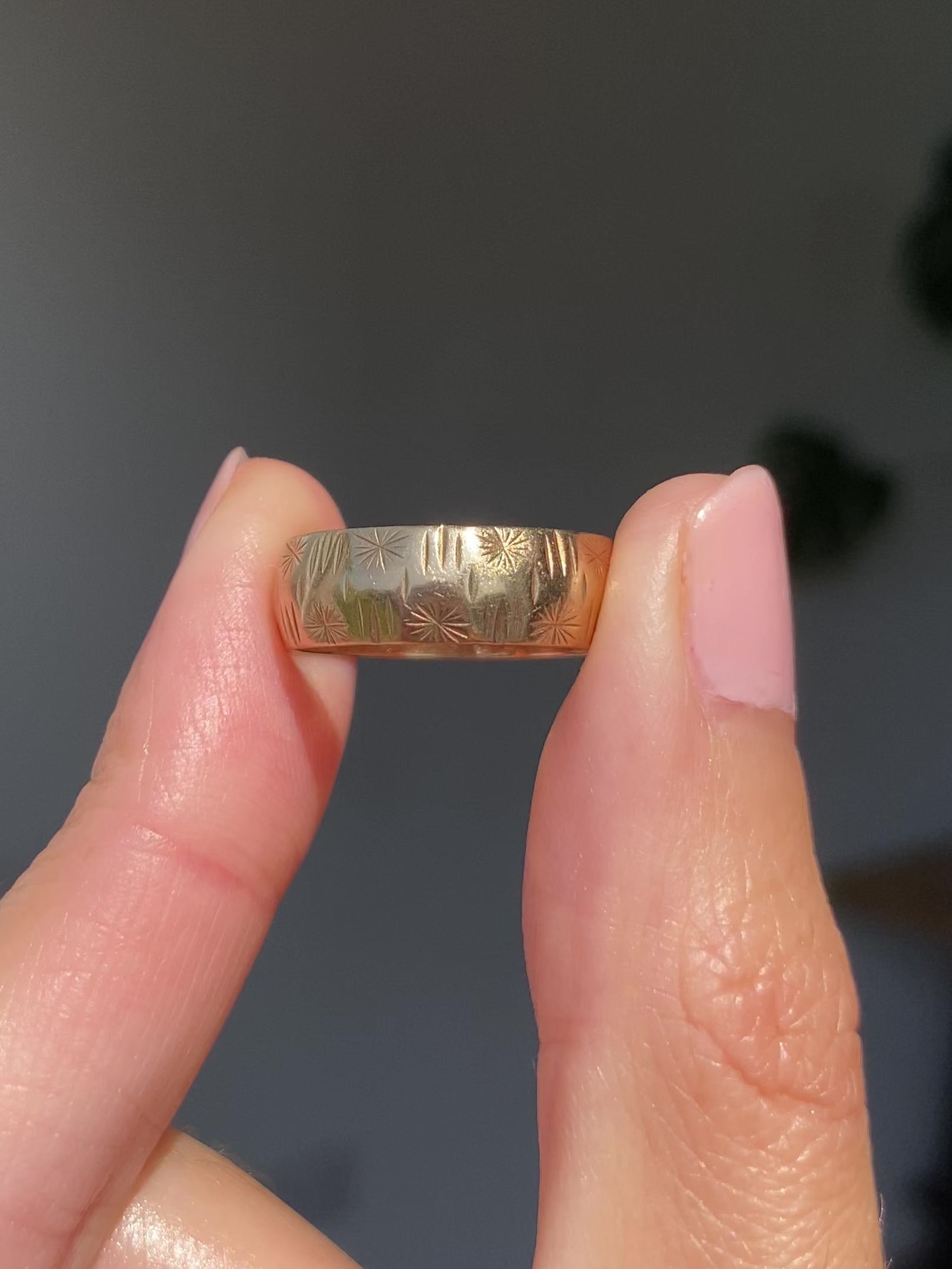 A beautiful vintage solid 9ct gold starry band. This ring sits low on the hand so is perfect for daily wear. It has a starry pattern all the way around.