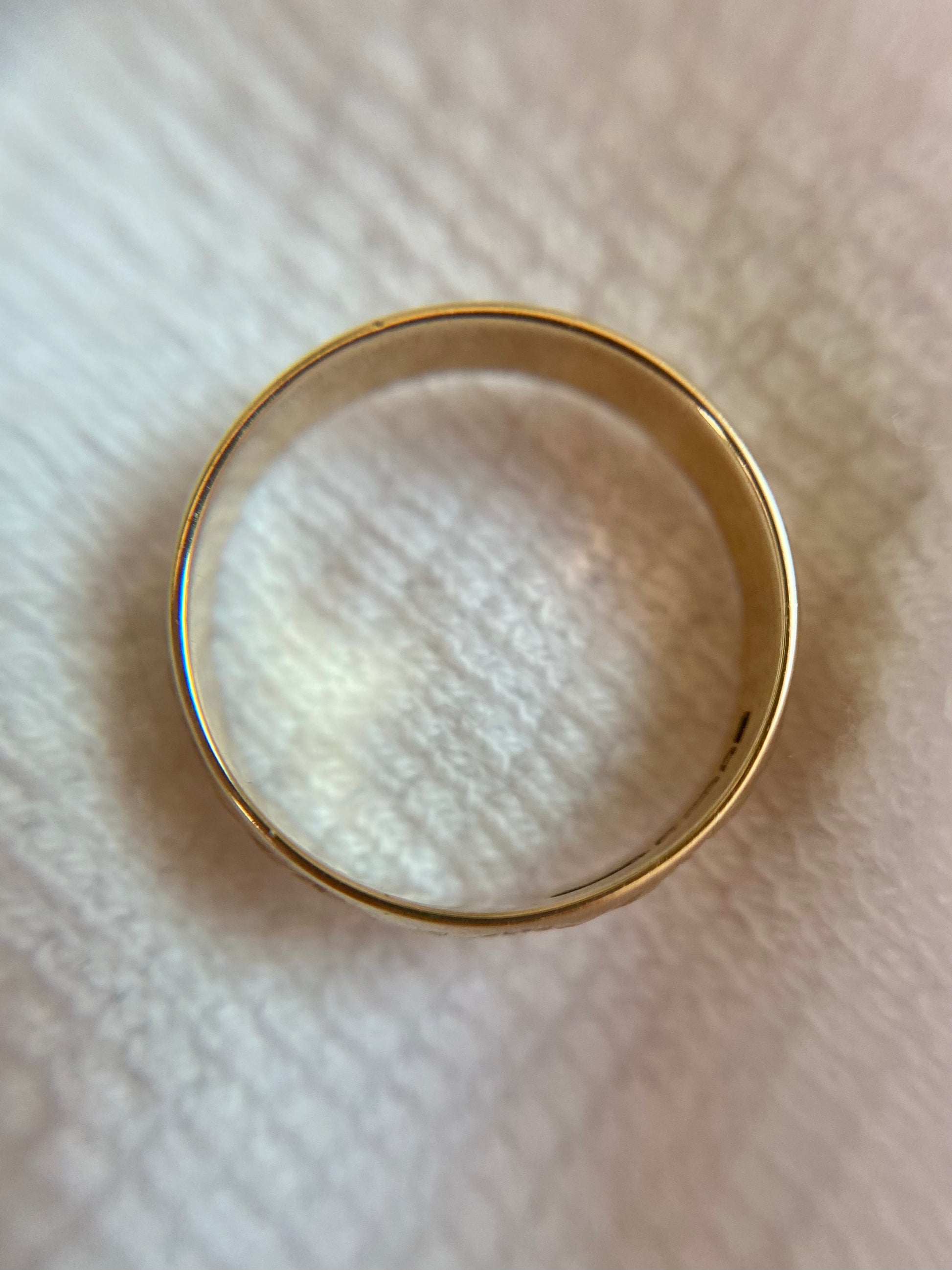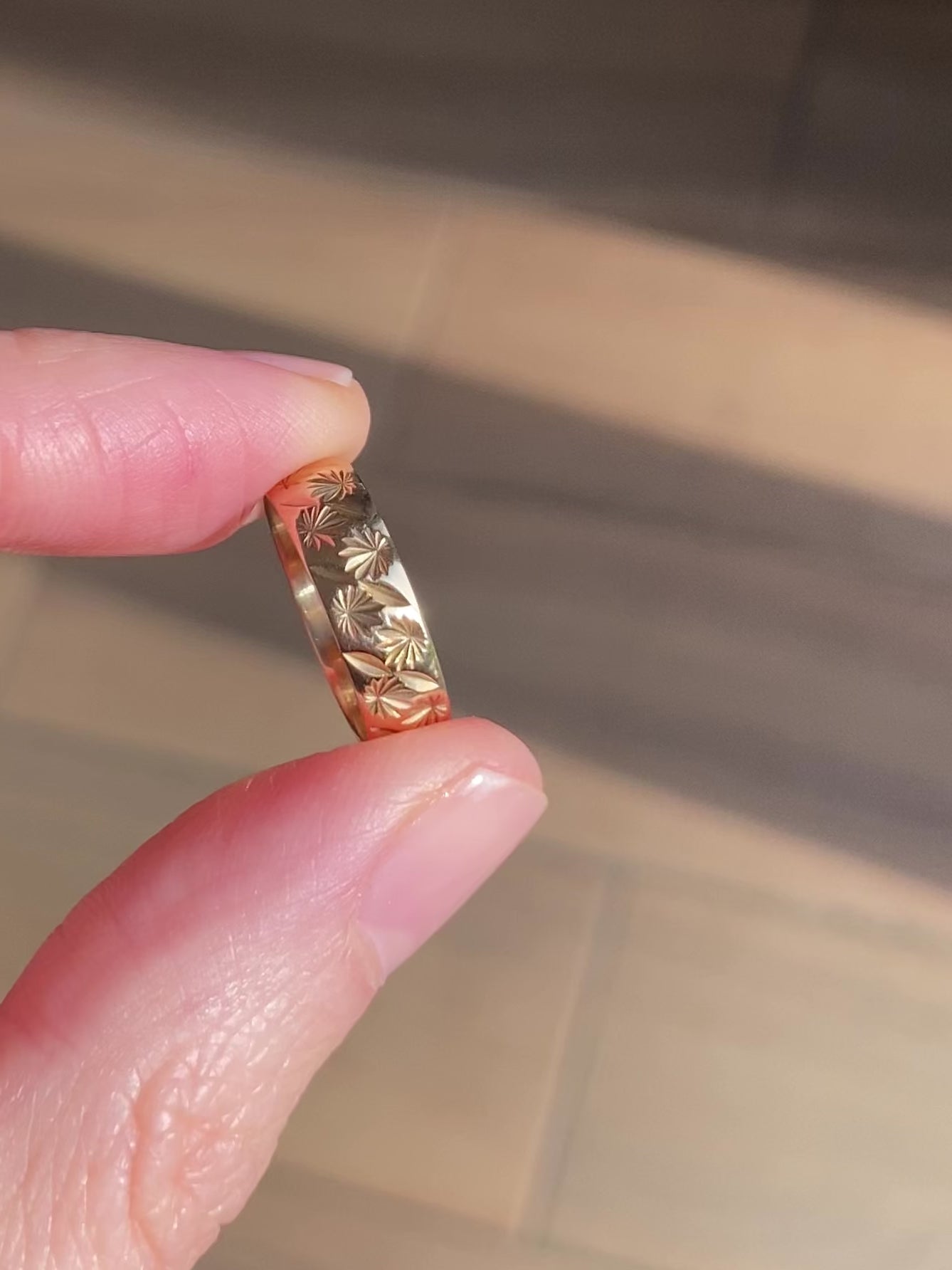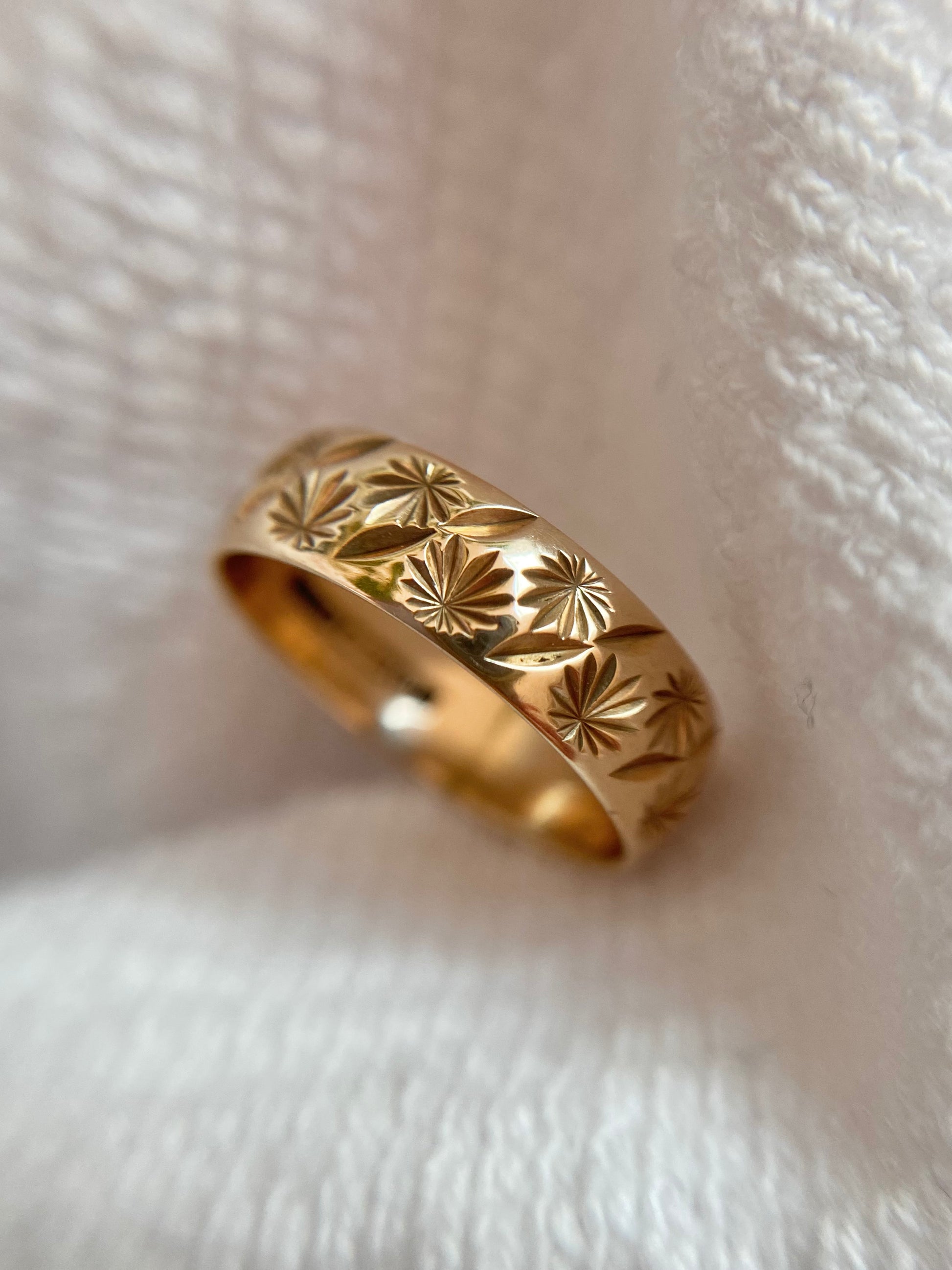 A pretty 9ct gold band. It has a carved starry pattern all the way around the outside of the band.