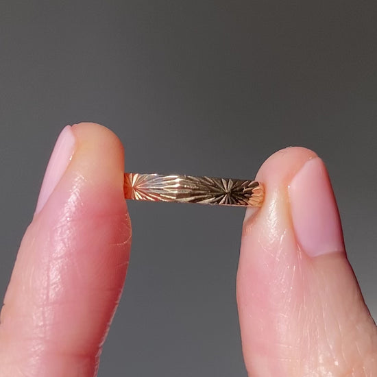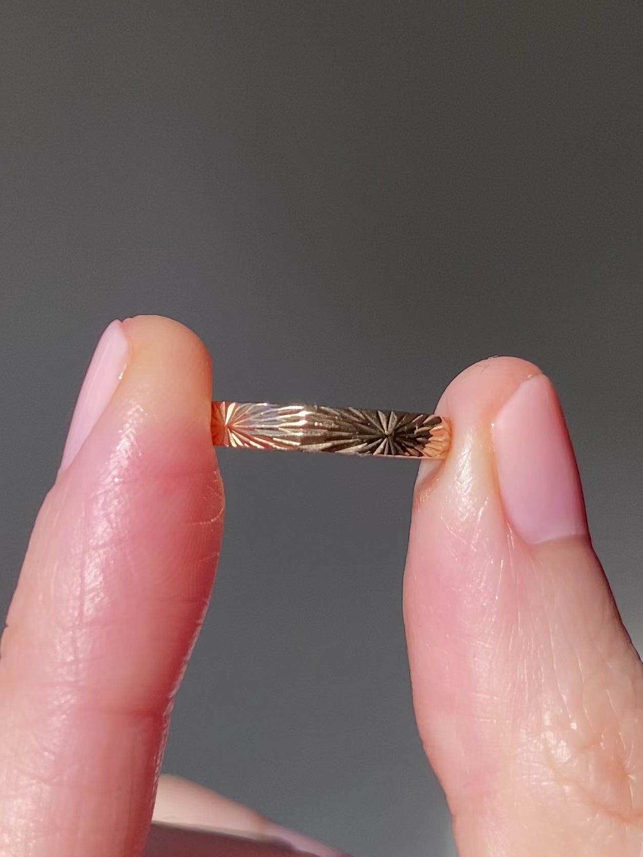 A vintage 9ct gold band. It has a pretty starry pattern all around the band.
