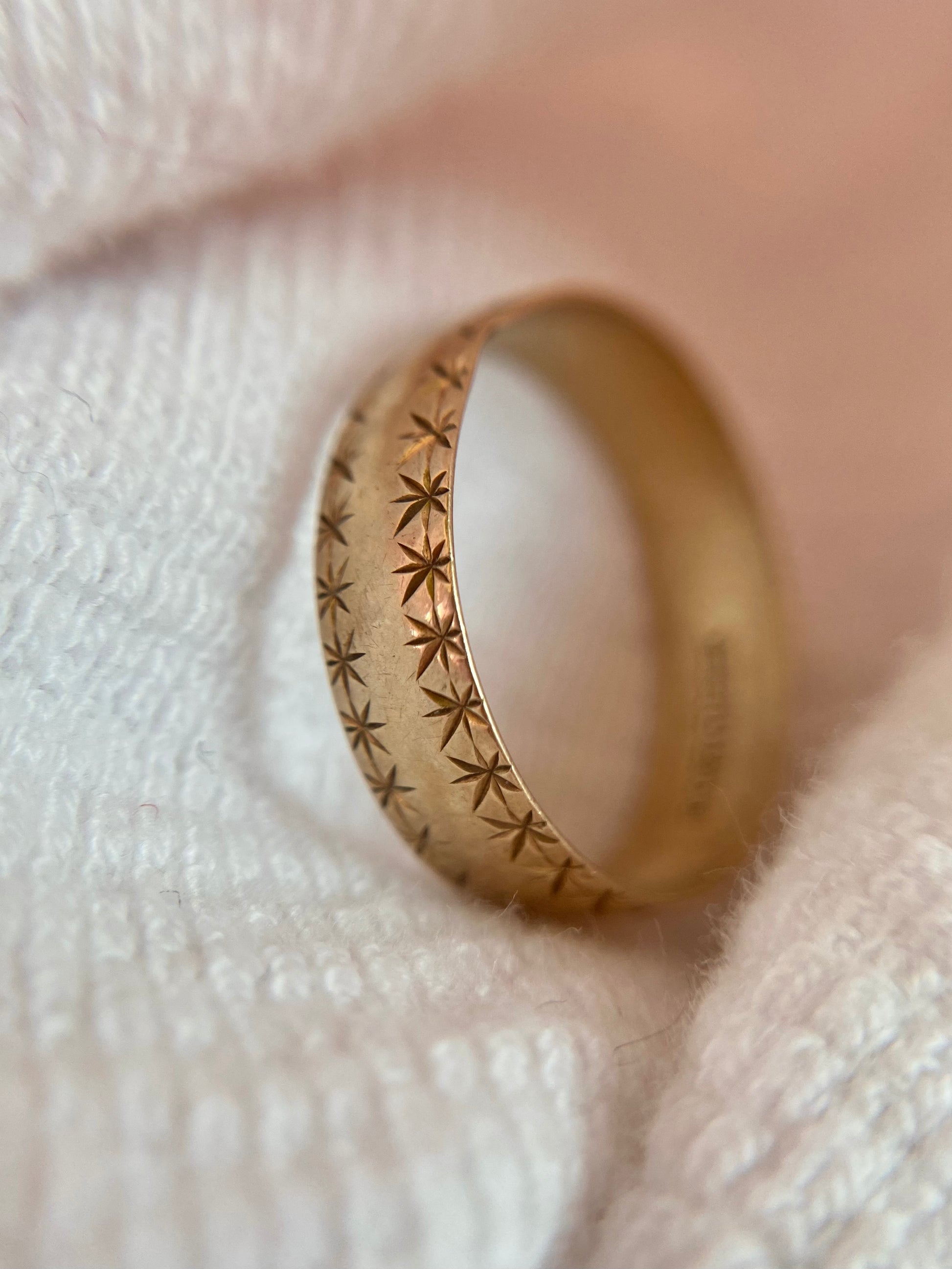 A pretty vintage 9ct gold patterned band with a starry pattern all along the edge.