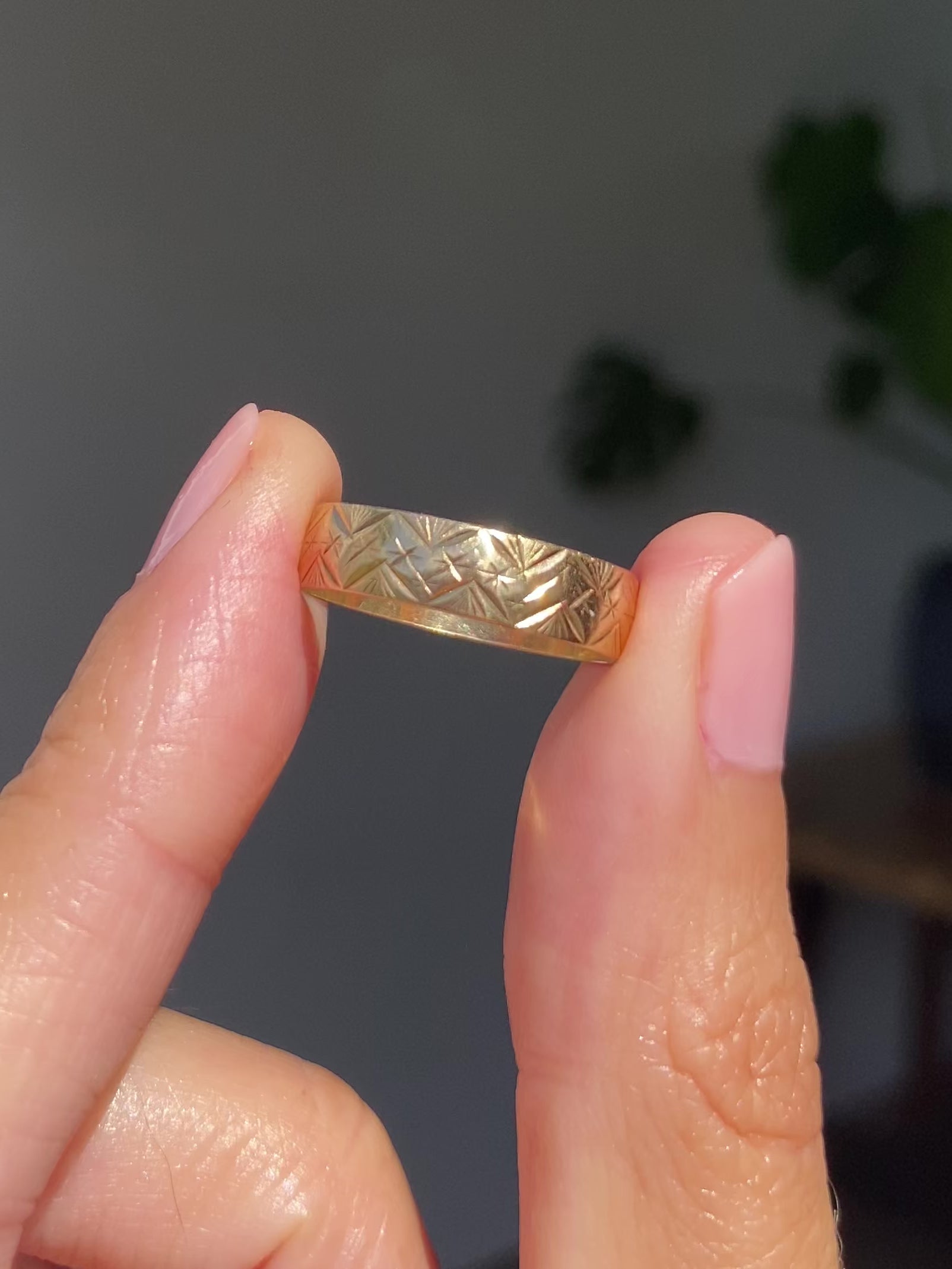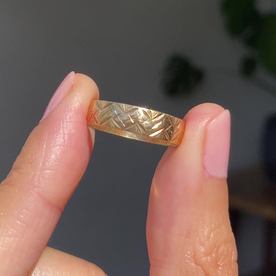 A beautiful vintage solid 9ct gold band with a zig zag starry pattern.